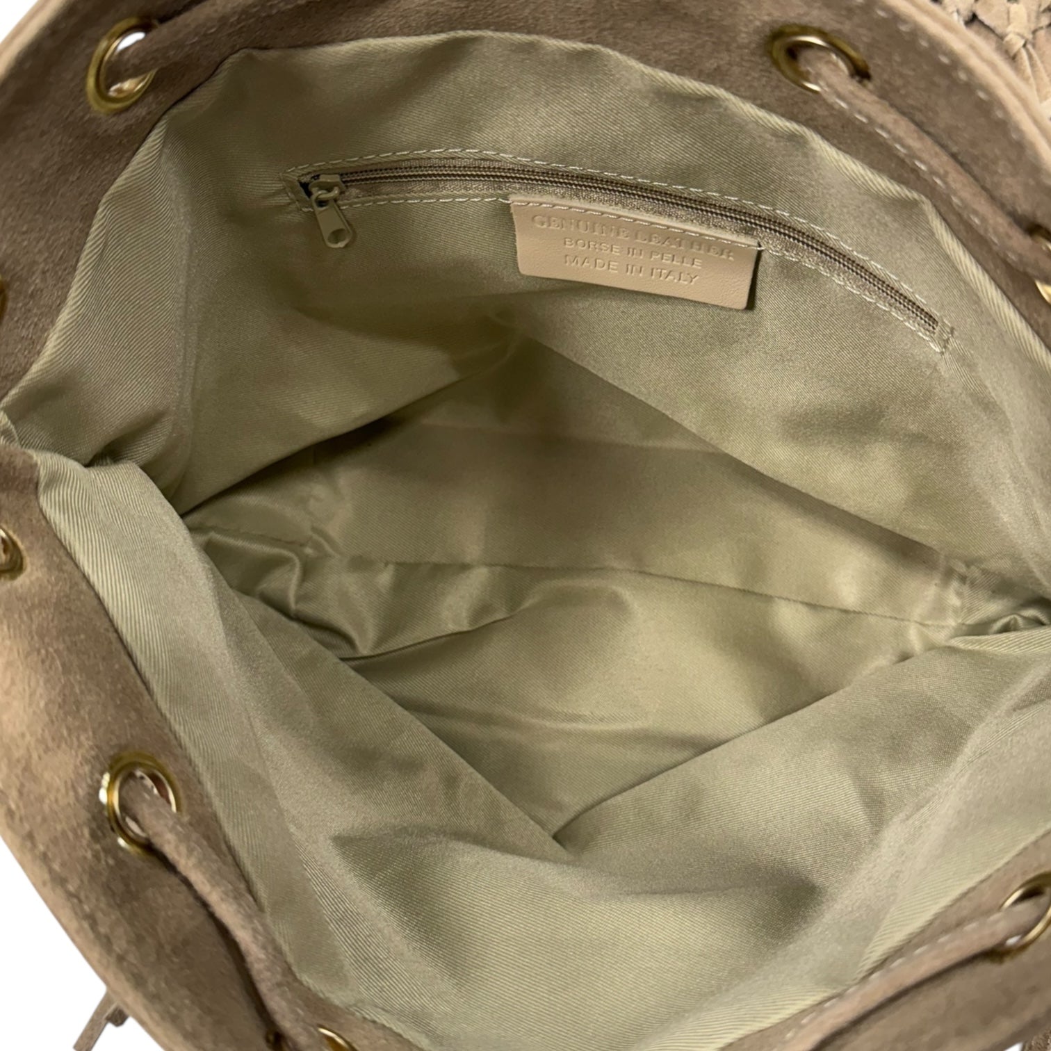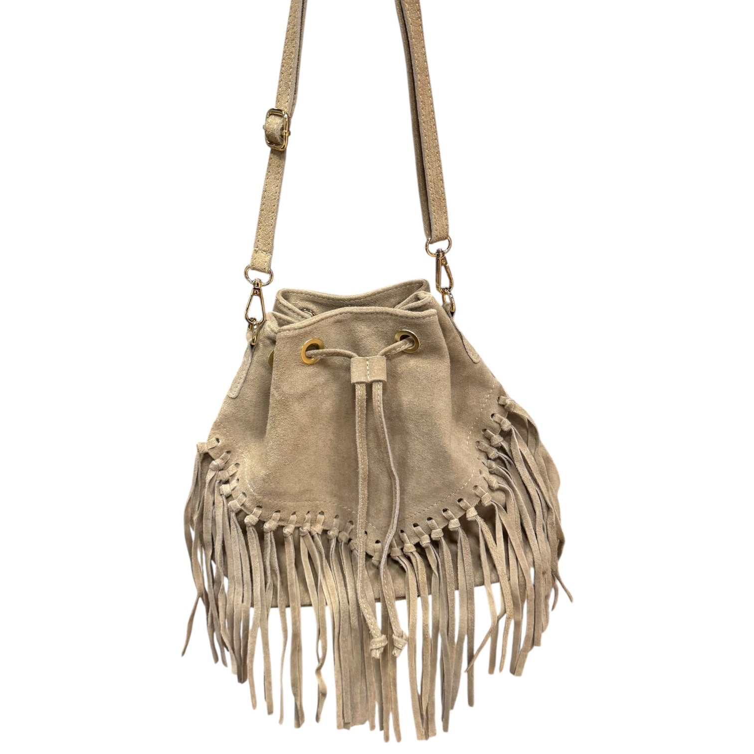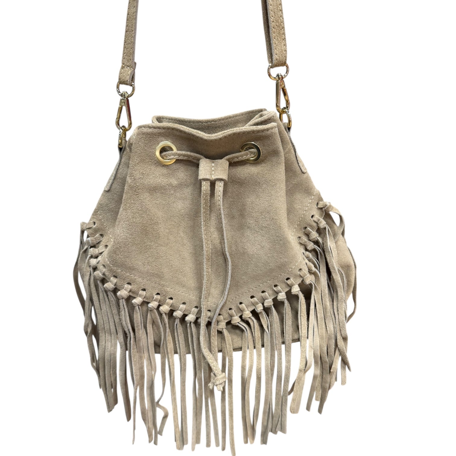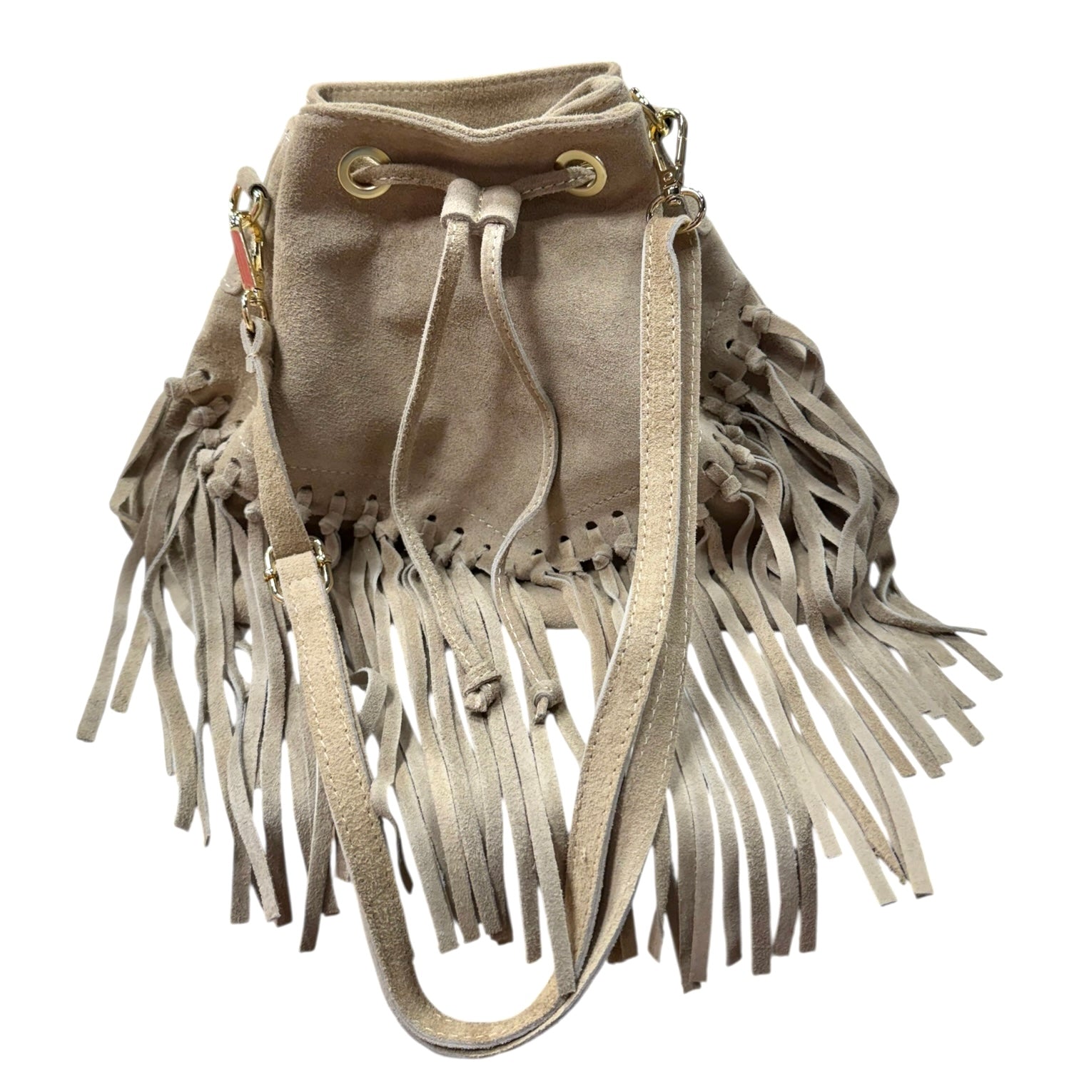 Taupe Suede Fringe Bucket Bag