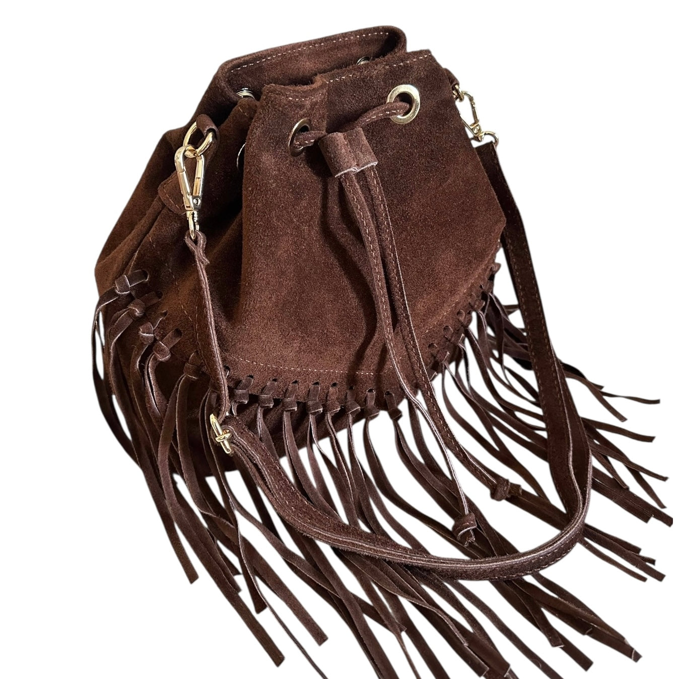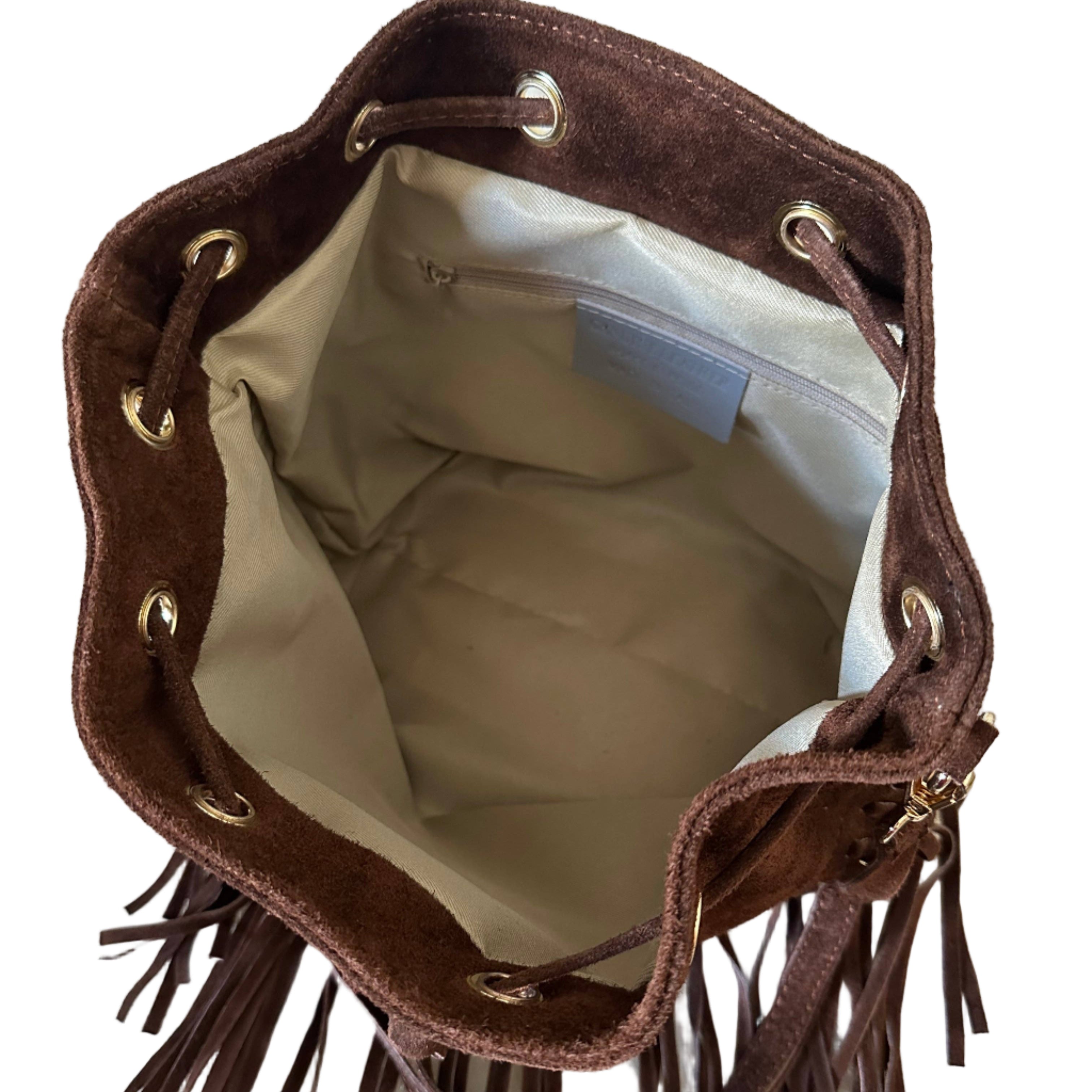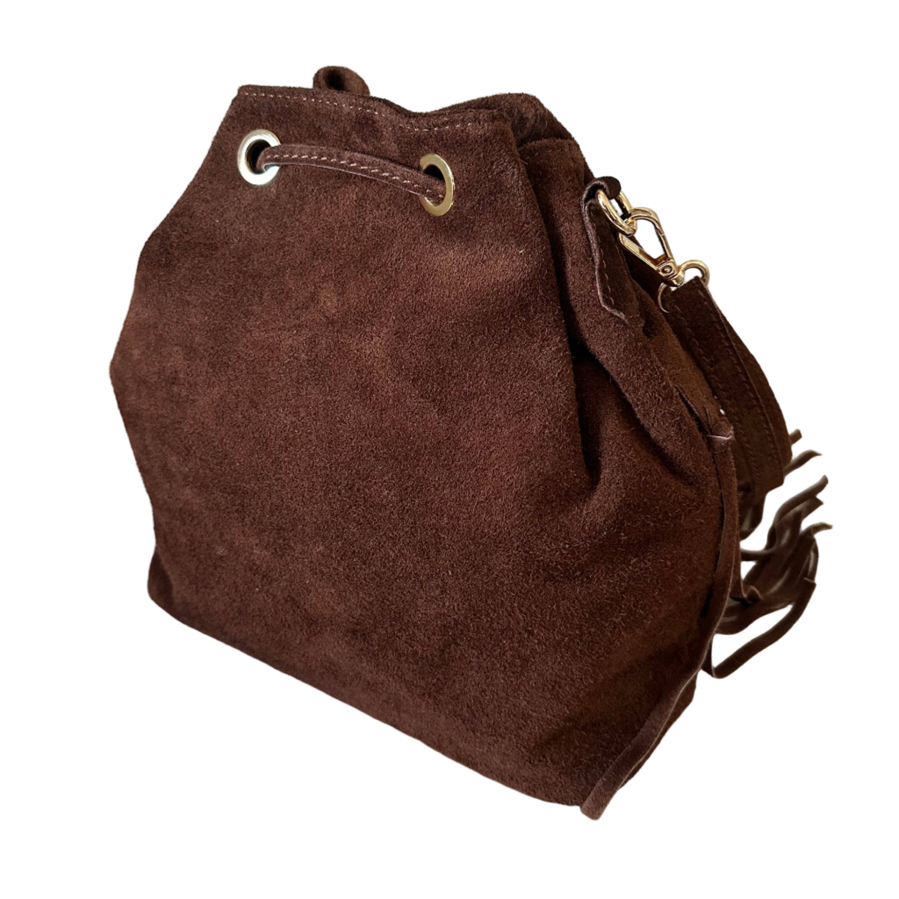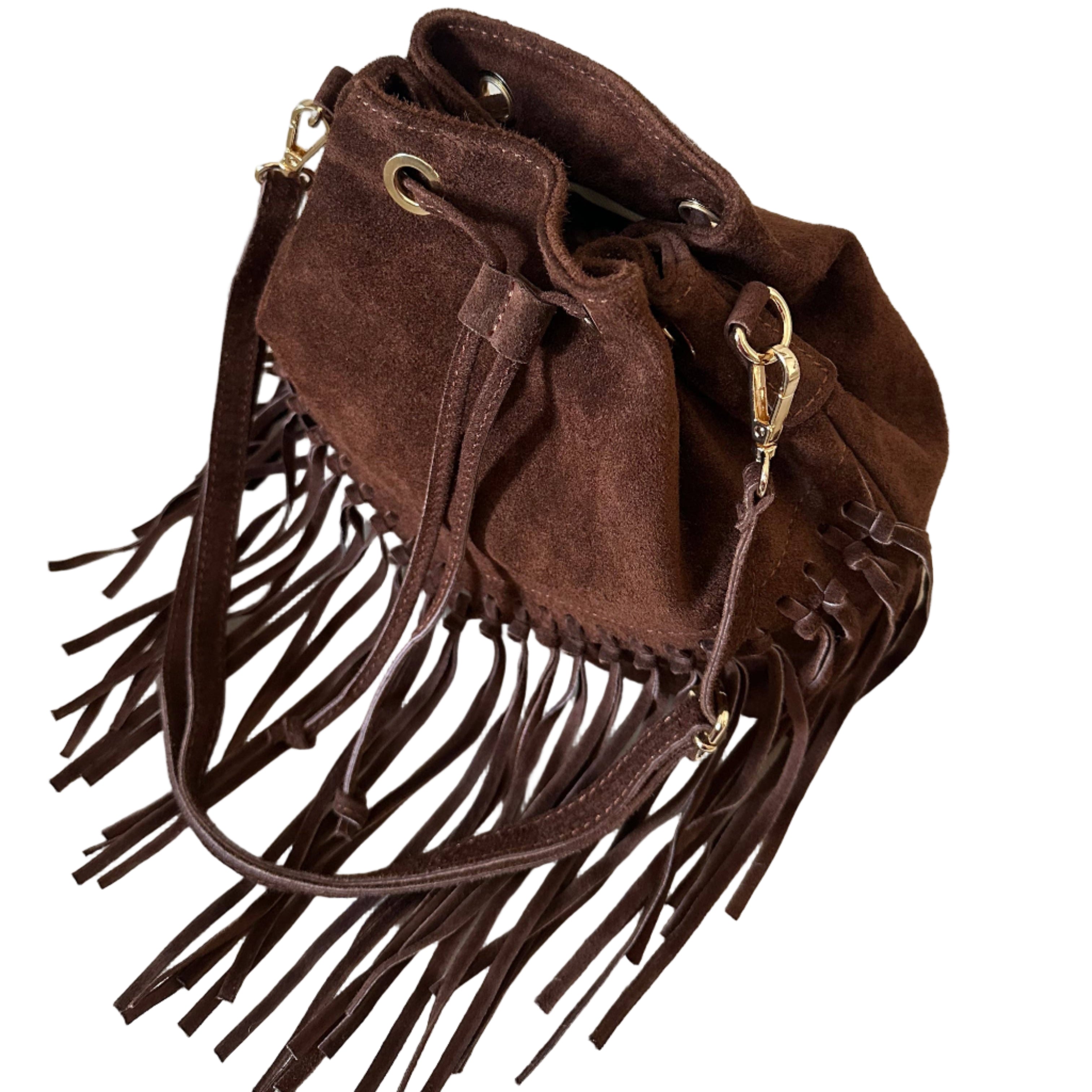 Brown Suede Fringe Bucket Bag