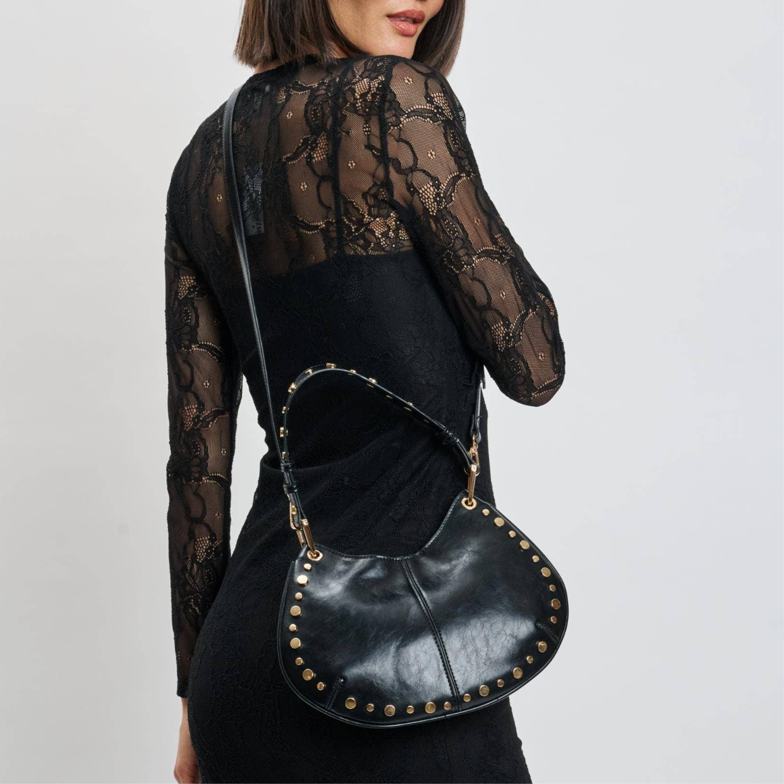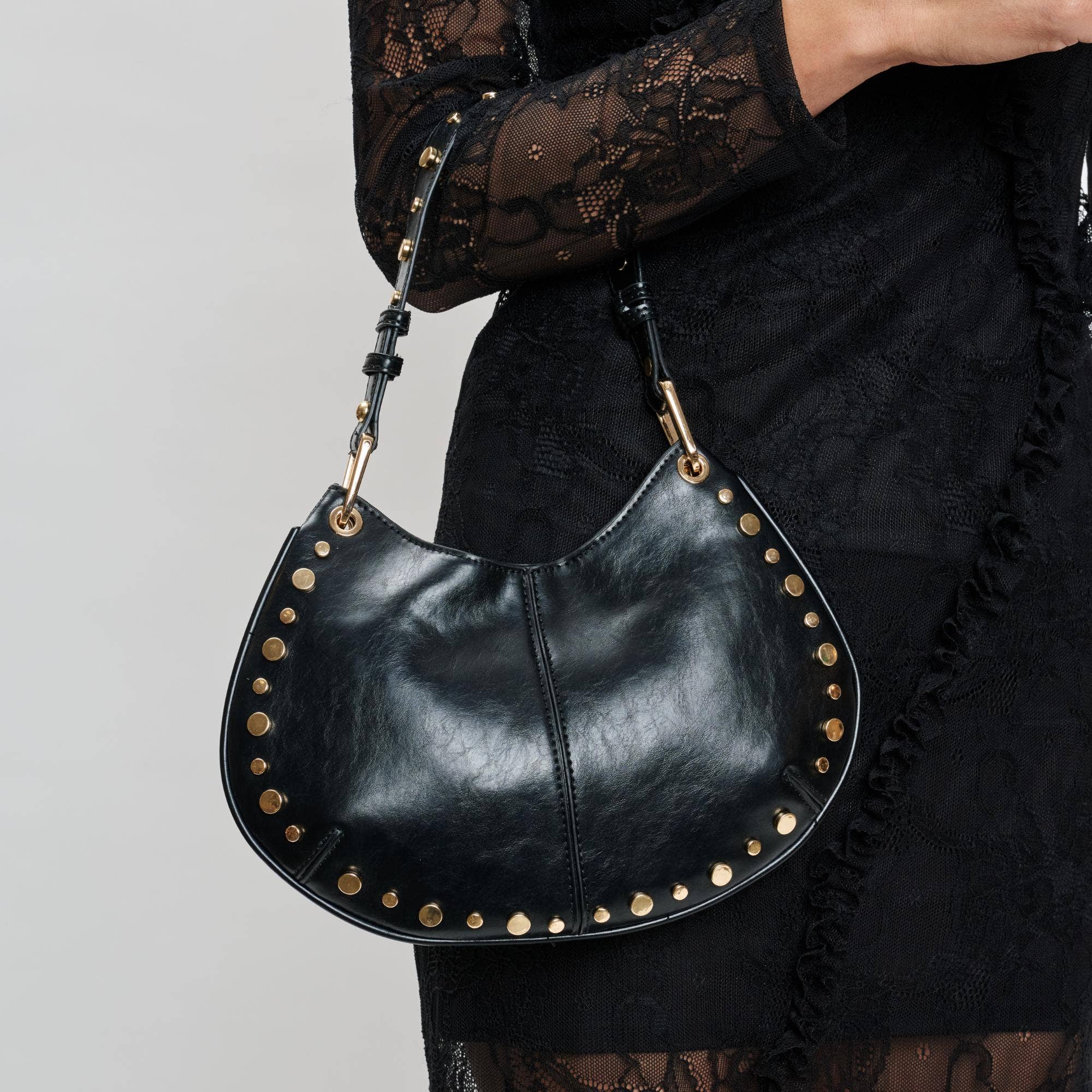 - Exterior Details: Stud Details, Adjustable/Detachable Crossbody Strap, Gold Hardware Interior Details: Fabric Lined, 1 Zip Pocket, 1 Slip Pocket