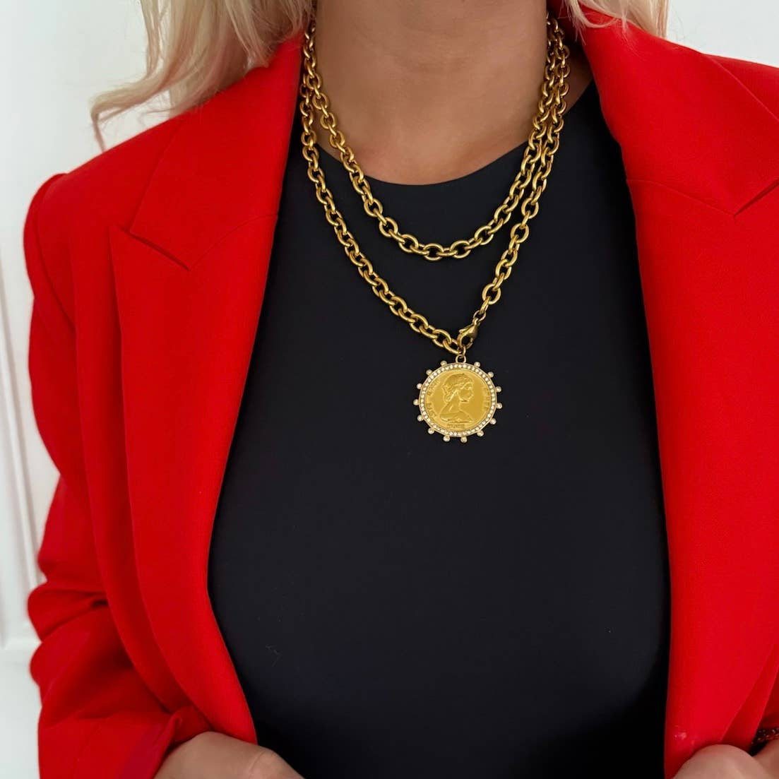 The ultimate statement coin necklace. The Goddess features an oversized medallion on an adjustable chain — bold, chic, and water-resistant. Wear it solo or layer it with dainty chains. 💫✨