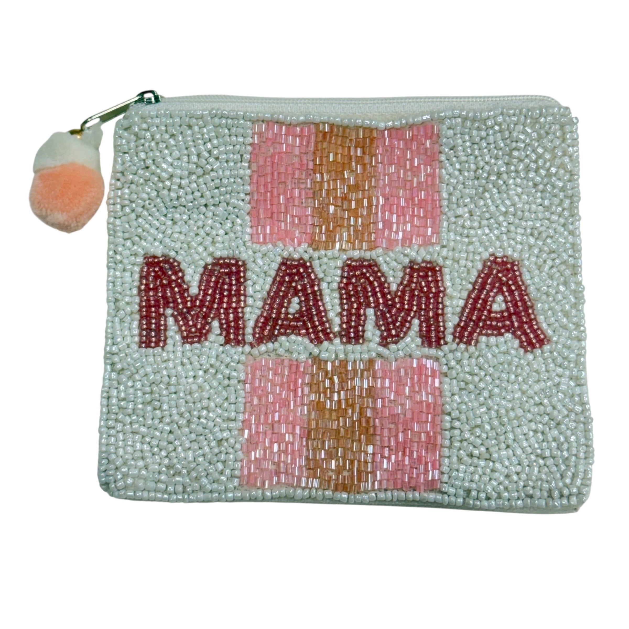 A fun way to celebrate mama 💗 This pink striped beaded coin pouch is handmade with detailed beadwork and finished with a playful pom-pom zipper. Cute, functional, and giftable.