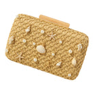Chic, structured, and dripping in resort elegance. This gold minaudière features faux pearls and shell detailing with polished gold hardware for a timeless coastal feel. Designed with a 23” detachable crossbody chain and a secure magnetic frame closure. The perfect piece for weddings, summer events, and destination dinners. Dimensions: 7.5” L x 1.75” W x 4.75” H