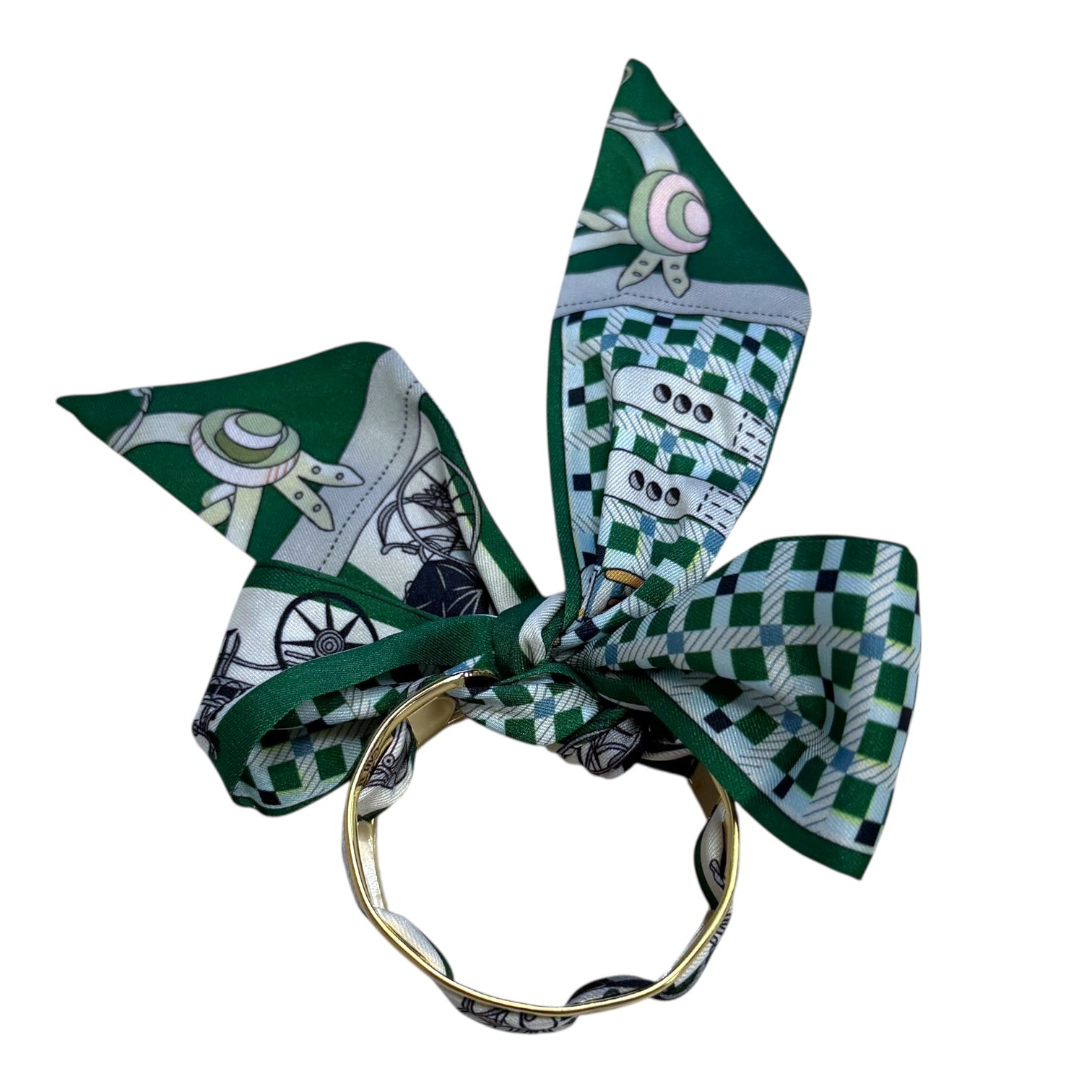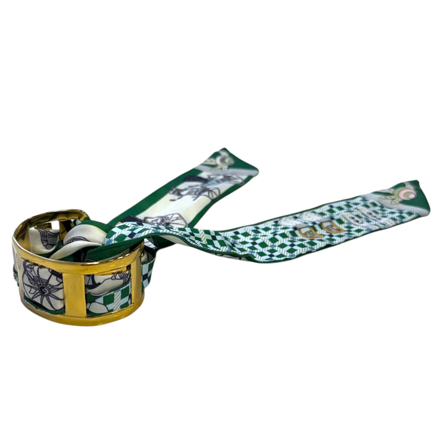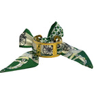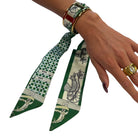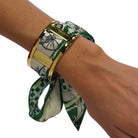 Classic meets cool in the Wyatt scarf cuff. Featuring rich green tones, an equestrian-inspired print, and sleek gold hardware, this statement accessory delivers effortless, designer-style polish. 💚✨