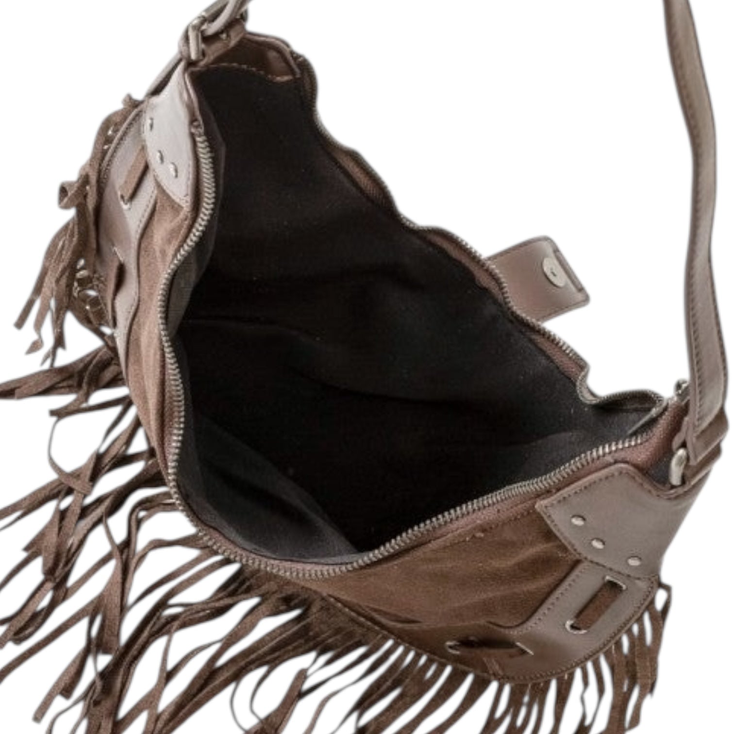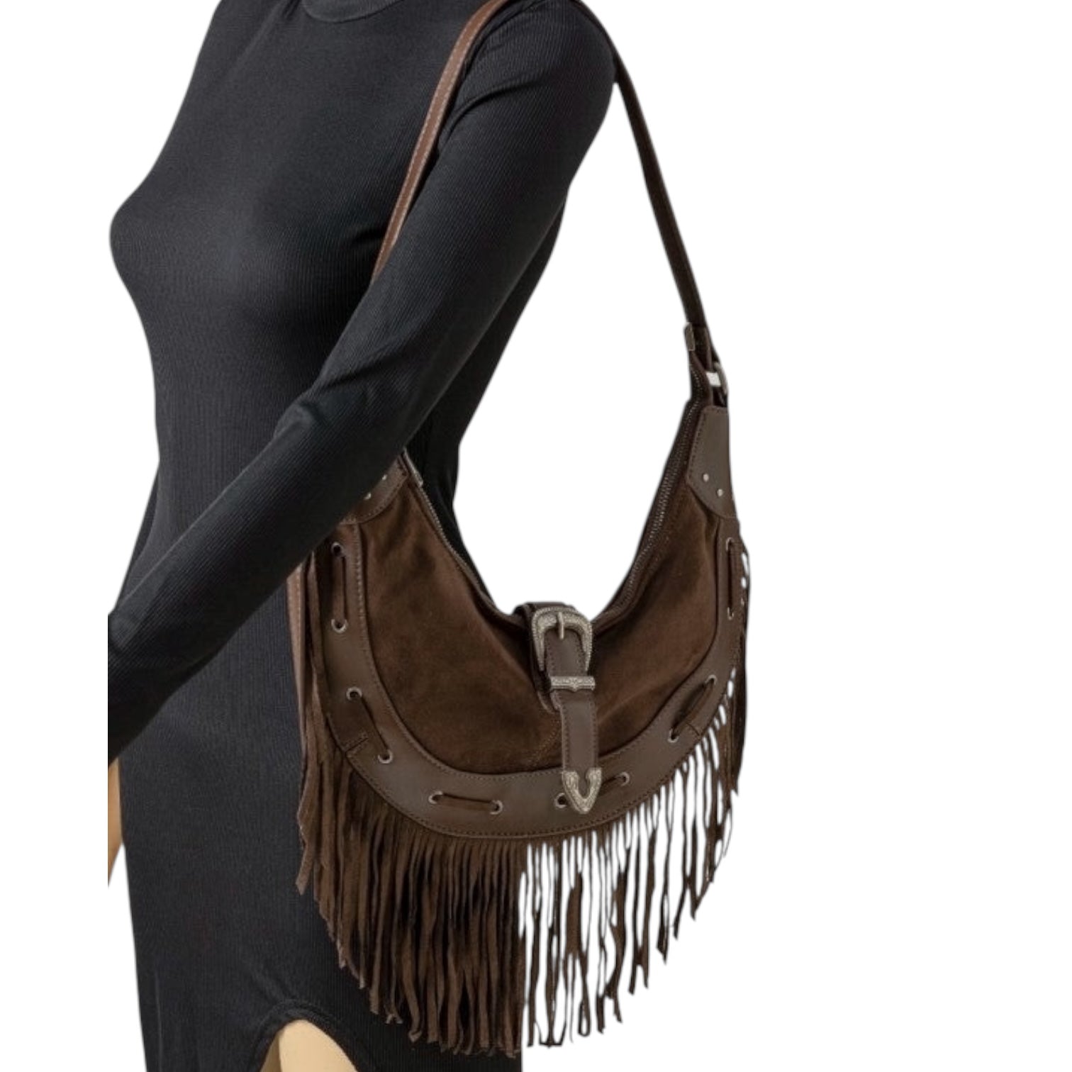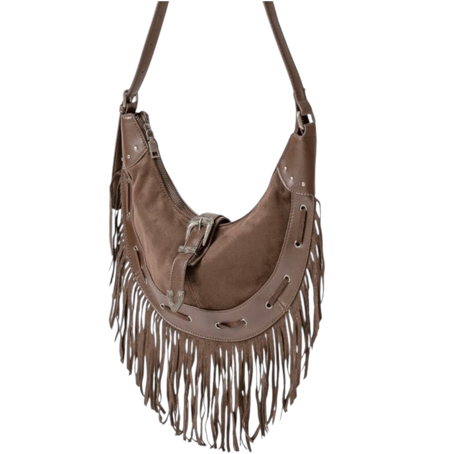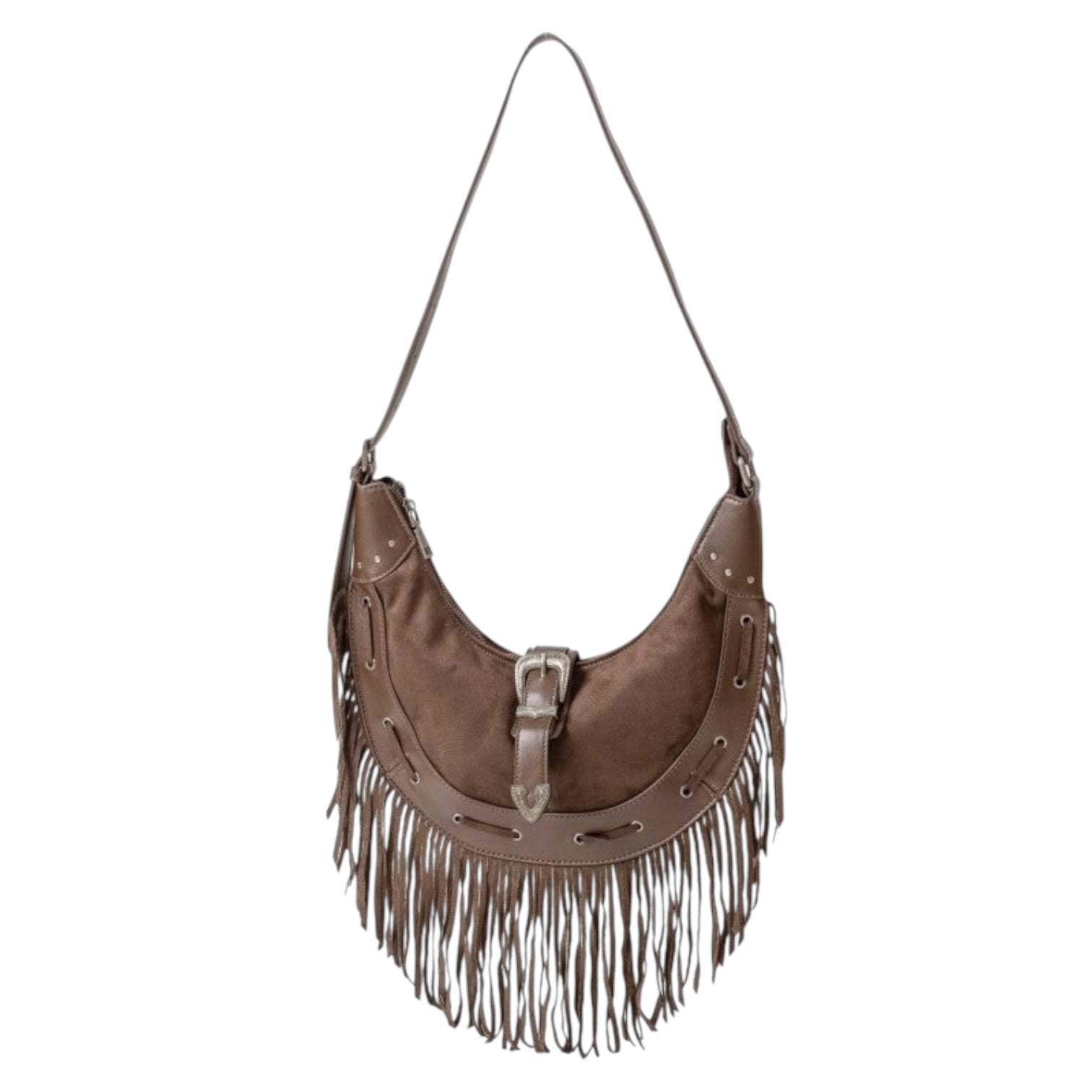The Fringe Hobo Shoulder Bag is a statement-maker with edge. Crafted in faux leather and detailed with bold fringe and belt accents, this slouchy hobo bag blends functionality with free-spirited glam.