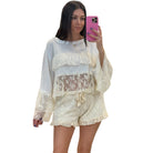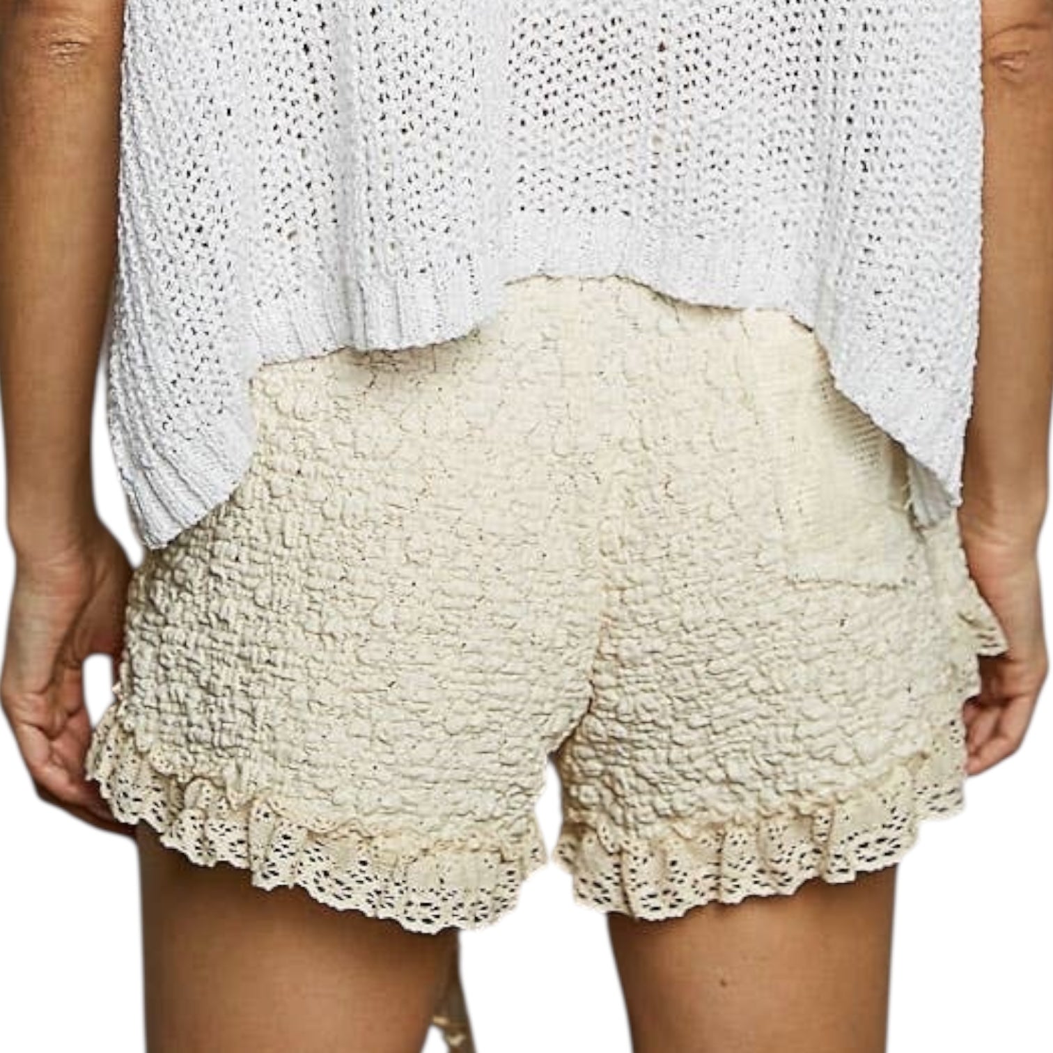Pretty meets comfy 🤍 These textured knit shorts feature an adjustable drawstring waist, soft relaxed fit, and delicate lace trim for a feminine touch. Lightweight and breezy, they’re the perfect lounge-to-street piece for warm days or cozy weekends. Chic, easy, and always flattering.