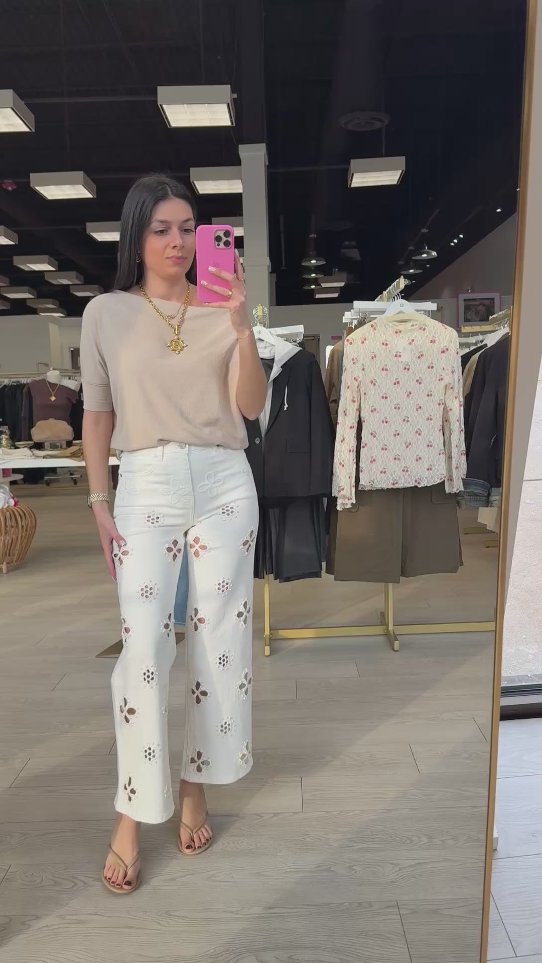 These are not your basic white jeans 🤍 A high-rise fit with a straight-leg silhouette, finished with delicate pearl-trim floral cutouts for that extra wow factor. Crisp, clean, and seriously chic — they bring a soft statement to spring days, summer nights, and everything in between ✨ Feminine without being fussy, cool without trying too hard.