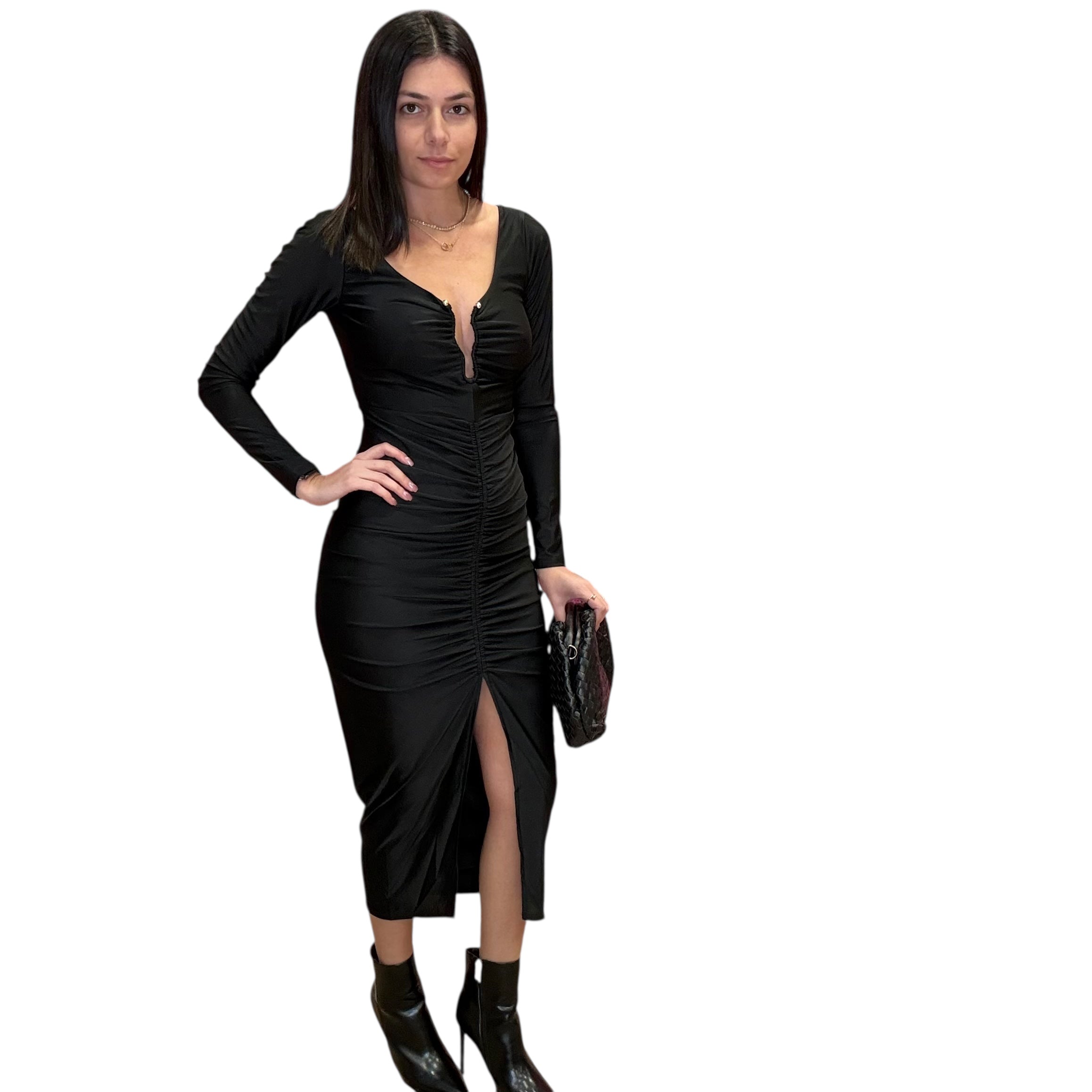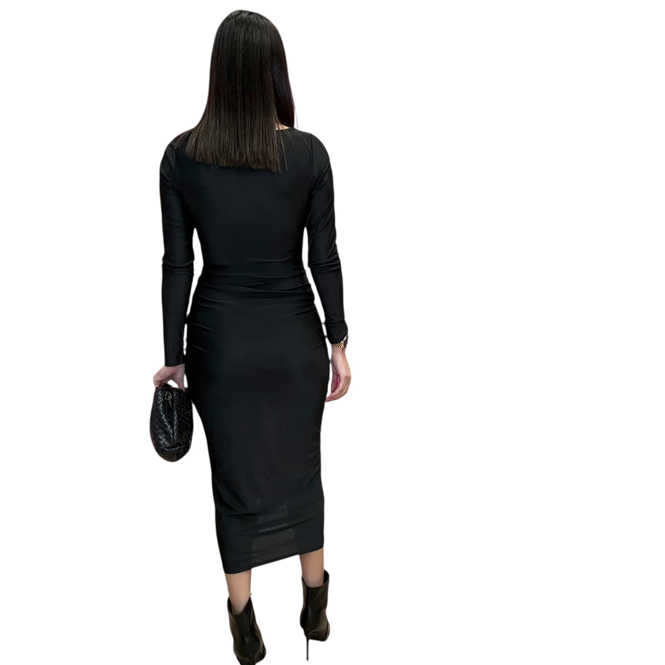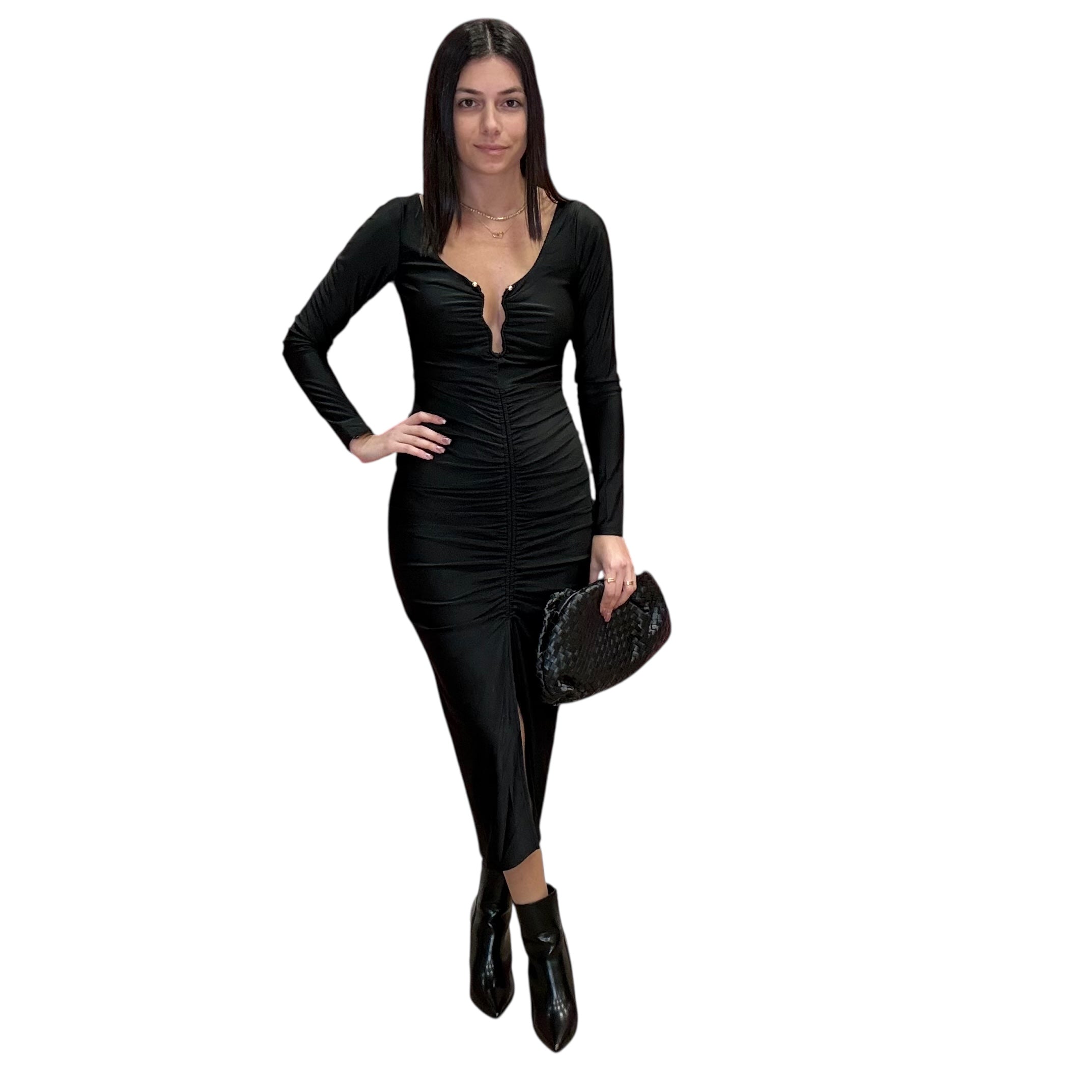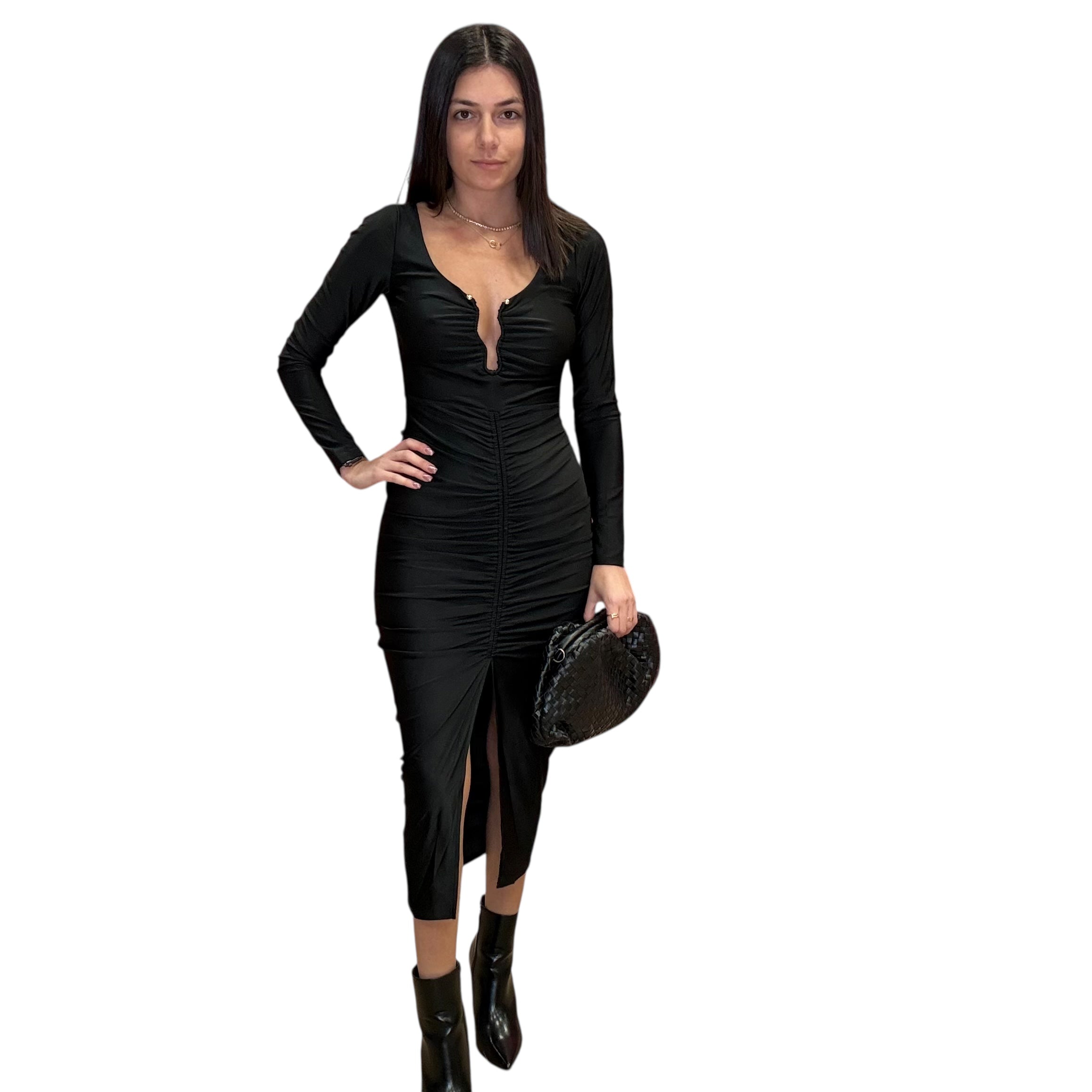 Your go-to black midi just got an upgrade 🖤 This deep V-neck silhouette with shirring detail and a sultry front slit gives effortless glam. Made with stretchy fabric for the perfect fit that feels as good as it looks.
