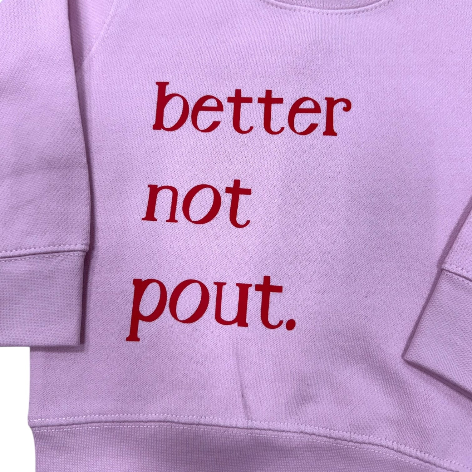 Keep the holiday vibes fun with the Kids “Better Not Pout” Sweatshirt 🎄✨. Made from soft, cozy fabric in playful pink with bold red lettering, this festive pullover is perfect for holiday photos, parties, or just staying snug all season long.