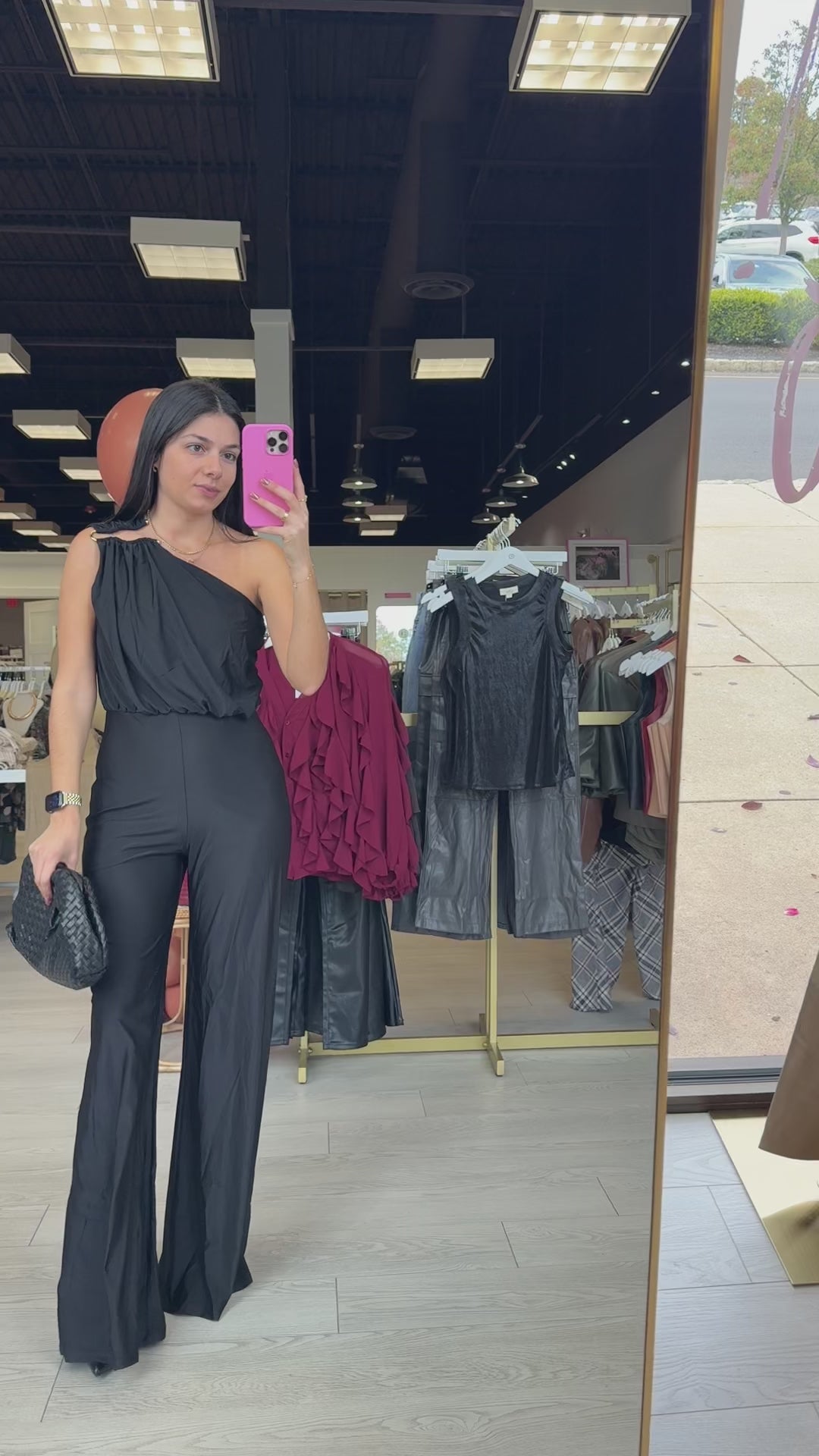 This one-shoulder jumpsuit serves sleek sophistication with a side of edge. Soft, stretchy fabric, wide legs, and a metal ring detail create a flawless all-in-one outfit.