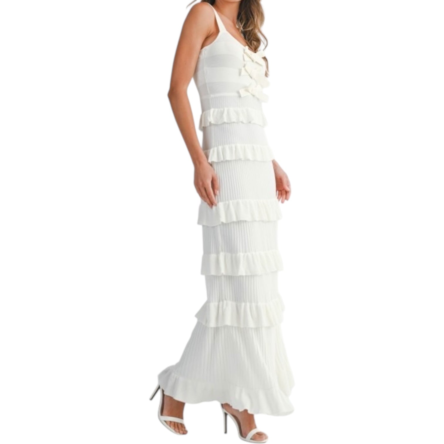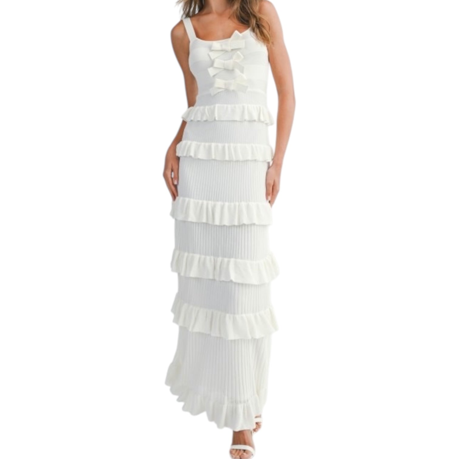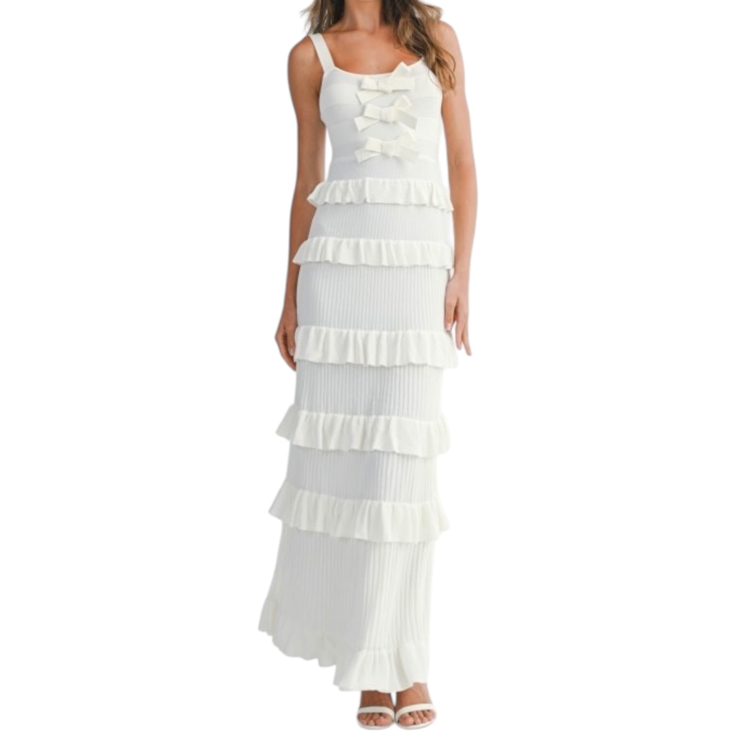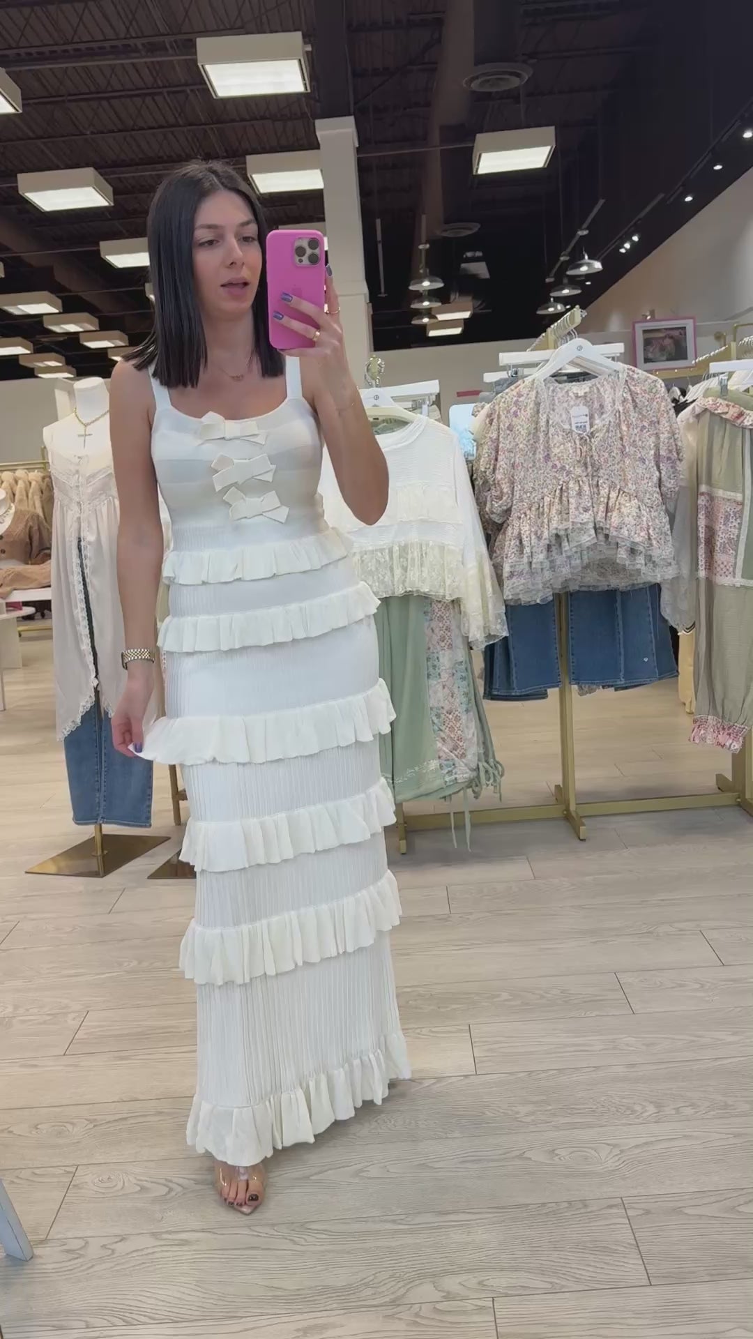 Soft romance meets effortless polish 🤍 This off-white knit maxi dress features a sleeveless silhouette with three delicate bow details along the front and a tiered ruffle bodice that flows beautifully with every step. Designed with a flattering bodycon fit through the top and finished with a lined interior for comfort and coverage. It’s the kind of piece that feels special but still easy — perfect for showers, graduations, engagement moments, or any event that calls for soft feminine energy ✨