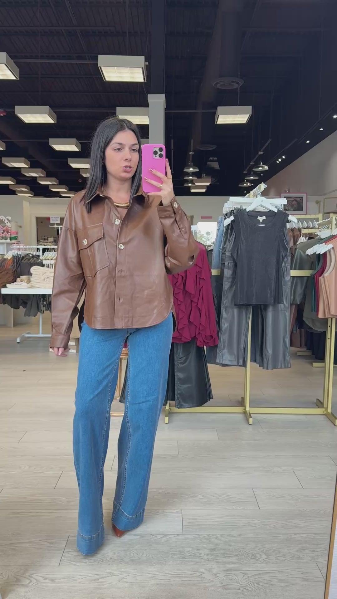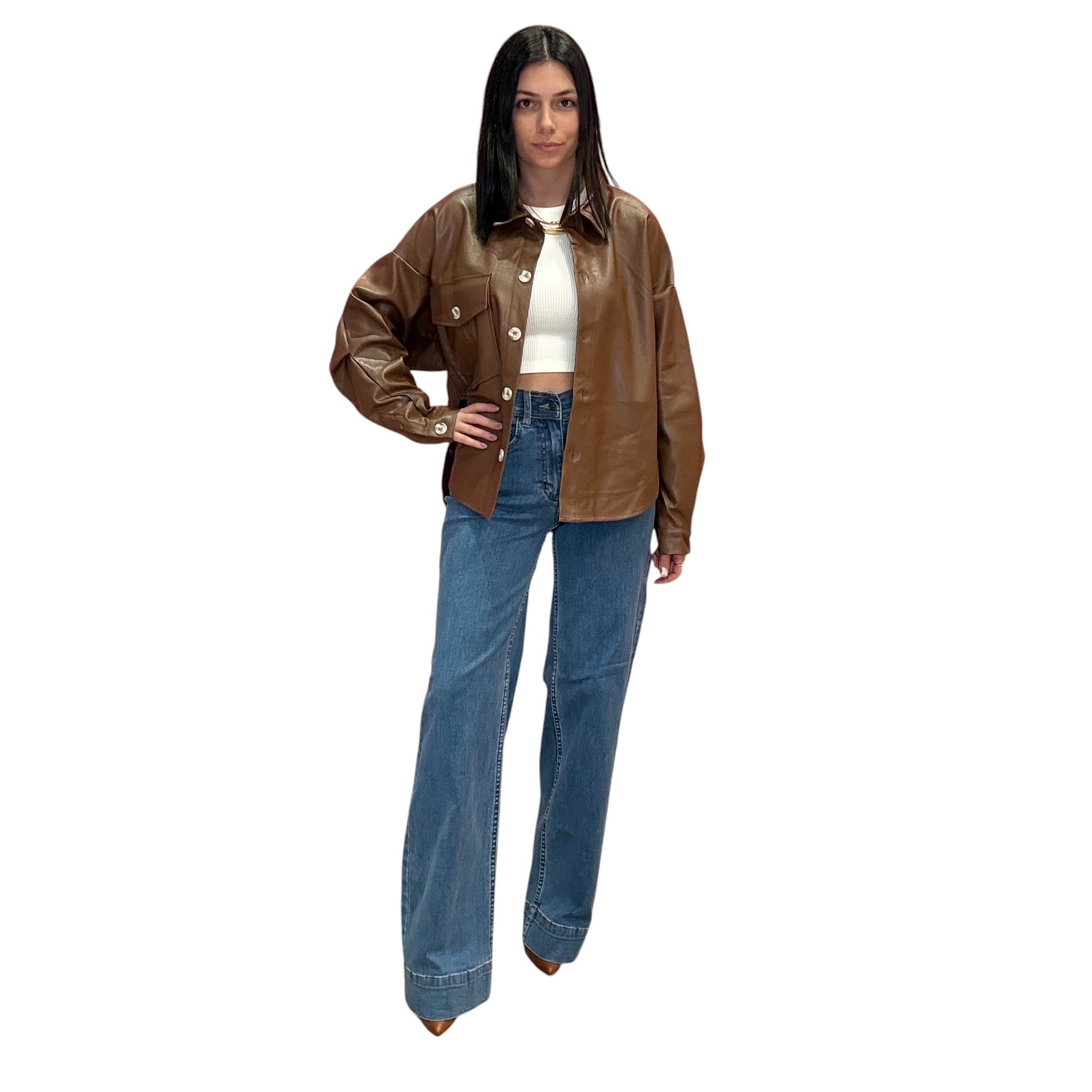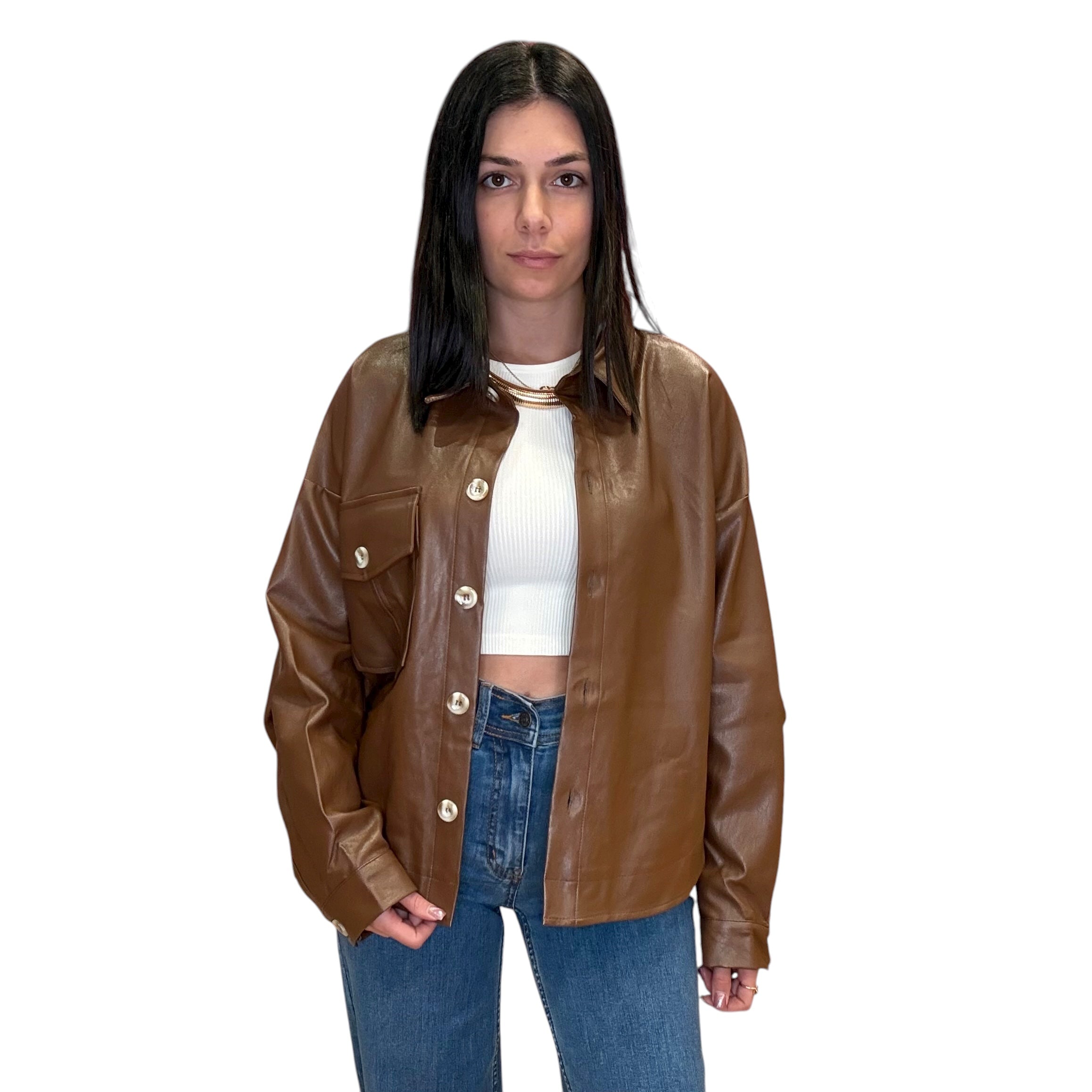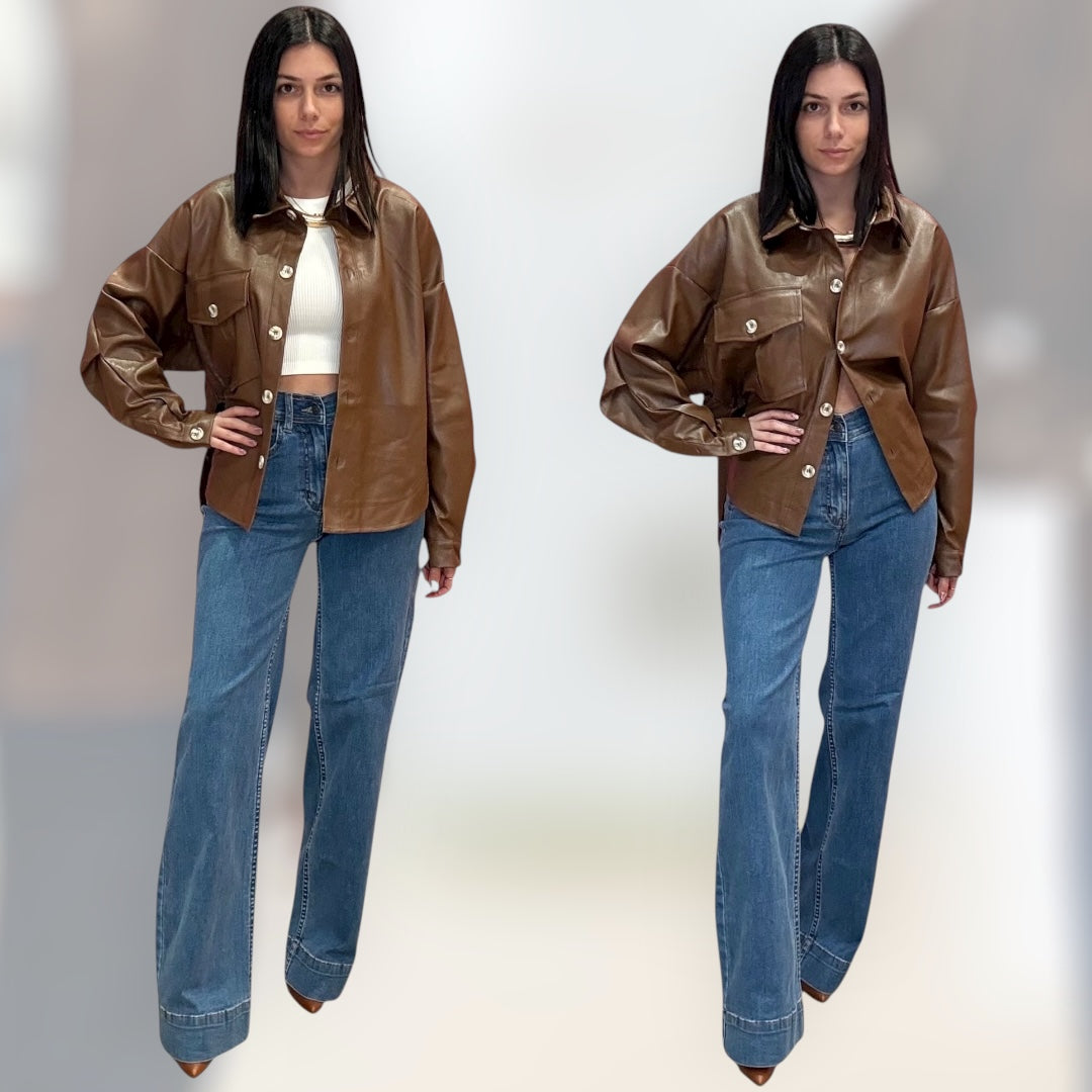 This luxe faux leather button-down brings major power-move energy. With a structured silhouette, long sleeves, and soft sheen, it’s your new go-to for day-to-night glam.