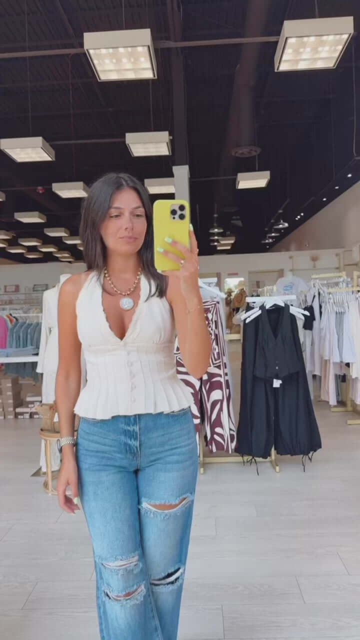 Cheers to chic 🥂 This champagne chiffon halter top features a flirty deep V neckline, ruffle trim, and button front detail. Lightweight, feminine, and perfect for date night or dressing up denim—she’s your go-to for that effortlessly pretty vibe.
