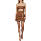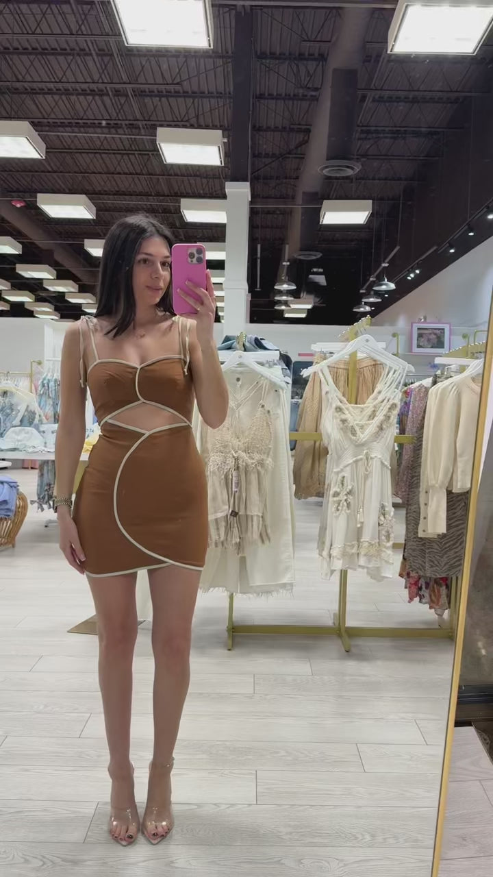 Sleek, bold, and effortlessly cool 🤎✨ This cognac and taupe mini dress features a body-contouring silhouette with striking contrast trim and subtle cutout details. It’s minimal but makes a statement — the kind of piece you wear when you want to look confident and put together in seconds. Perfect for dinners, date nights & events🤎