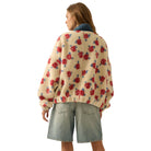 Cozy meets cute in this plush sherpa pullover. The soft cream base is covered in bold red and blue florals, finished with a contrast navy snap neckline that adds a touch of cool vintage charm. Easy to throw on for errands, travel, or lounging — this one’s the definition of comfy-chic.