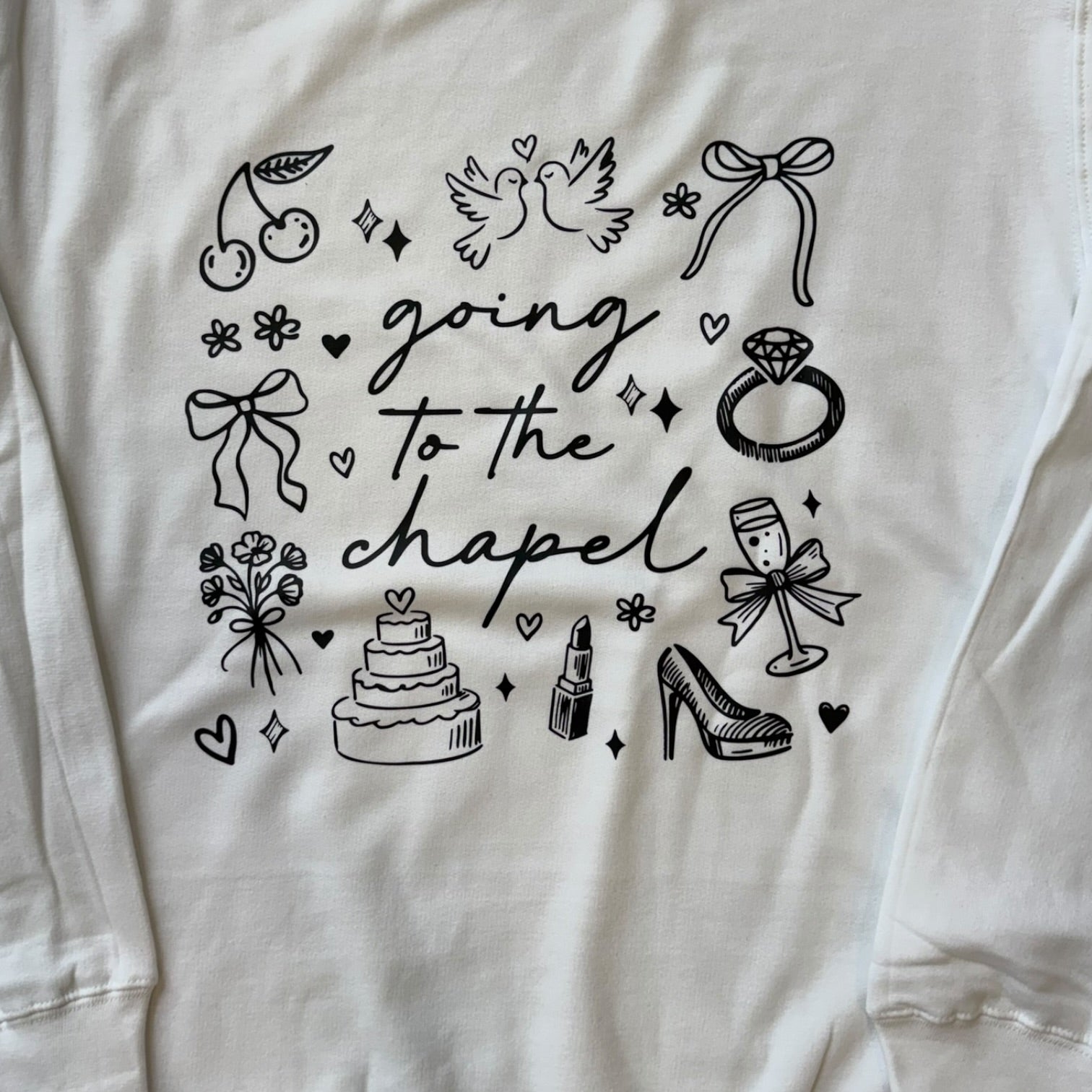 đź’Ť Going to the Chapel graphic sweatshirt made for brides, bachelorette weekends, bridal showers, and wedding festivities. This cozy white crewneck features adorable bridal icons for the perfect cute-meets-chic bride vibe.