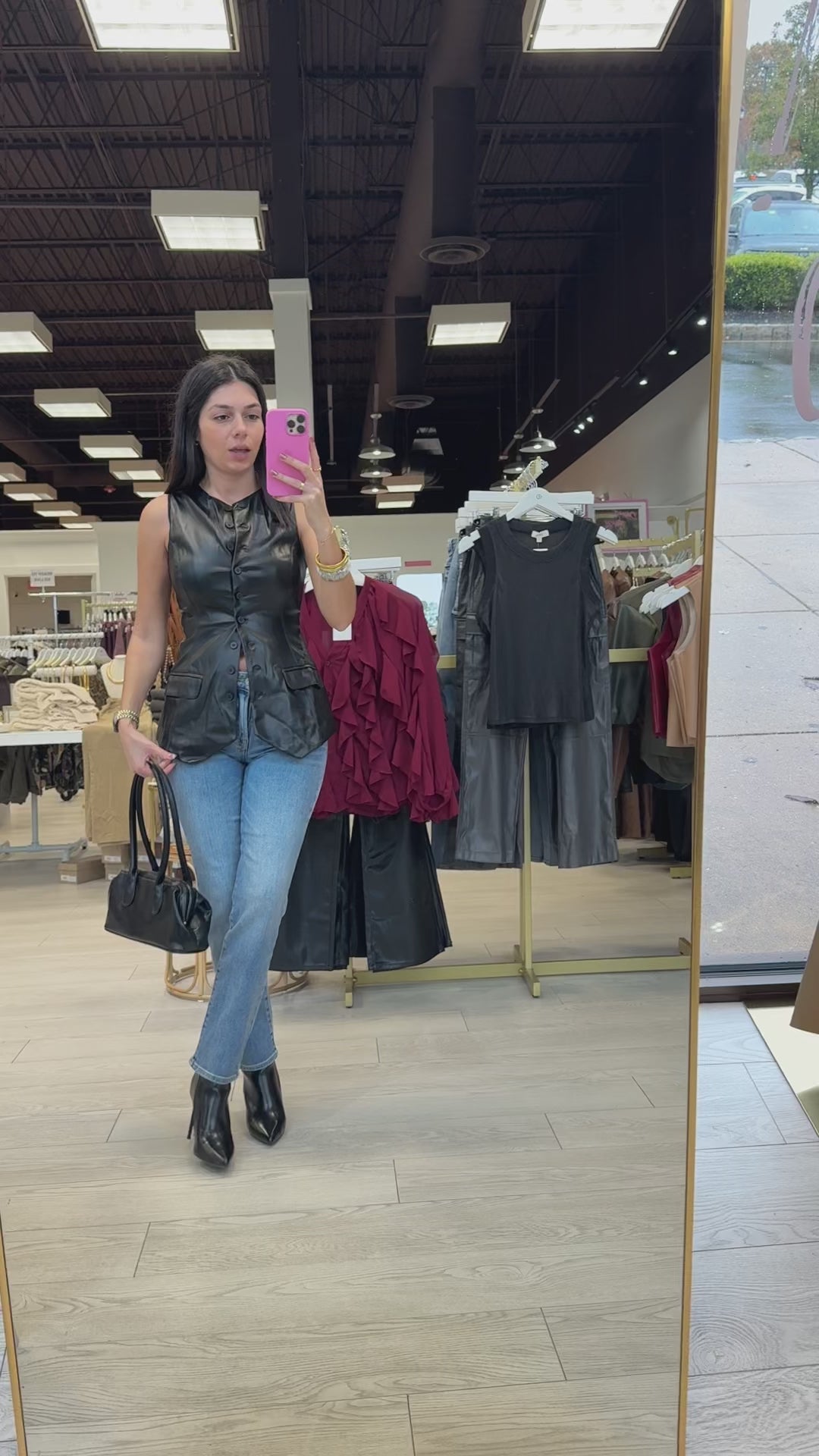 Sleek meets structured. This adjustable-waist faux leather vest creates the perfect cinched silhouette while keeping a relaxed, effortless edge.