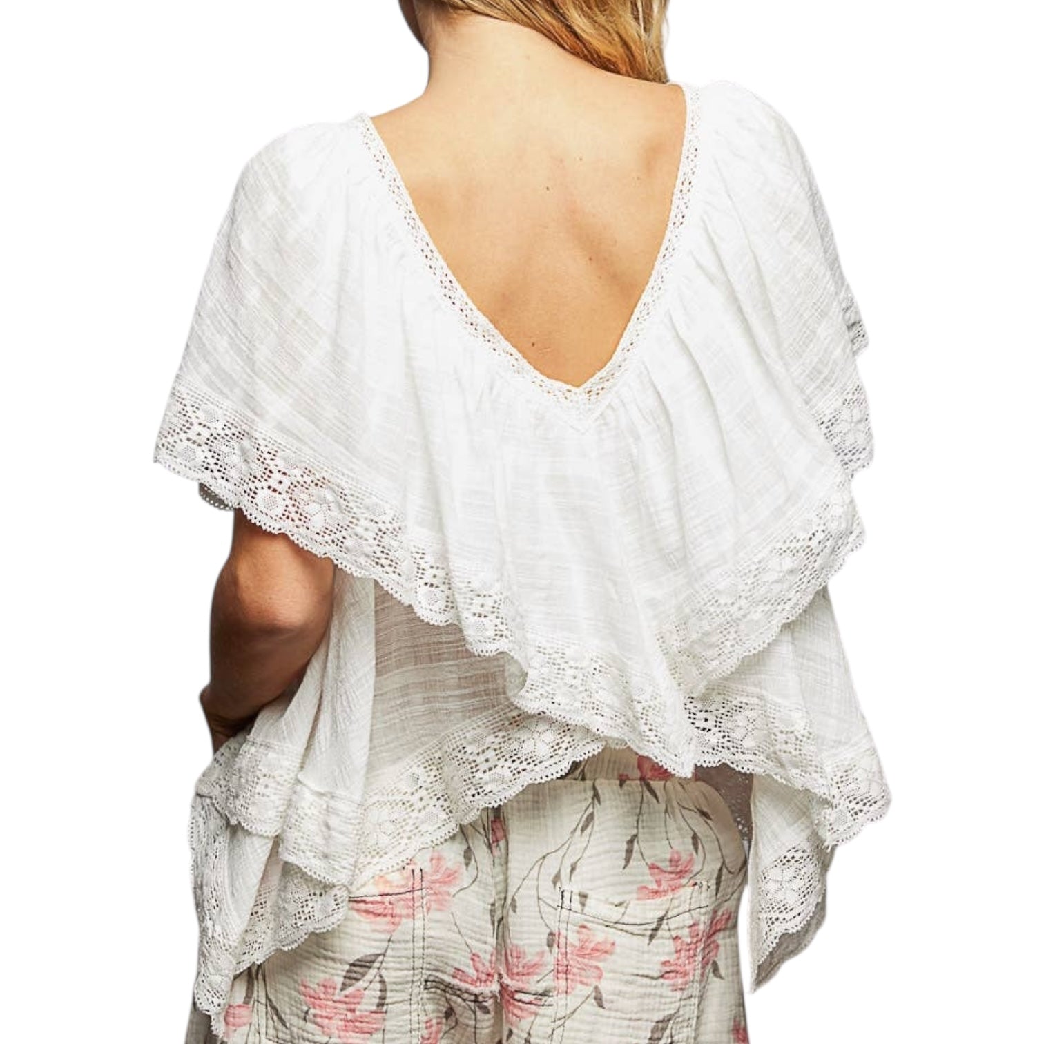 Romantic and feminine in the softest way 🤍 This textured woven top features a V-neckline with delicate lace trim, ruffle detailing, and a relaxed silhouette that floats beautifully. Lightweight and airy, it’s the perfect piece to dress up denim or pair with trousers for a chic, polished moment. A timeless closet love.