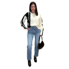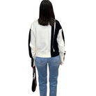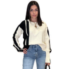 A bold twist on classic cable knit. This cream sweater plays with contrast, featuring jet-black and white striping that elongates and defines. With a rounded neckline, long sleeves, and clean structure, it's made for days when you want comfort and attitude.