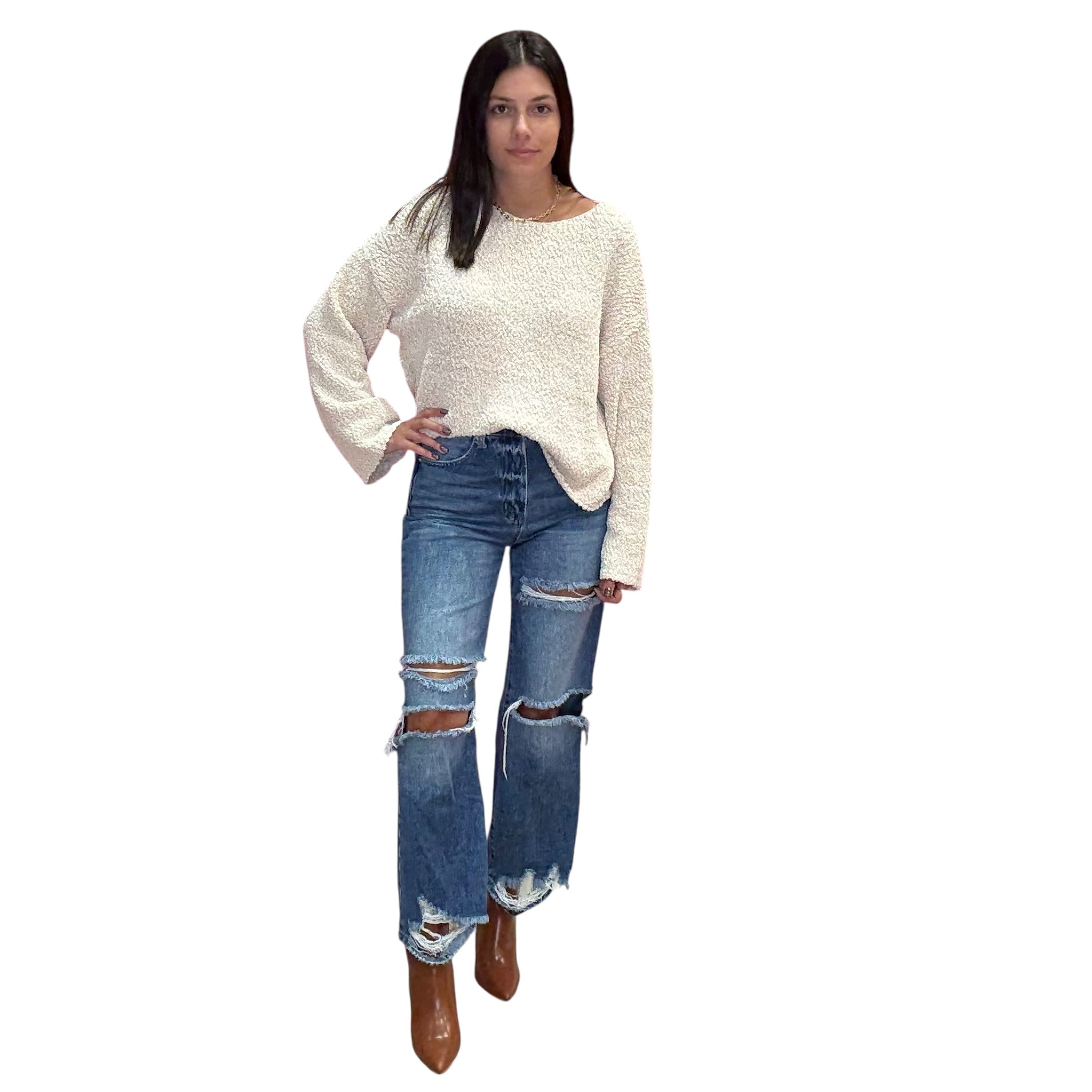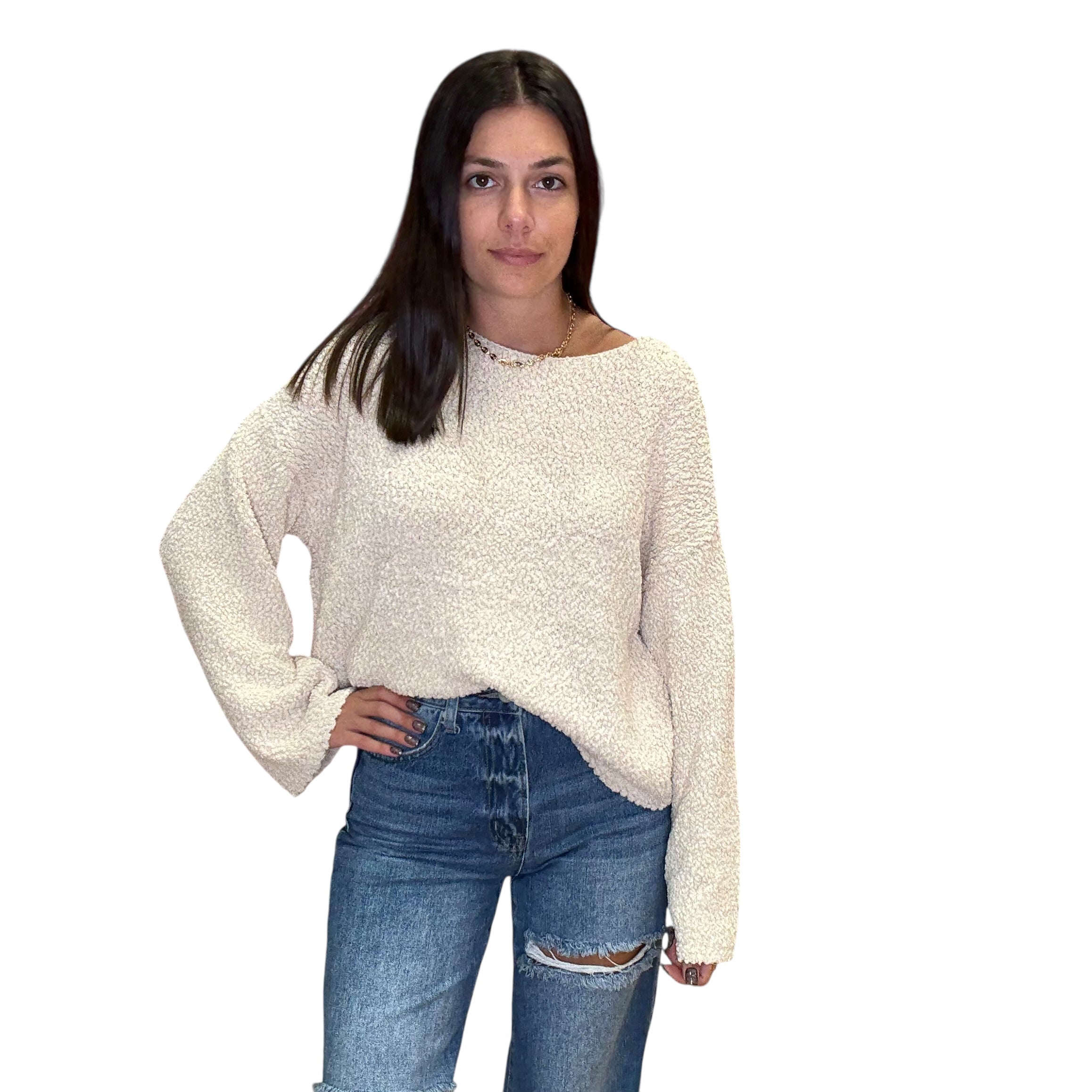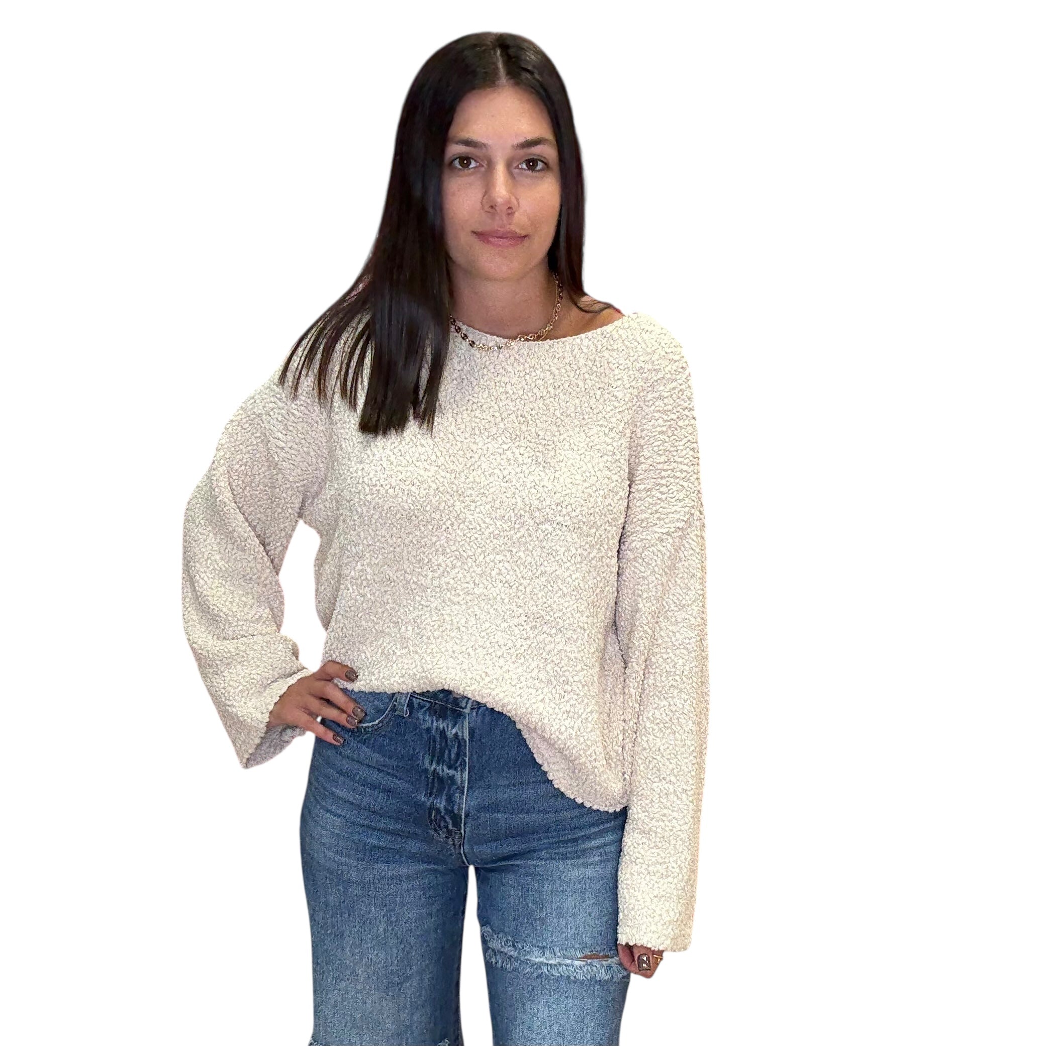 A cozy-chic staple 🤍 This textured popcorn-knit sweater features a wide boat neckline + drop shoulders for that slouchy, effortless feel.