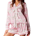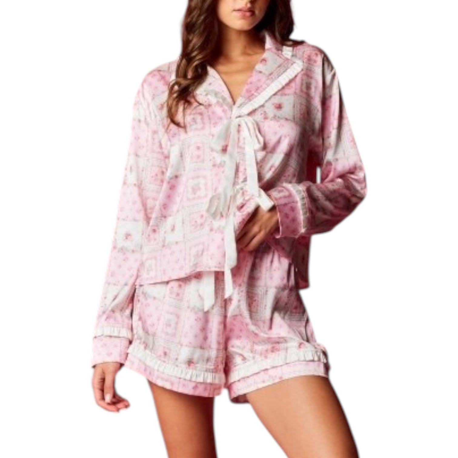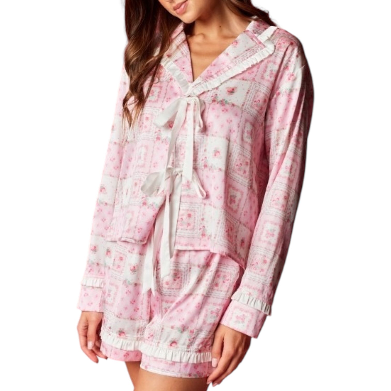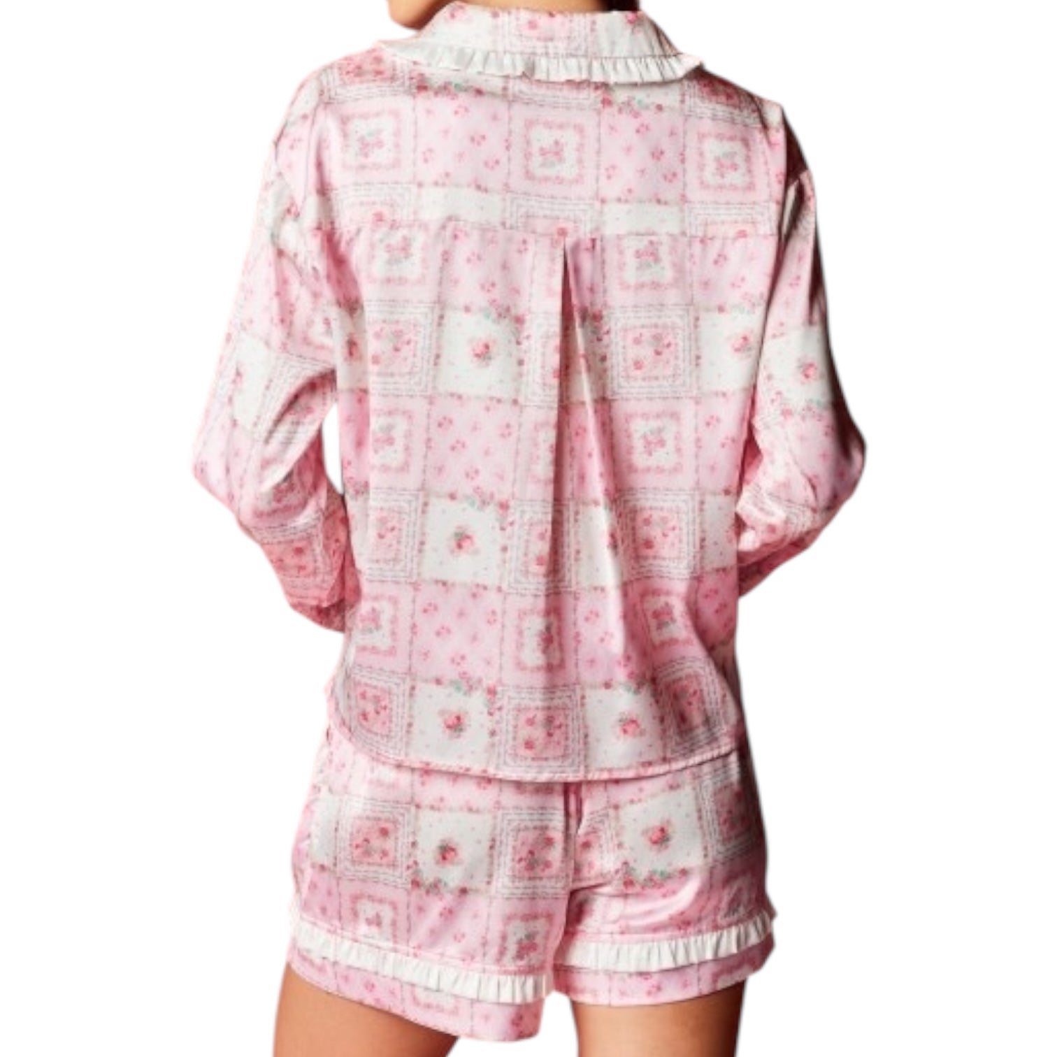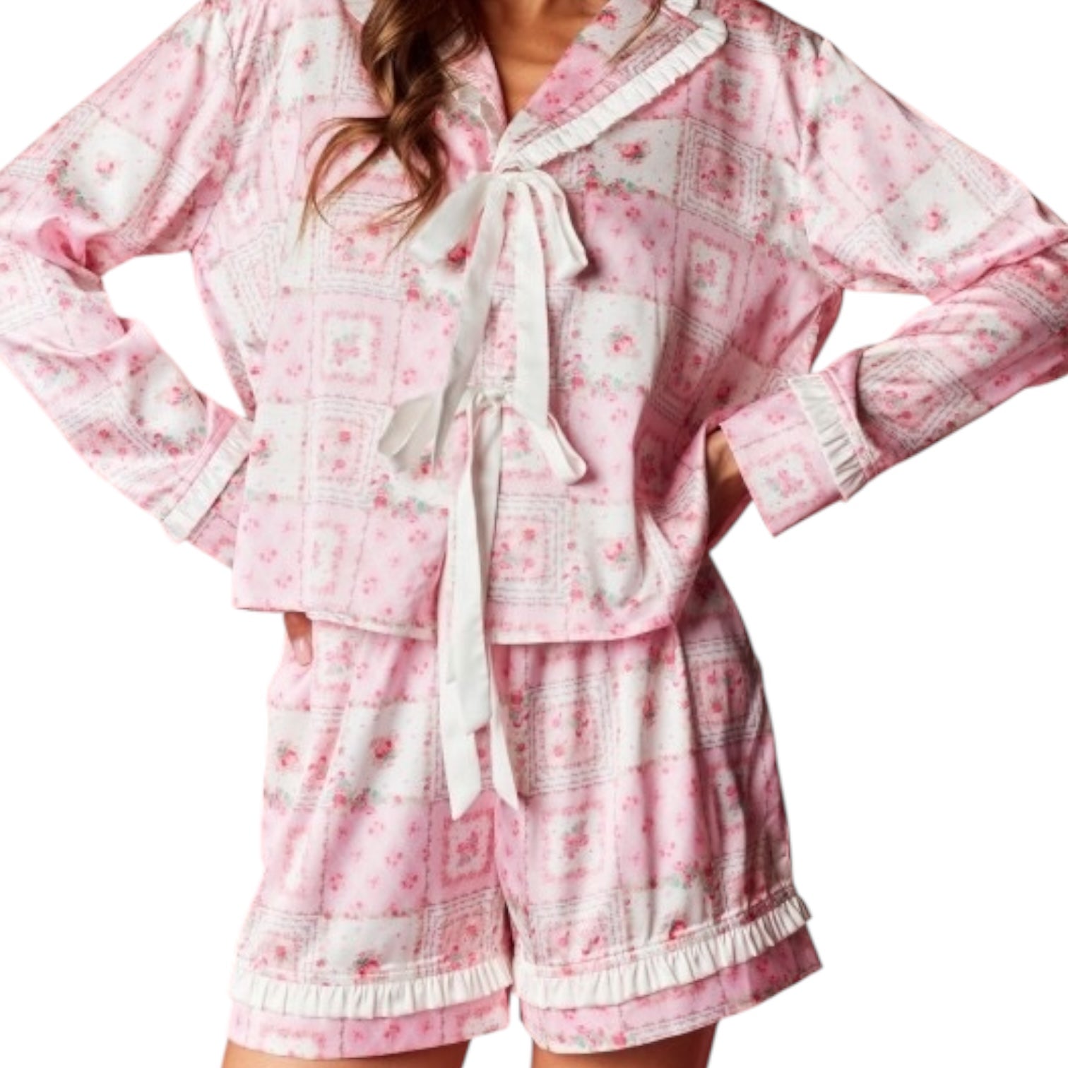 Soft, sweet, and made for slow mornings. The Patchwork Ribbon Pajama Set features a dreamy pastel pink floral print with a silky, lightweight feel that’s cozy without feeling heavy. The long-sleeve top is finished with a sailor-style collar, delicate ruffle trim, and an adjustable ribbon tie at the waist for that extra feminine touch. The matching shorts have a comfy elastic waistband and subtle ruffle hem, making this set as cute as it is comfortable. Perfect for lounging, coffee on the couch, or gift-giving moments 🎀✨