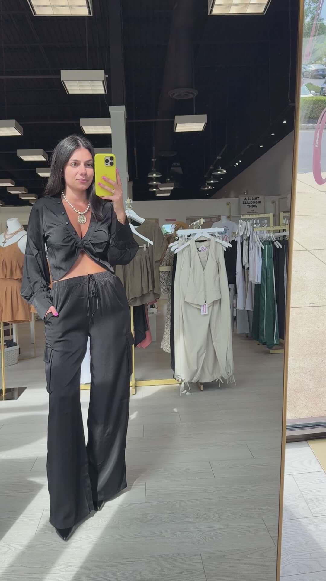 Alicia’s Styling Tip: Style with satin cargo pants and heels for girls' night out or leather pants for full glam.