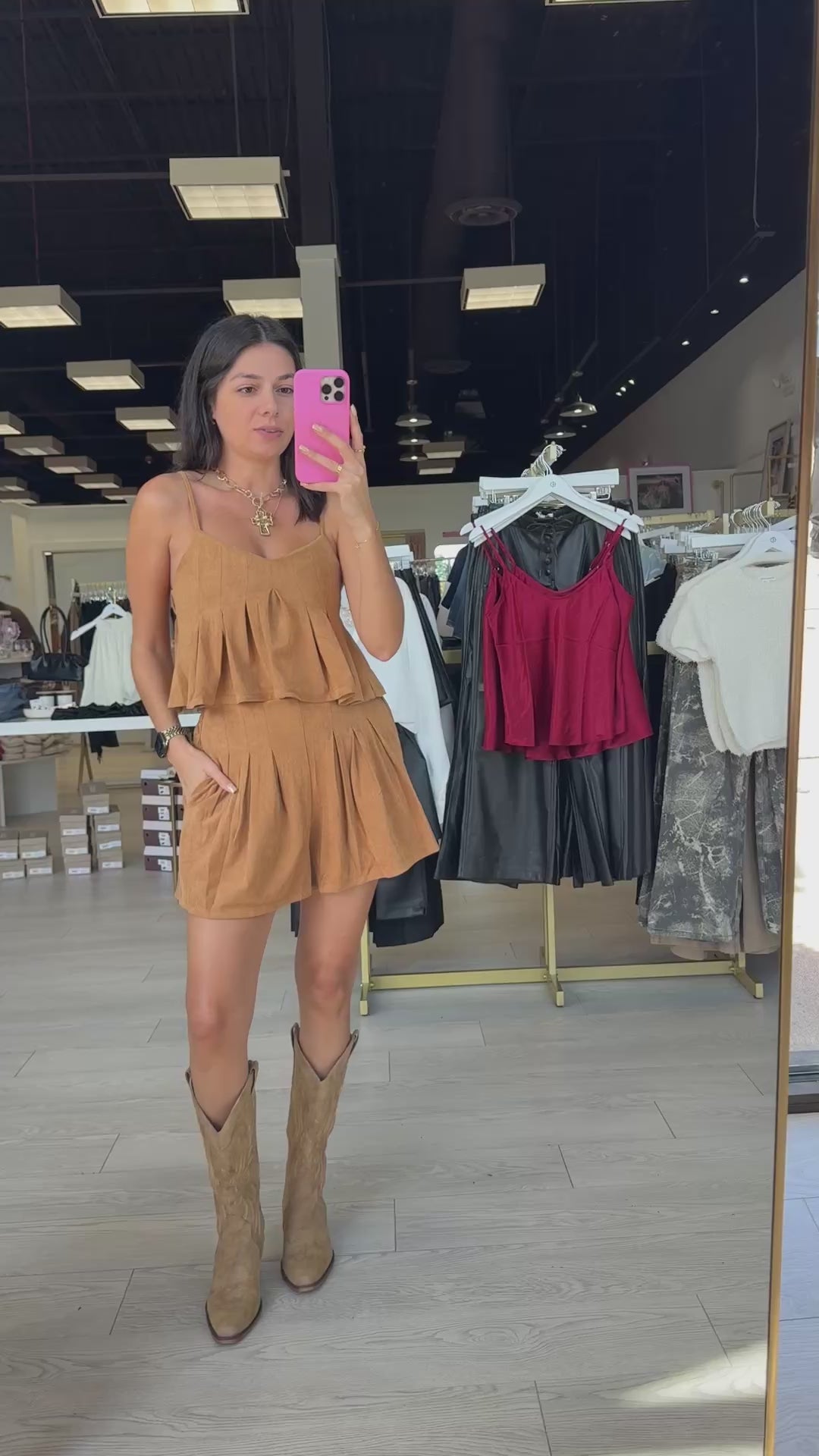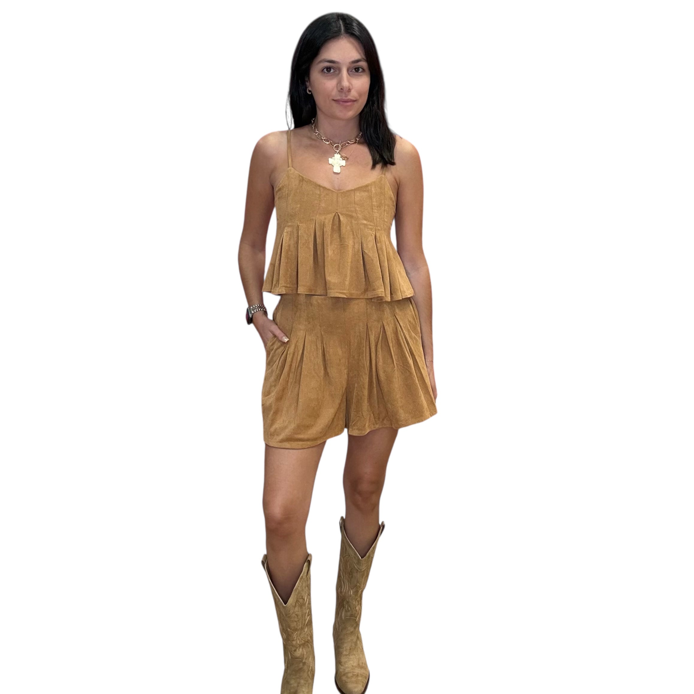 This faux suede set features a pleated sleeveless top and matching flowy shorts in a luxe camel tone. Made with a soft, stretchy blend, it’s as comfy as it is chic. Effortlessly polished and perfect for fall transitions or layering under a blazer.