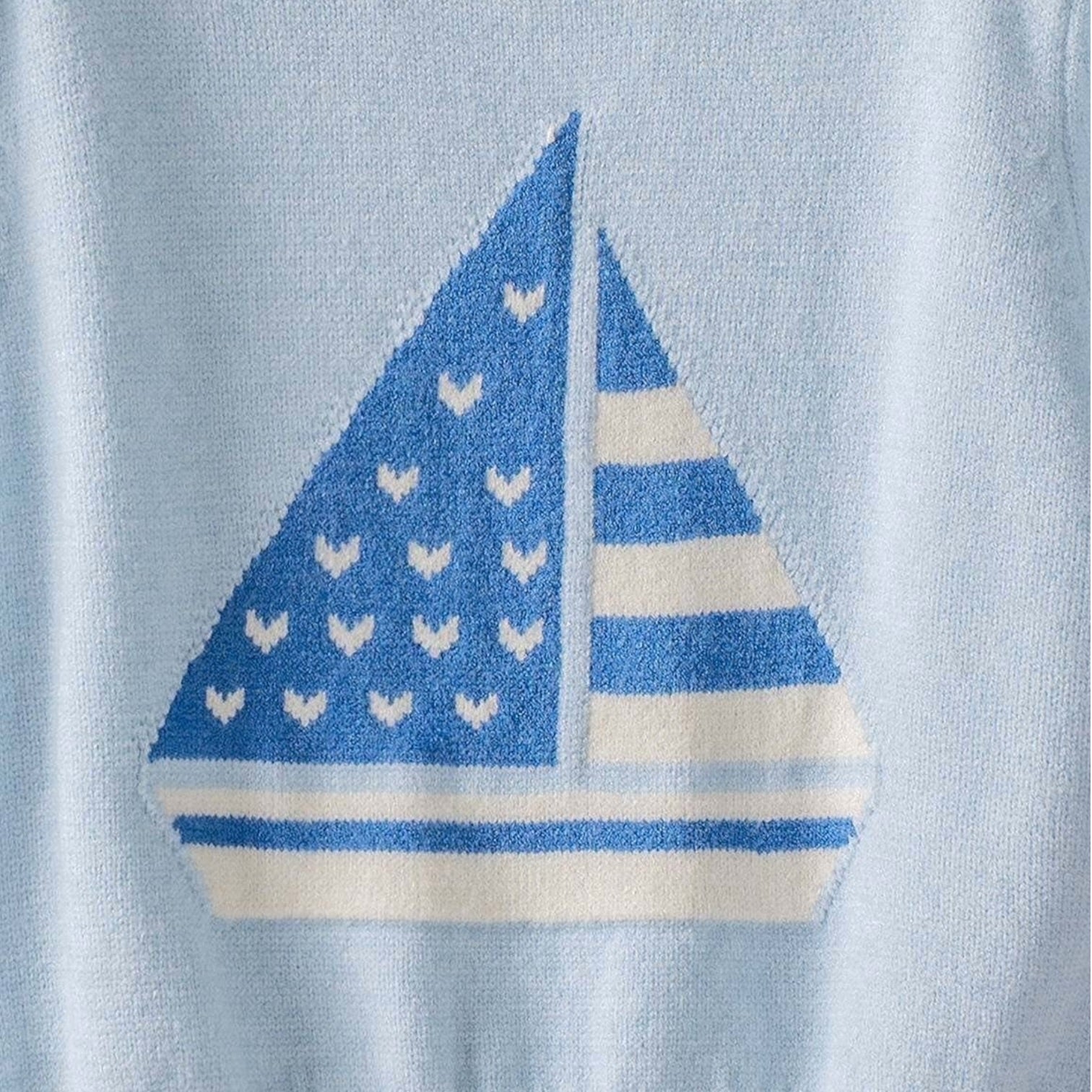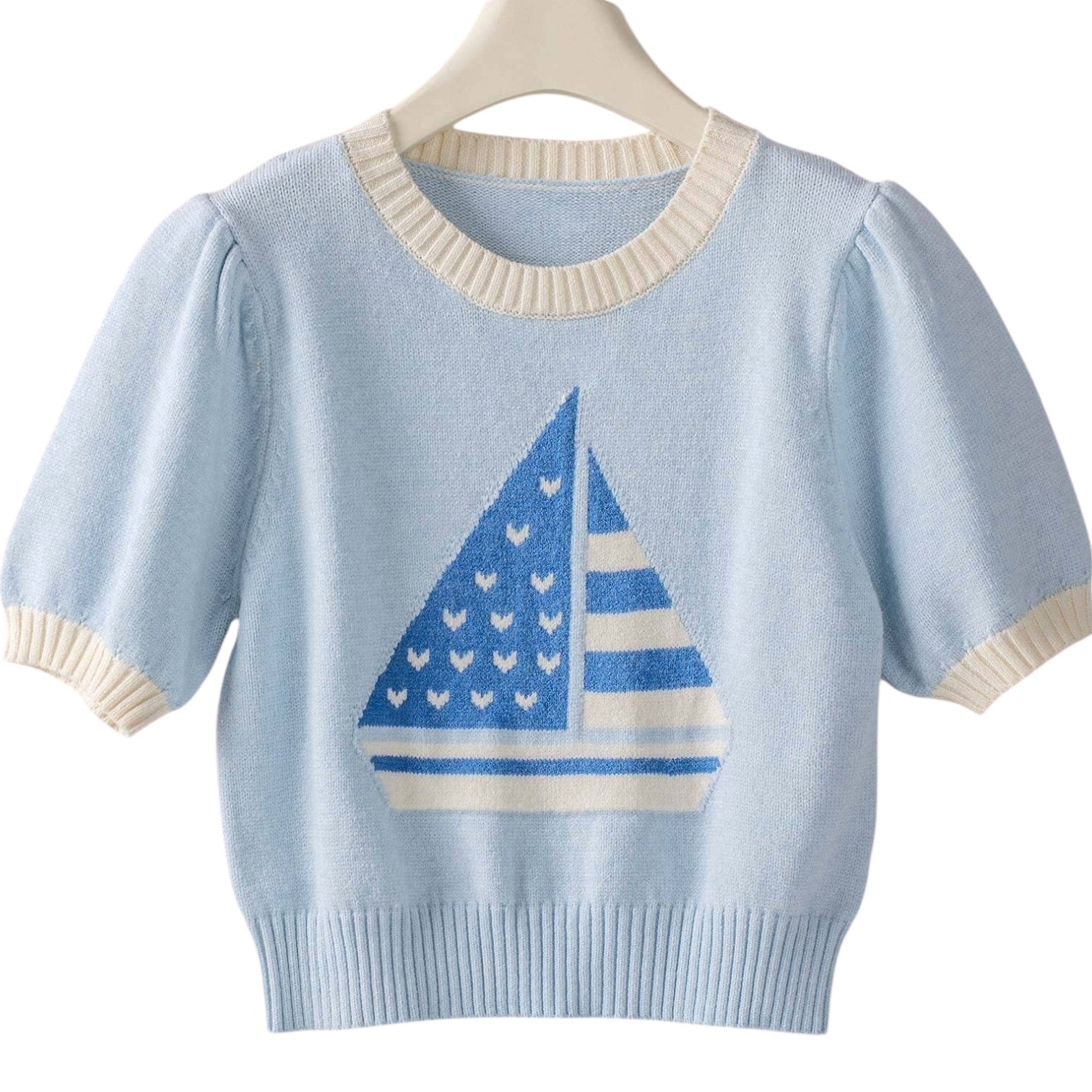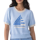 A fresh take on nautical 💙 This soft knit features a whimsical sailboat graphic and subtle puff sleeves for that feminine-meets-classic look. Easy, flattering, and perfect for layering.