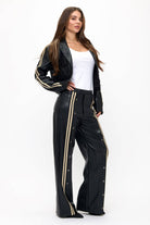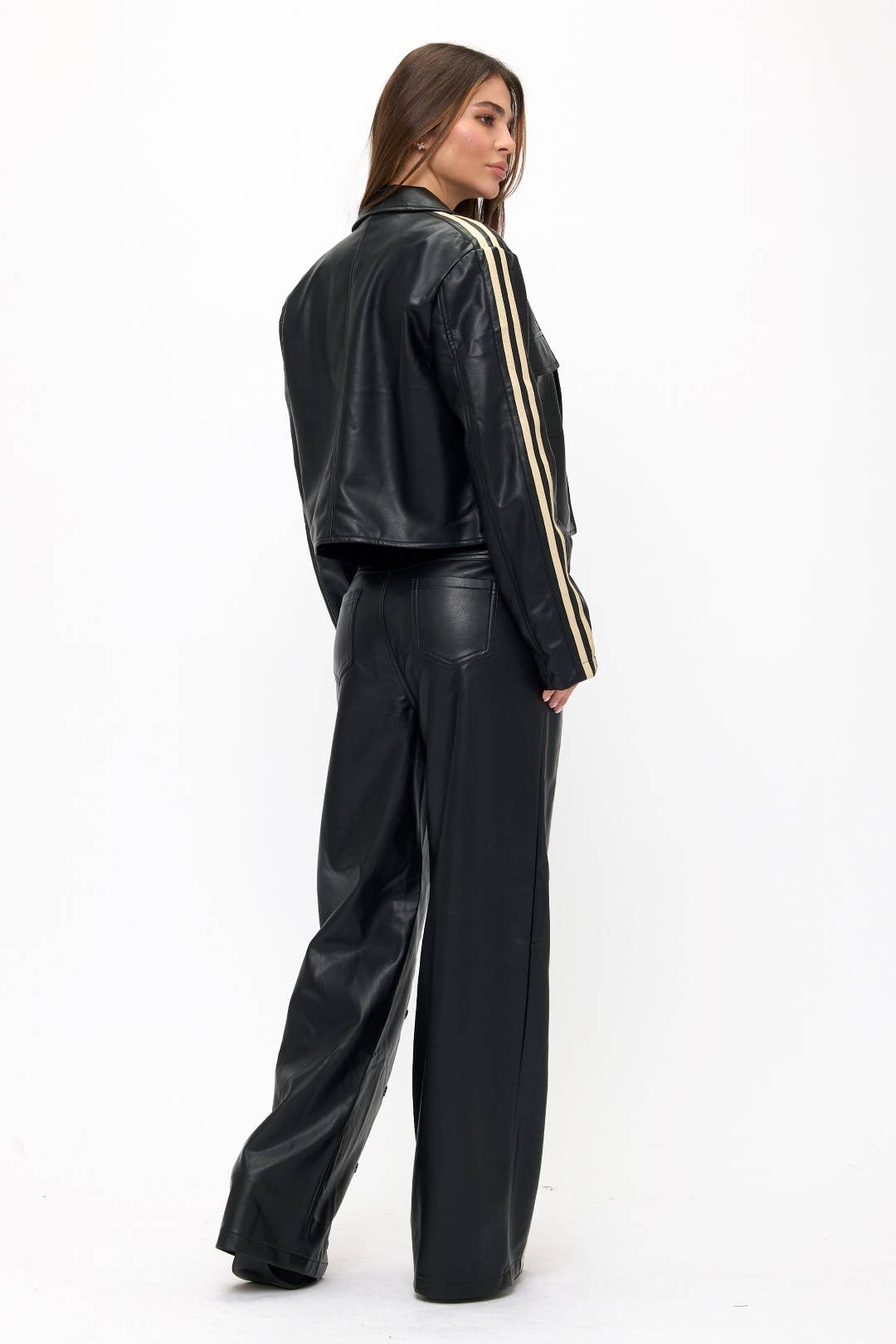 This jacket was made for making moves. Crafted from premium vegan leather, the cropped bomber features bold racing stripes — giving sporty-chic a whole new meaning.
