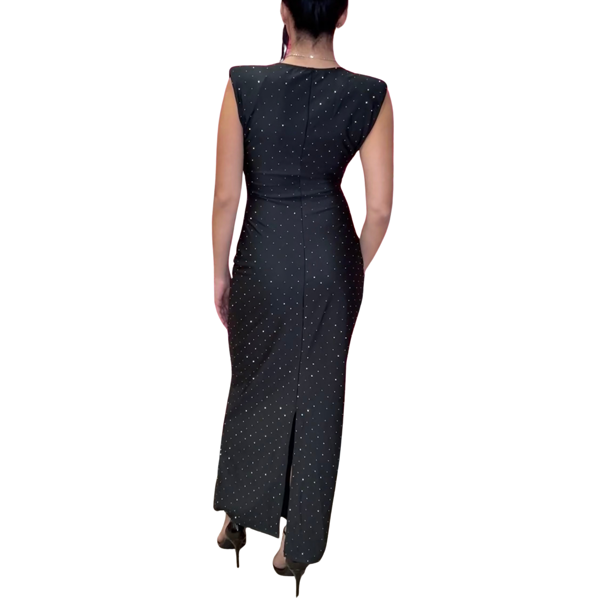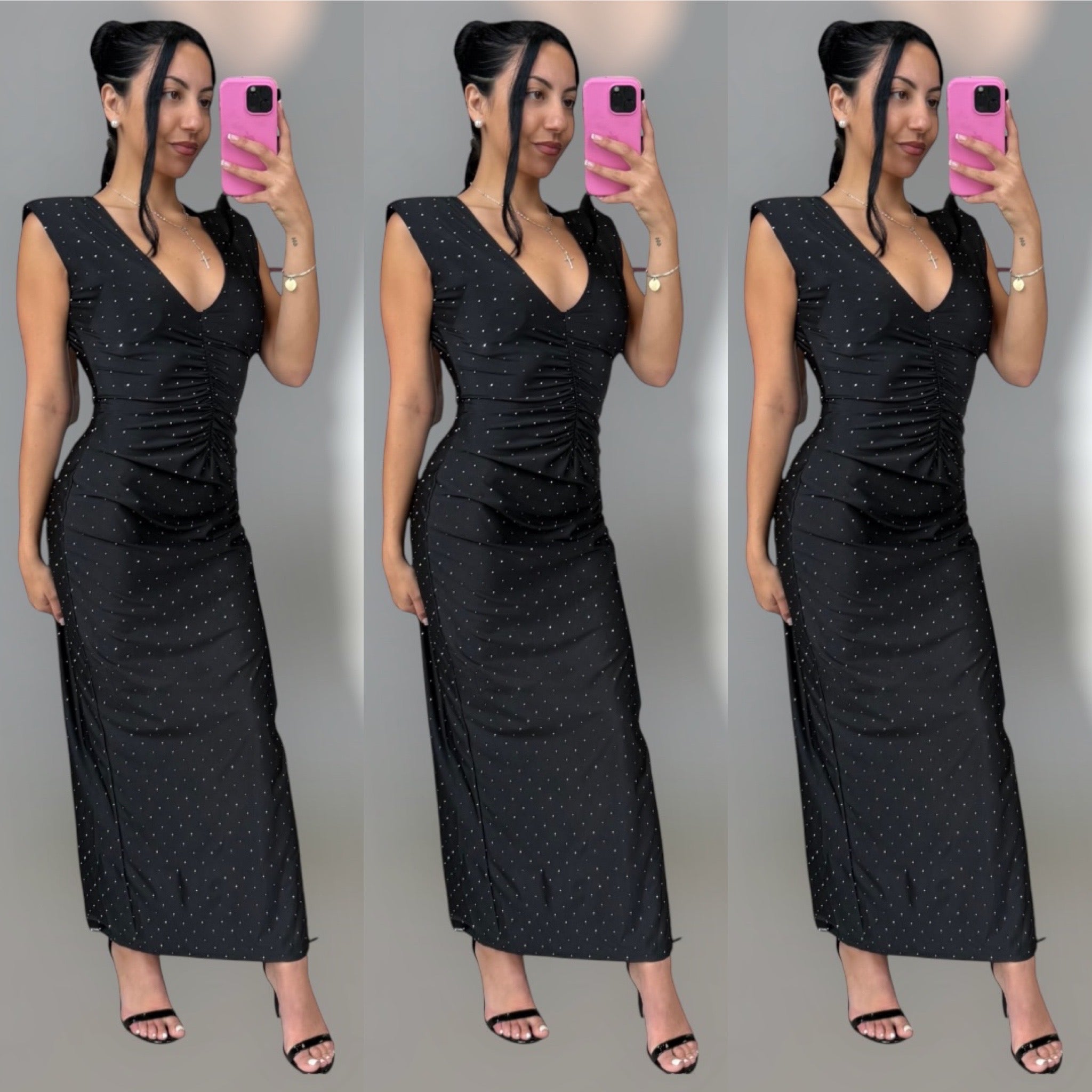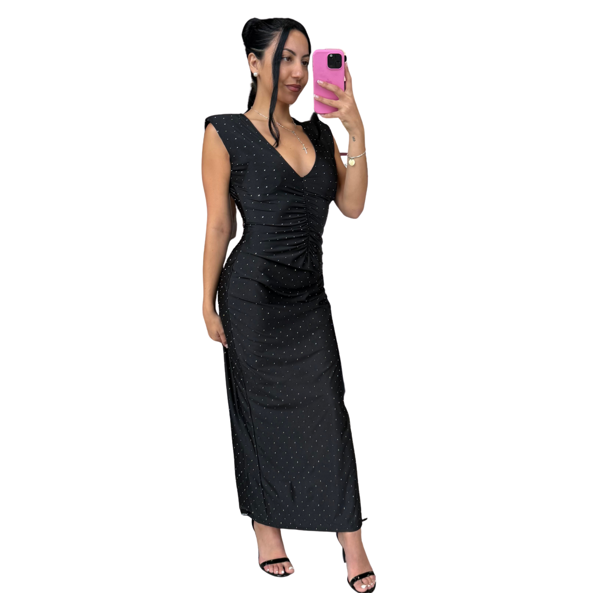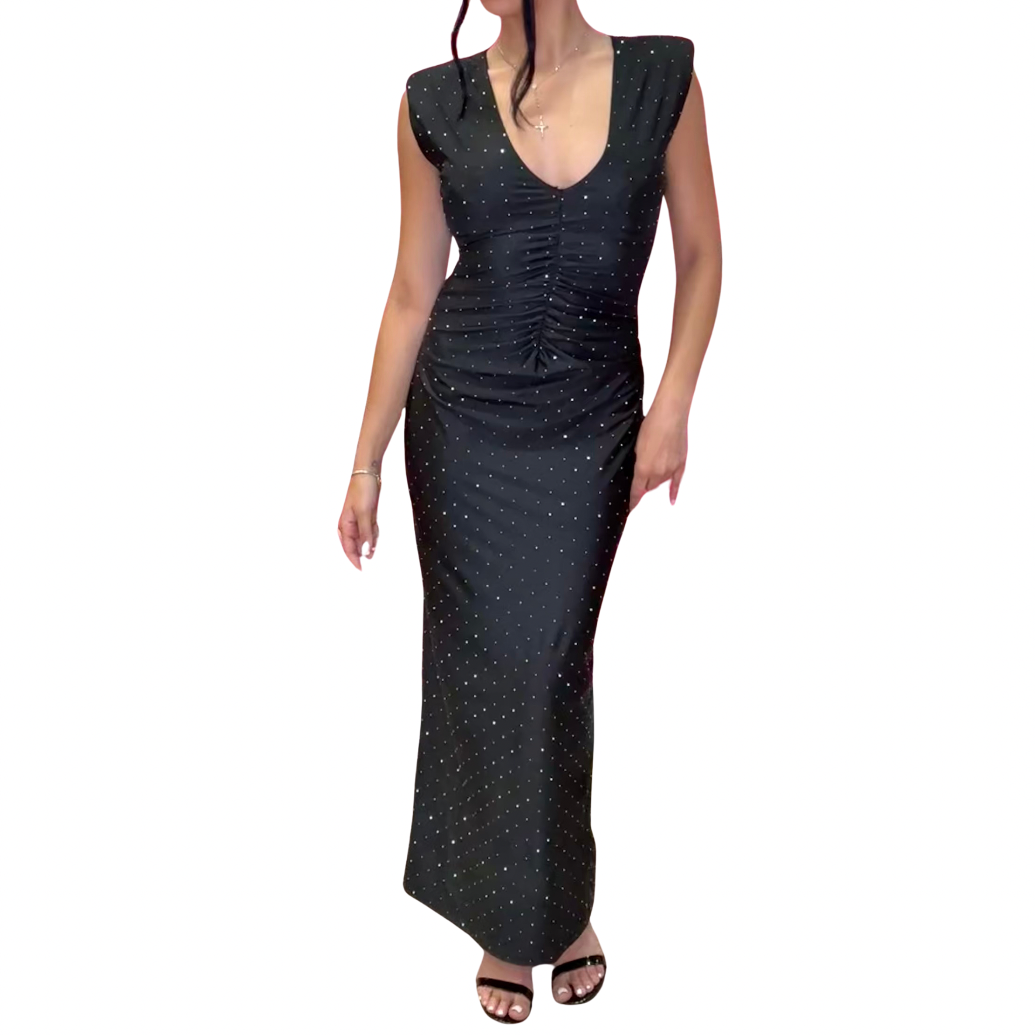 Make an entrance in the Ruched Black Rhinestone Dress ✨. This sleek black gown is sprinkled with rhinestone accents that shimmer under the lights, while the deep V neckline and ruched waist create a flattering, curve-hugging silhouette. With padded shoulders and a floor-length finish, it’s the ultimate mix of edgy glam and timeless elegance—perfect for holiday parties, weddings, or a night out that calls for a little sparkle.