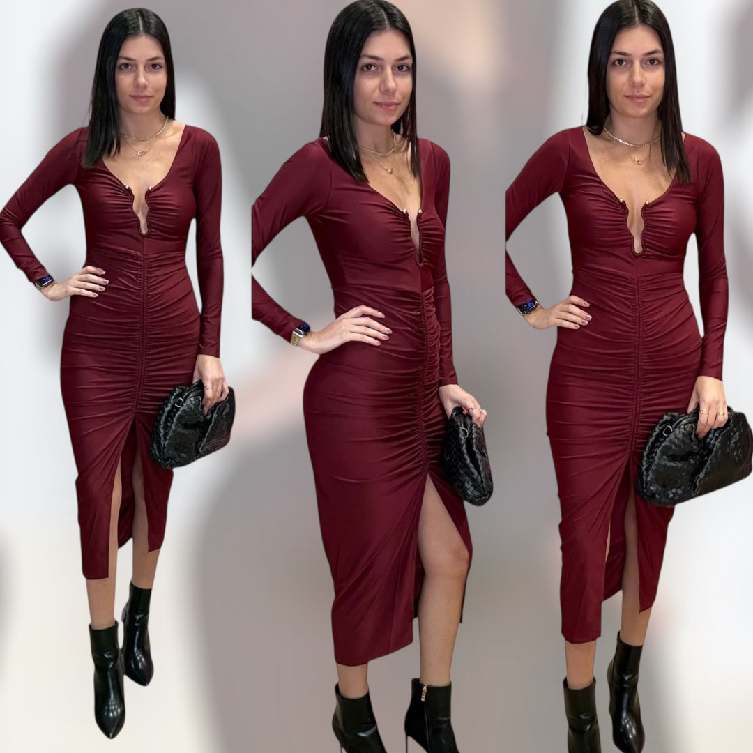 Turn heads in this deep V-neck midi that hugs in all the right places 🍷 Featuring front shirring, a flirty side slit, and a soft stretch fabric that moves with you. The rich burgundy tone gives main-character energy — perfect for date nights, girls’ dinners, or holiday parties.