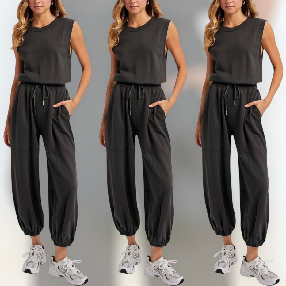 Easy, comfy, and made to move 🤍 This sleeveless knit jumpsuit features a flattering drawstring waist and soft stretch fabric that feels good all day. Designed for errands, travel days, or casual plans when you want to look pulled together without trying too hard ✨