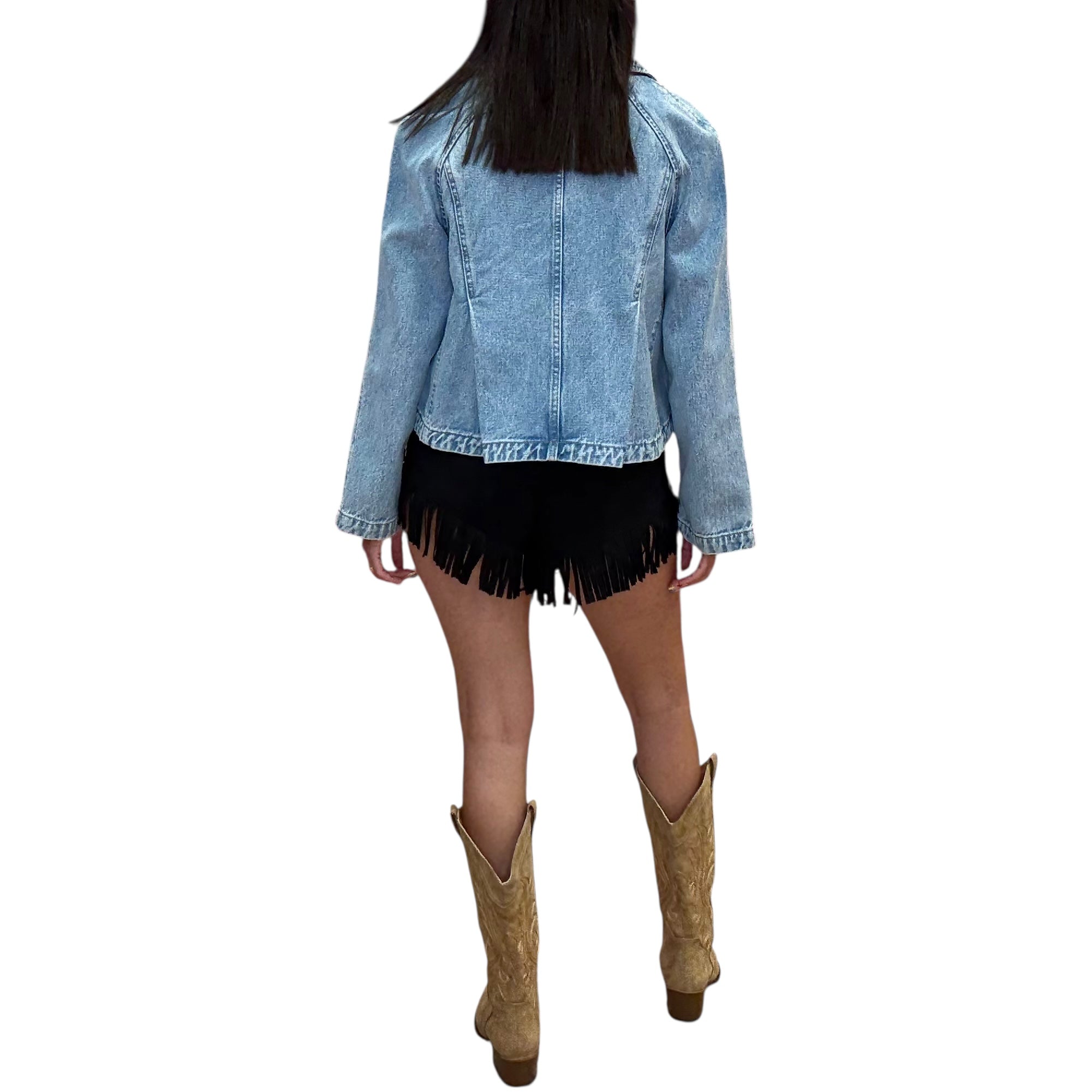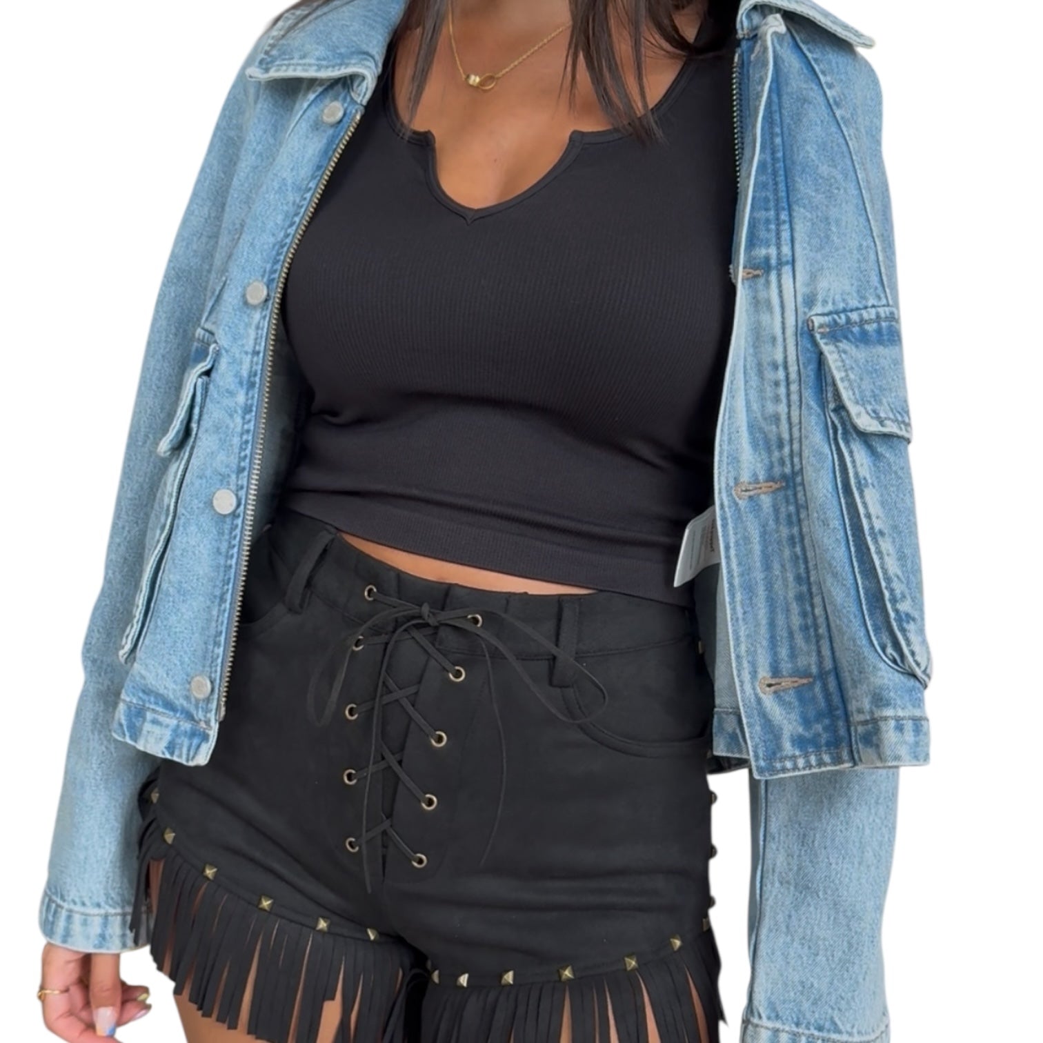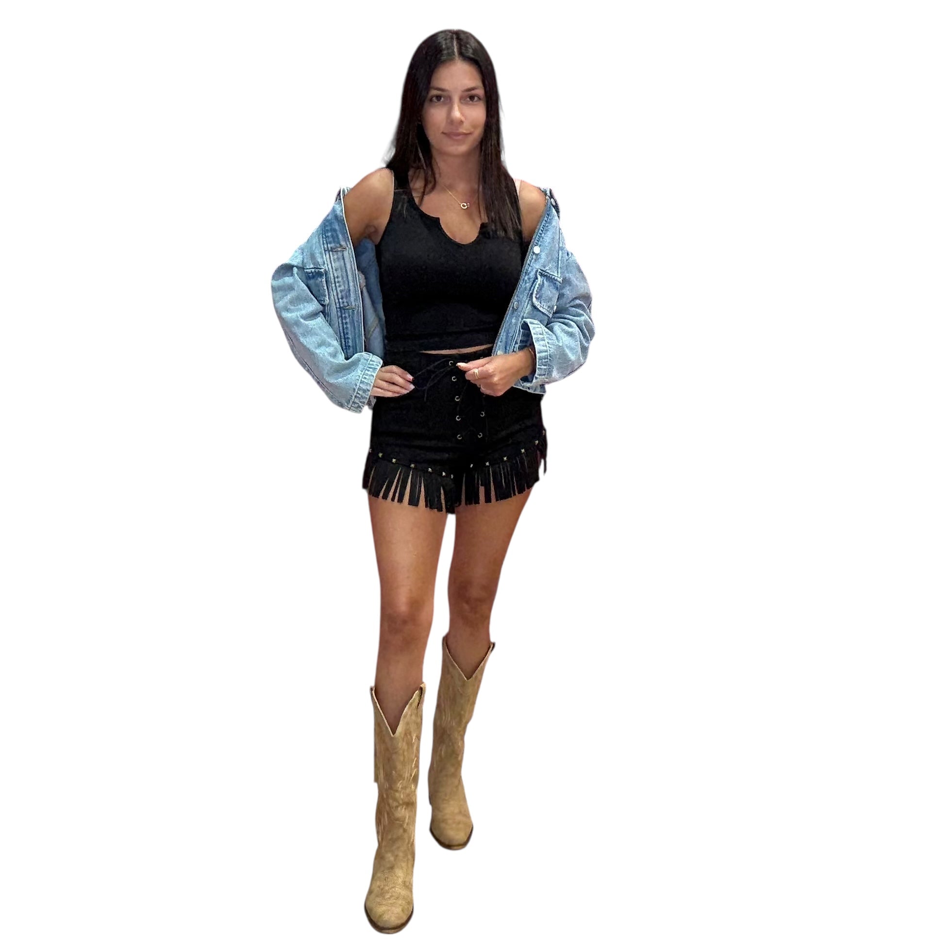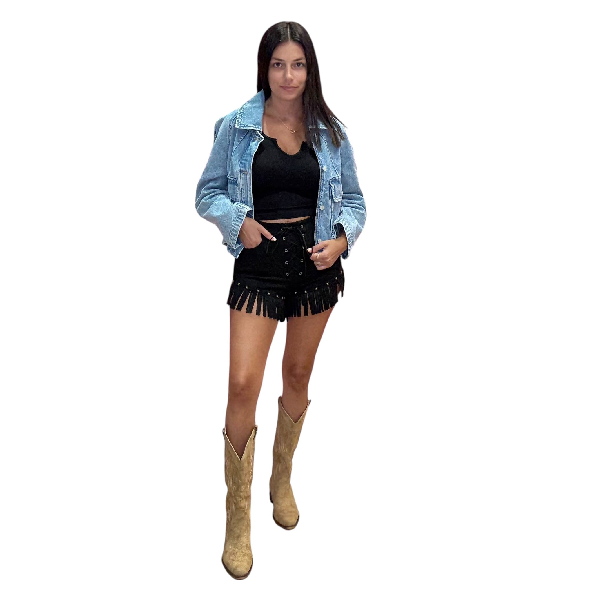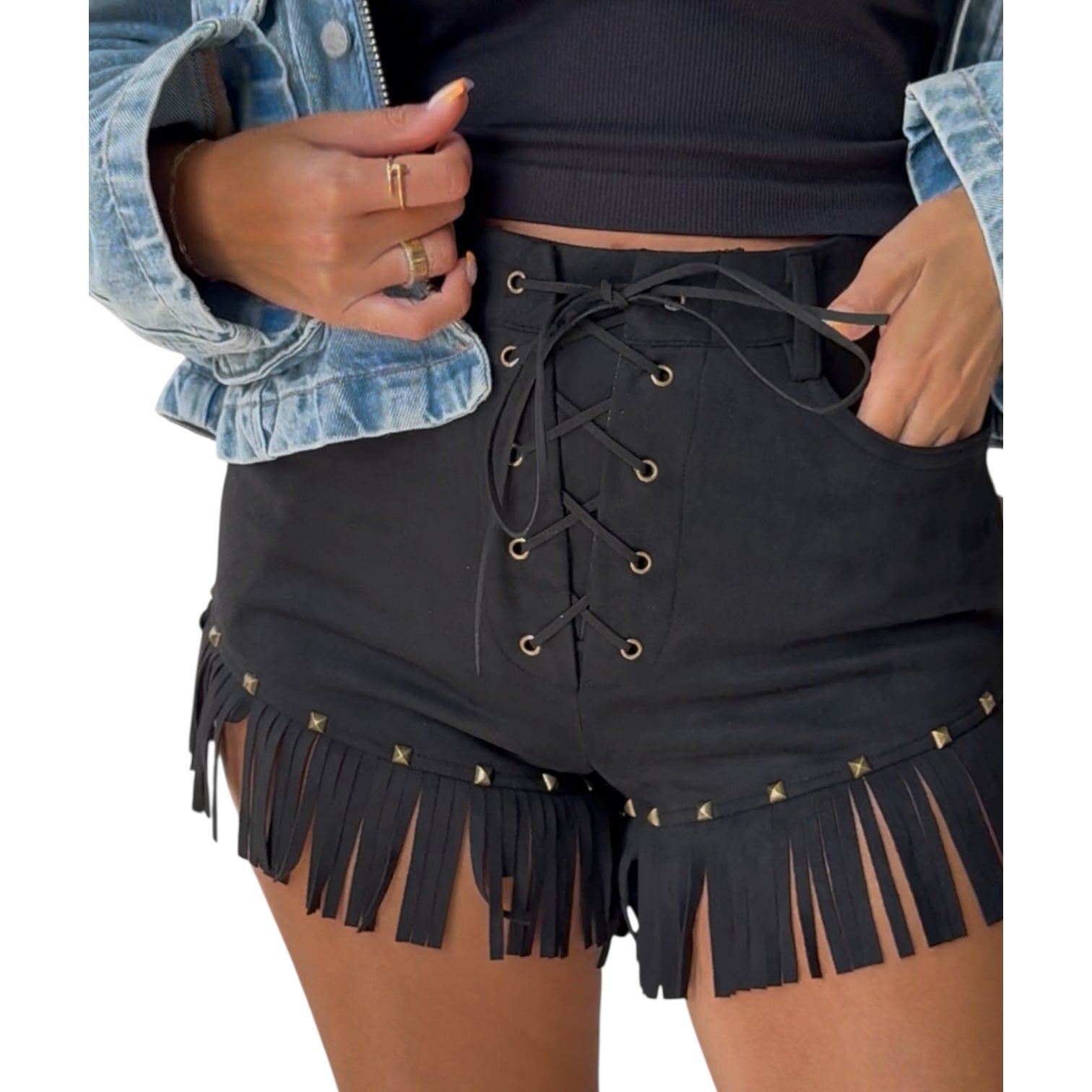 Black faux suede shorts with fringe, studs, and lace-up front detail—perfect for a night out or your next country concert.