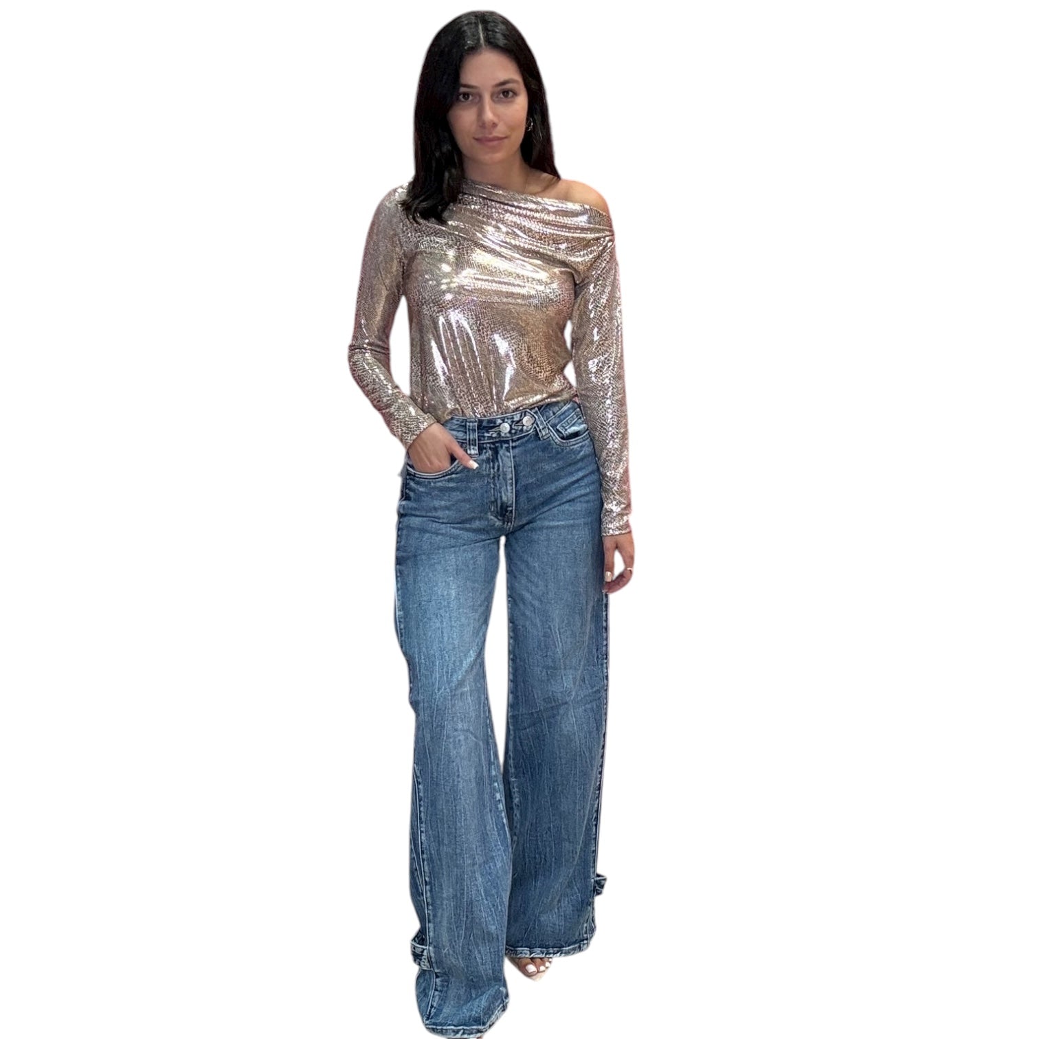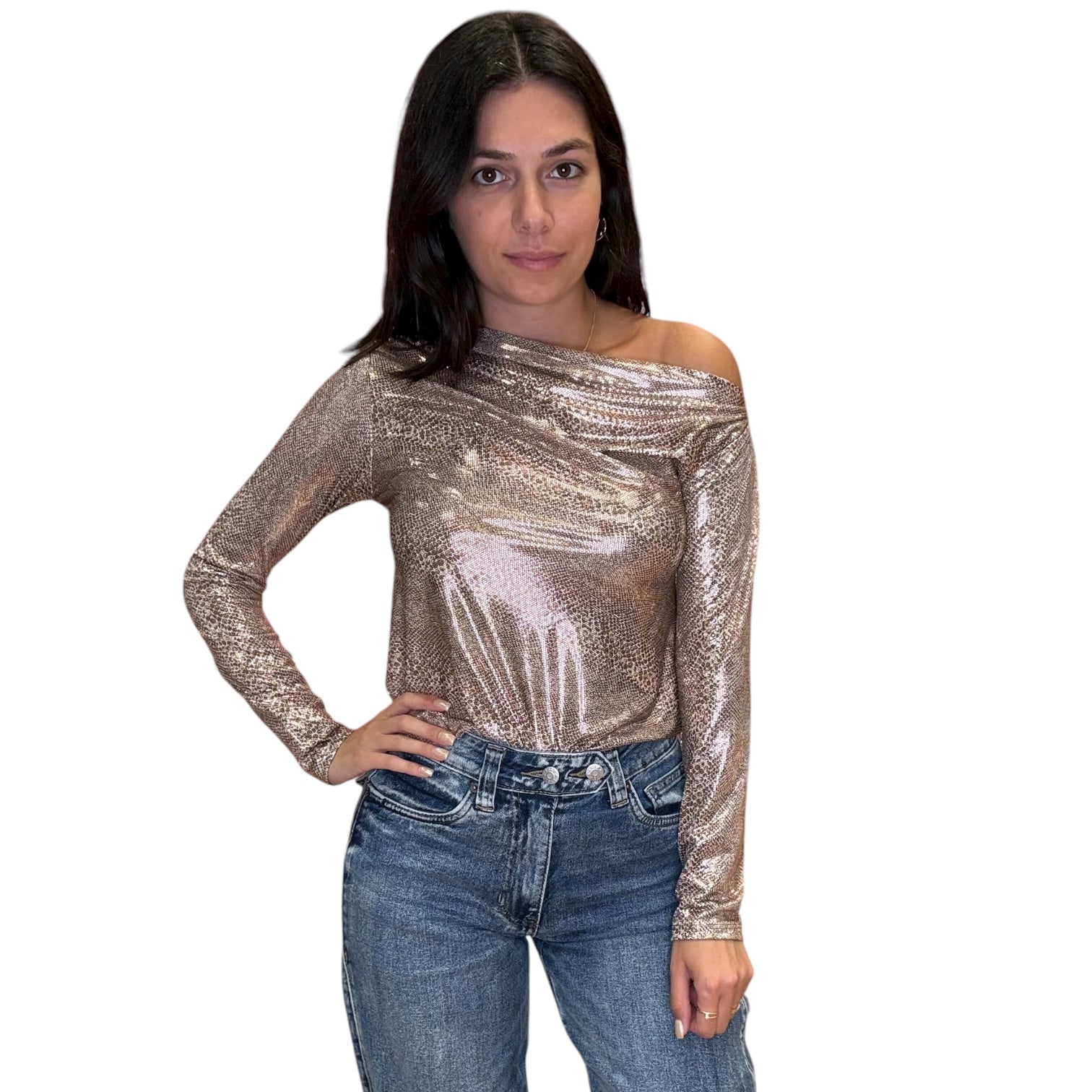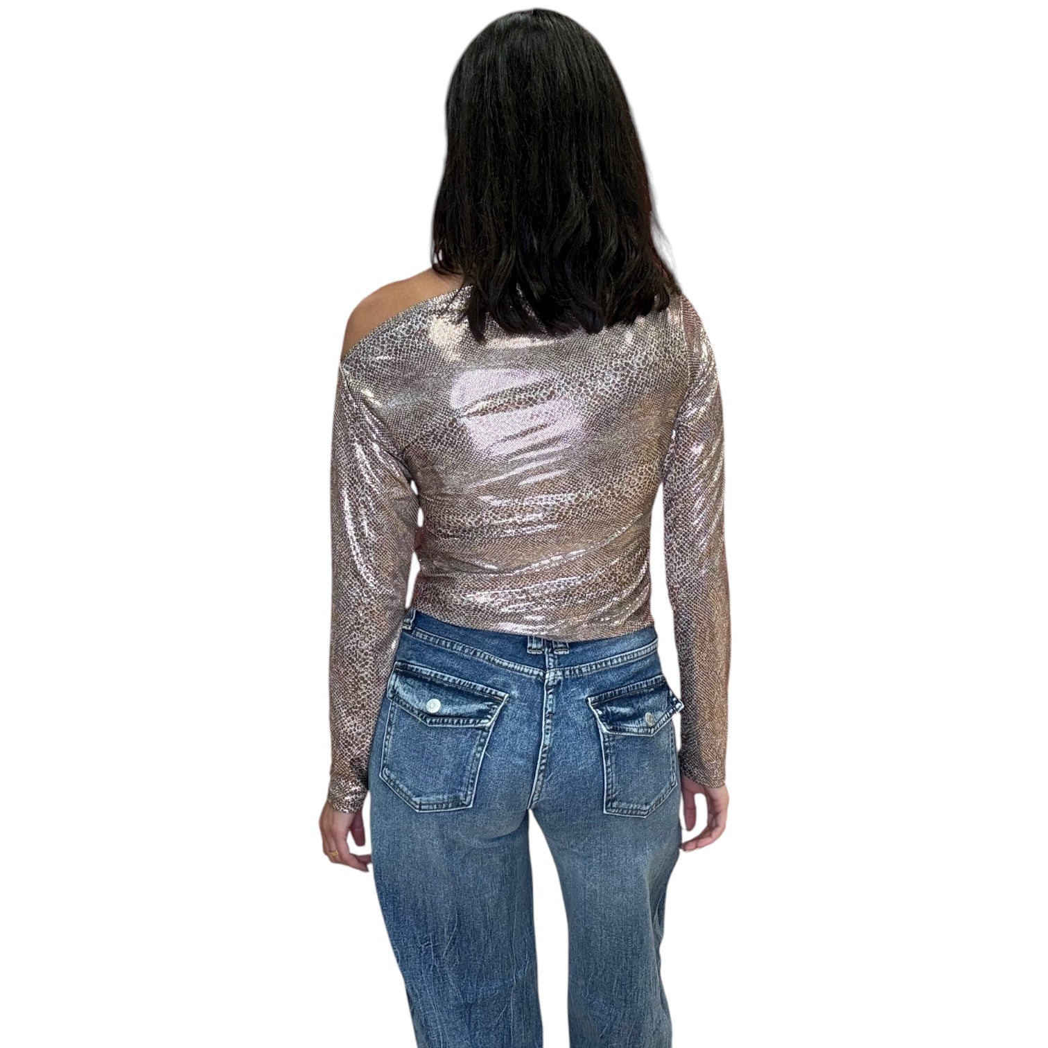An asymmetrical statement with a metallic twist. This cold-shoulder snake foil top brings shimmer, edge, and a touch of drama—perfect for when your outfit needs that “wow” factor.