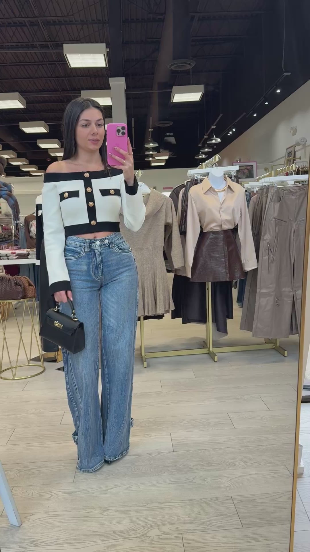 Cozy, flirty, and just the right touch of glam — this off-shoulder cropped sweater brings that effortless “I just threw this on and look amazing” energy. The contrast trim pops in the prettiest way and the gold button detail adds a little luxe moment your closet will thank you for. Soft, stretchy, and so fun for girls’ night, holiday hangs, or dressed-down denim days ✨🖤🤍