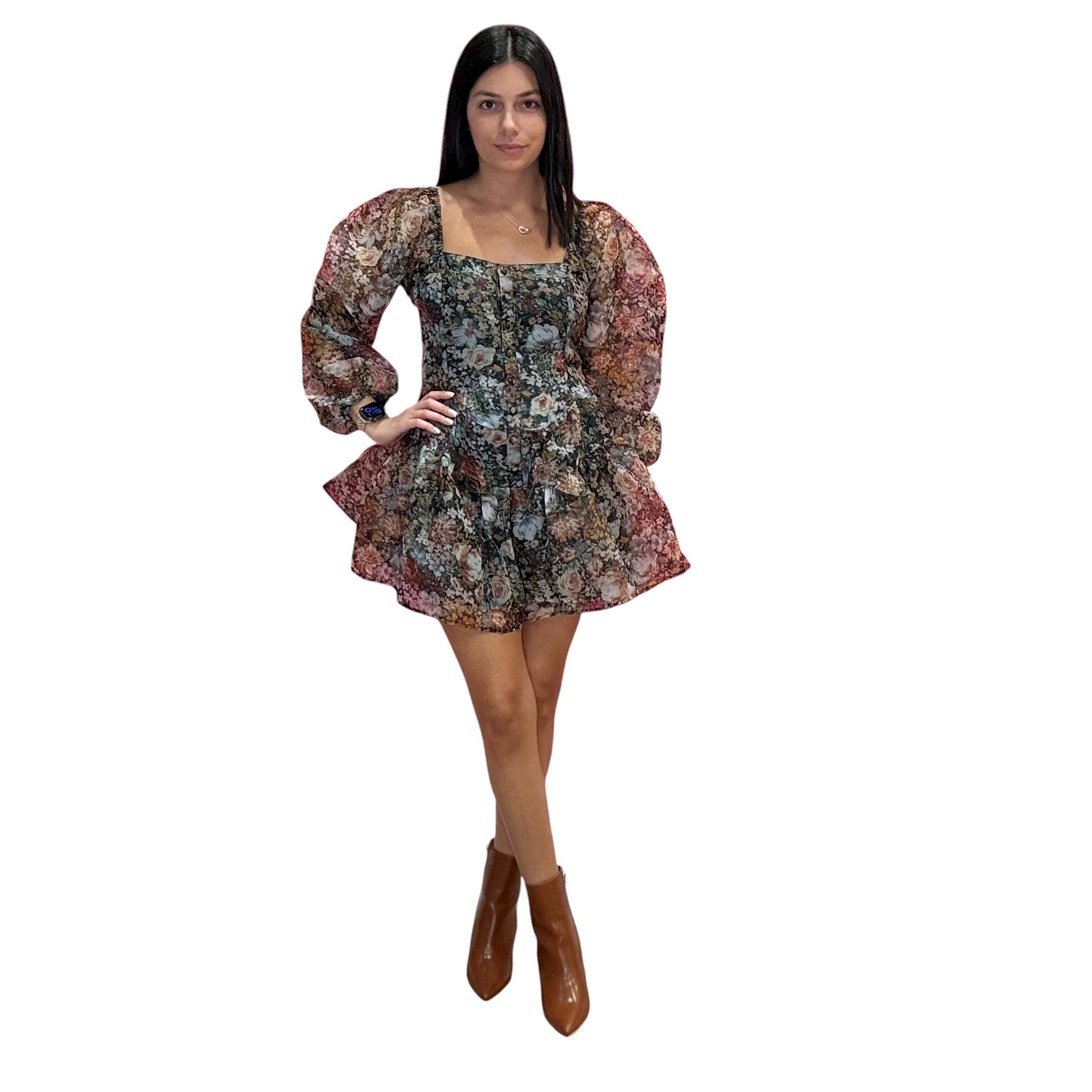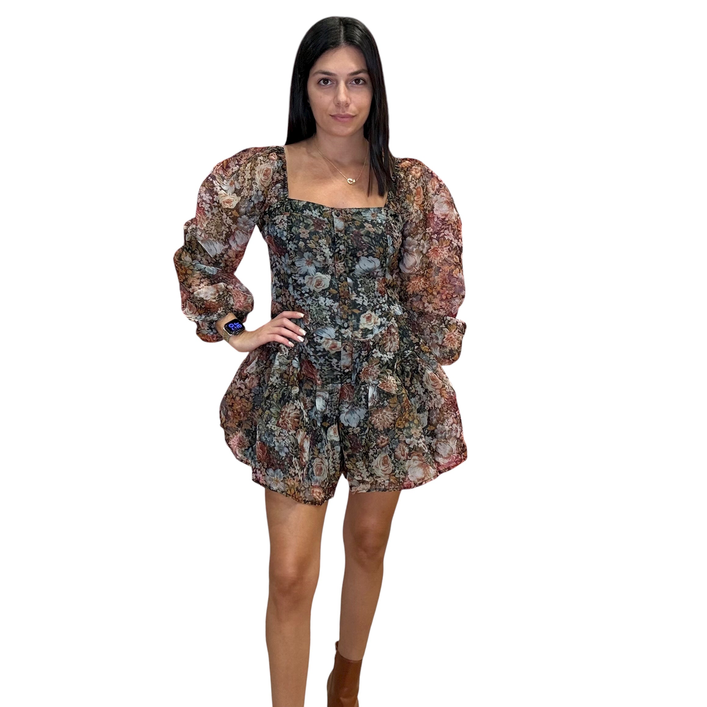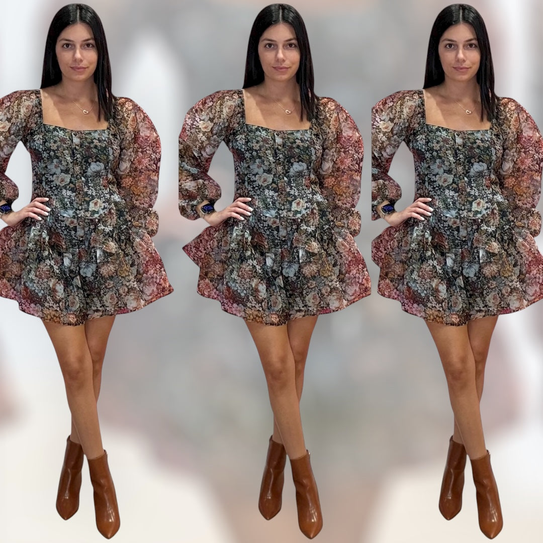 This floral organza romper is all drama and romance. Featuring a sweetheart neckline, corset-style bodice, and tiered ruffle shorts, it’s the ultimate piece for a night out. The balloon sleeves add a soft, dreamy vibe, while the low back keeps things unexpected.
