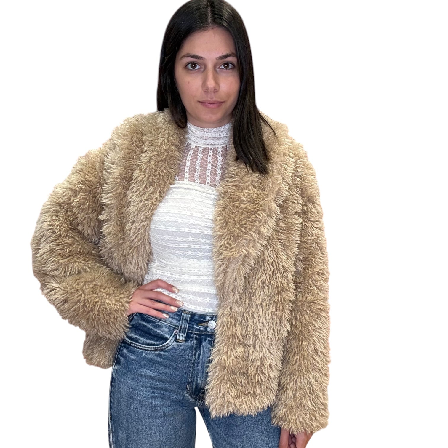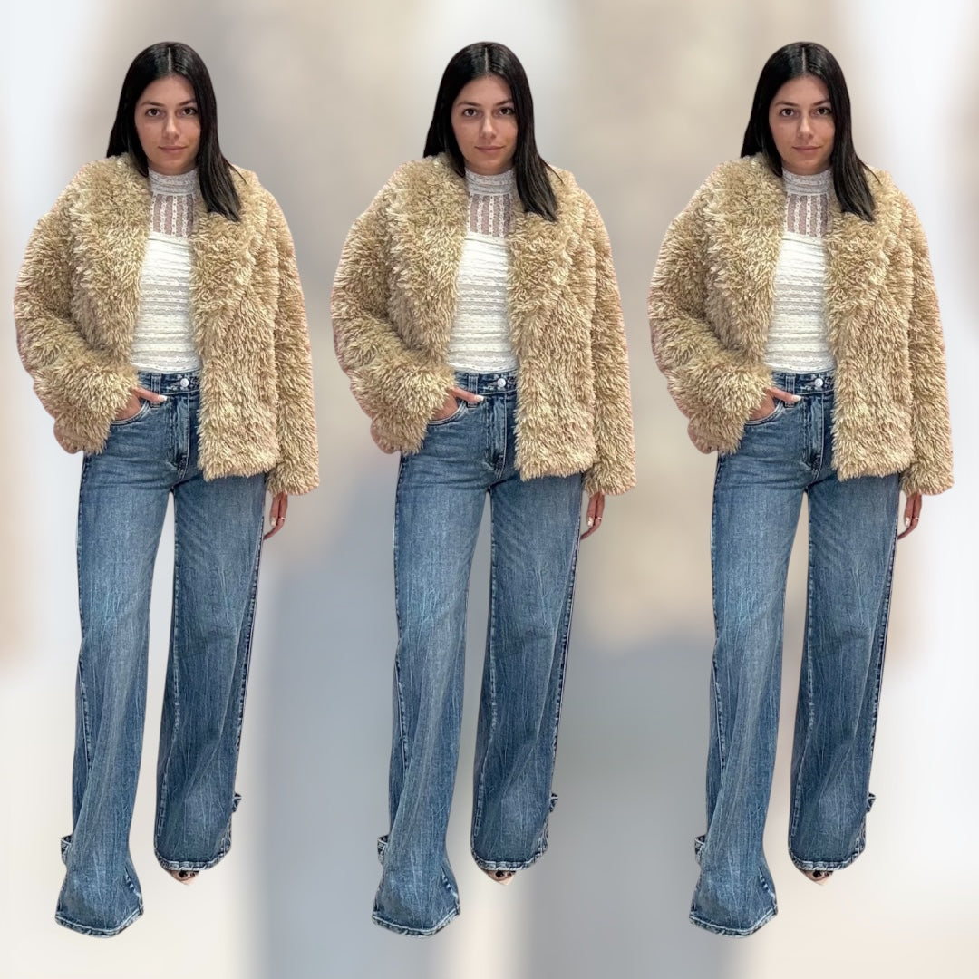So plush, so cozy 🤍 This faux fur jacket features an oversized shawl collar, side pockets, and hook closure for easy layering.