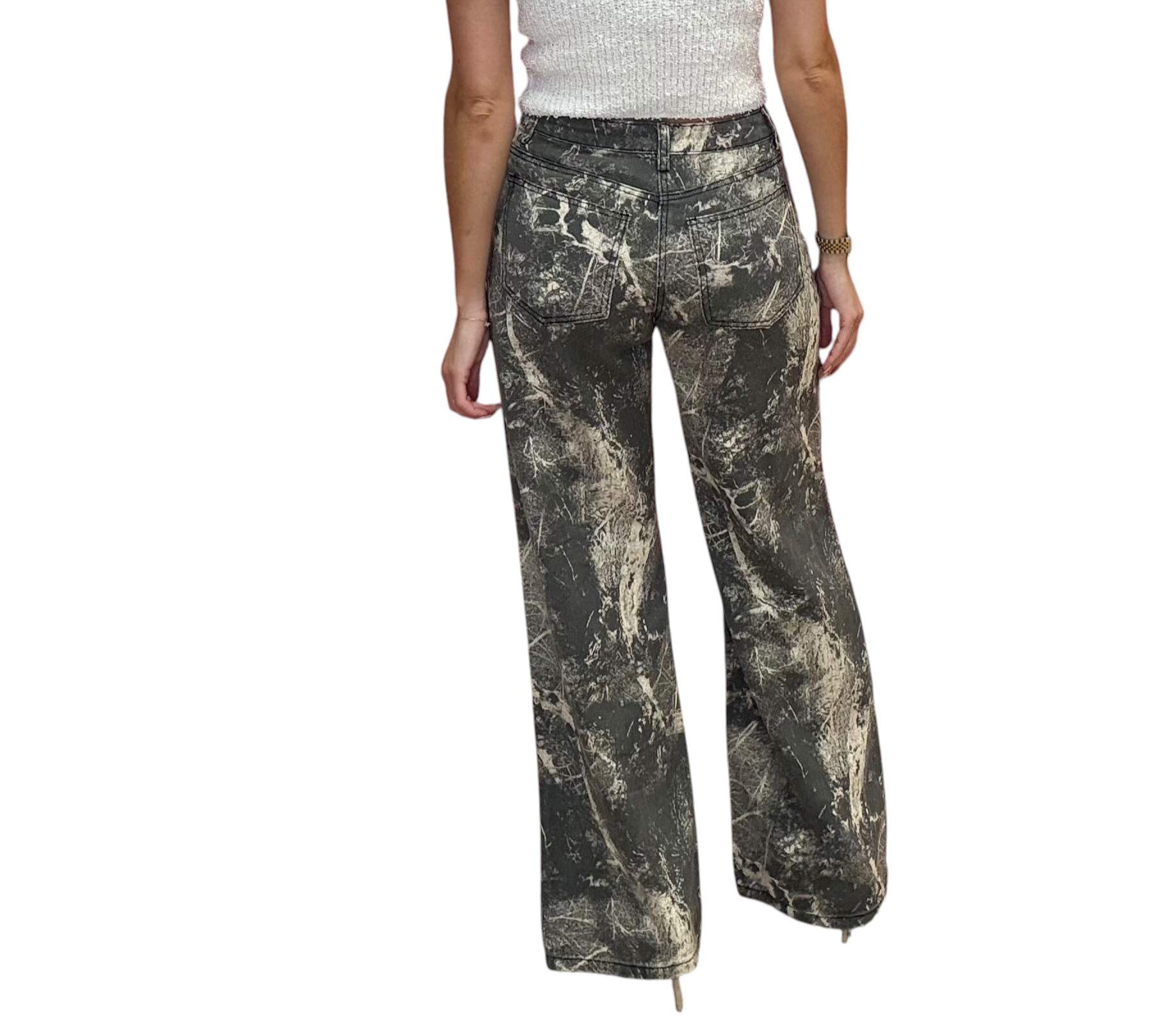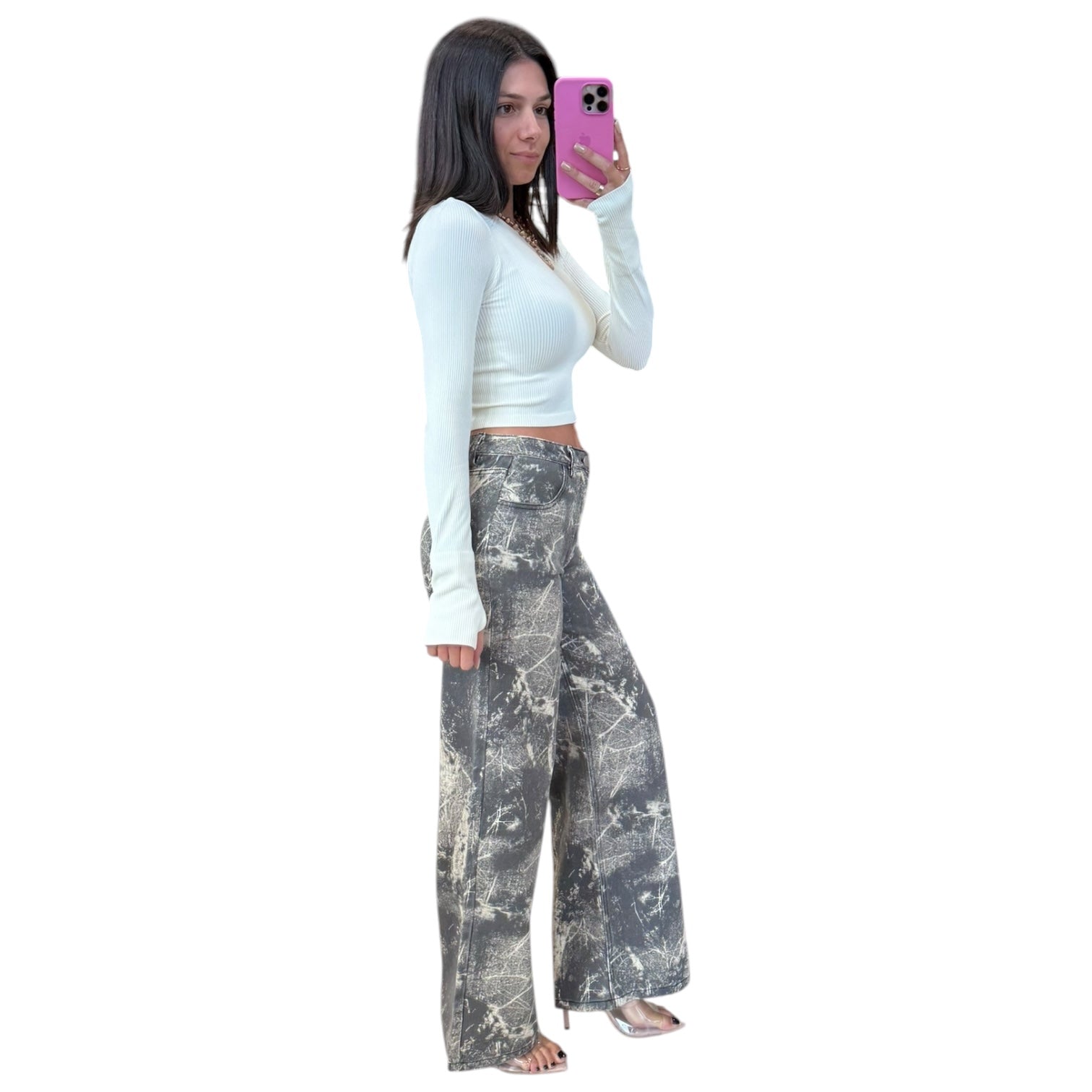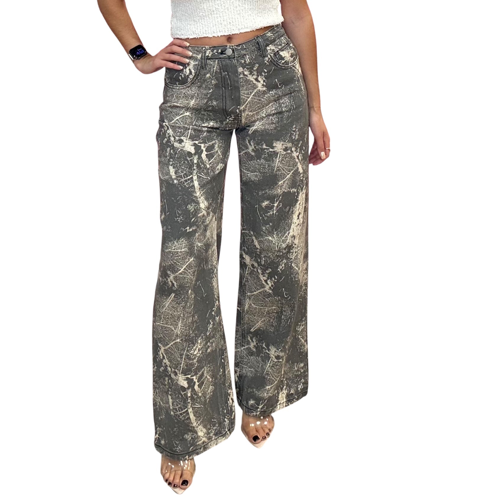 Make an edgy entrance with these wide-leg jeans featuring an all-over distressed splatter print. A stone and grey color palette meets street-style silhouette—these pants bring full attitude. Mid-rise, relaxed fit, and so on-trend.