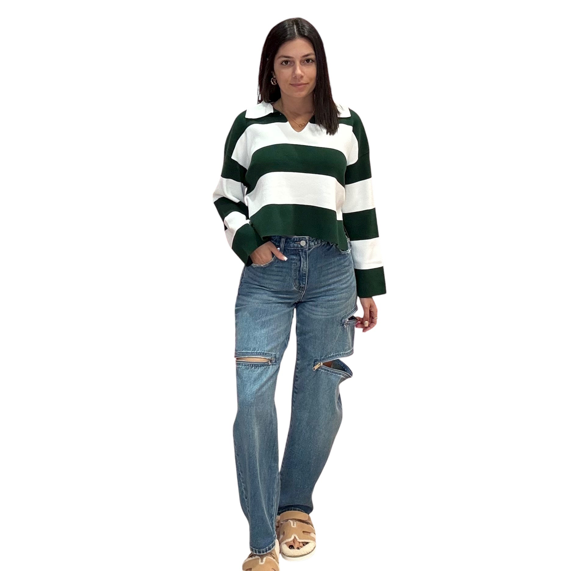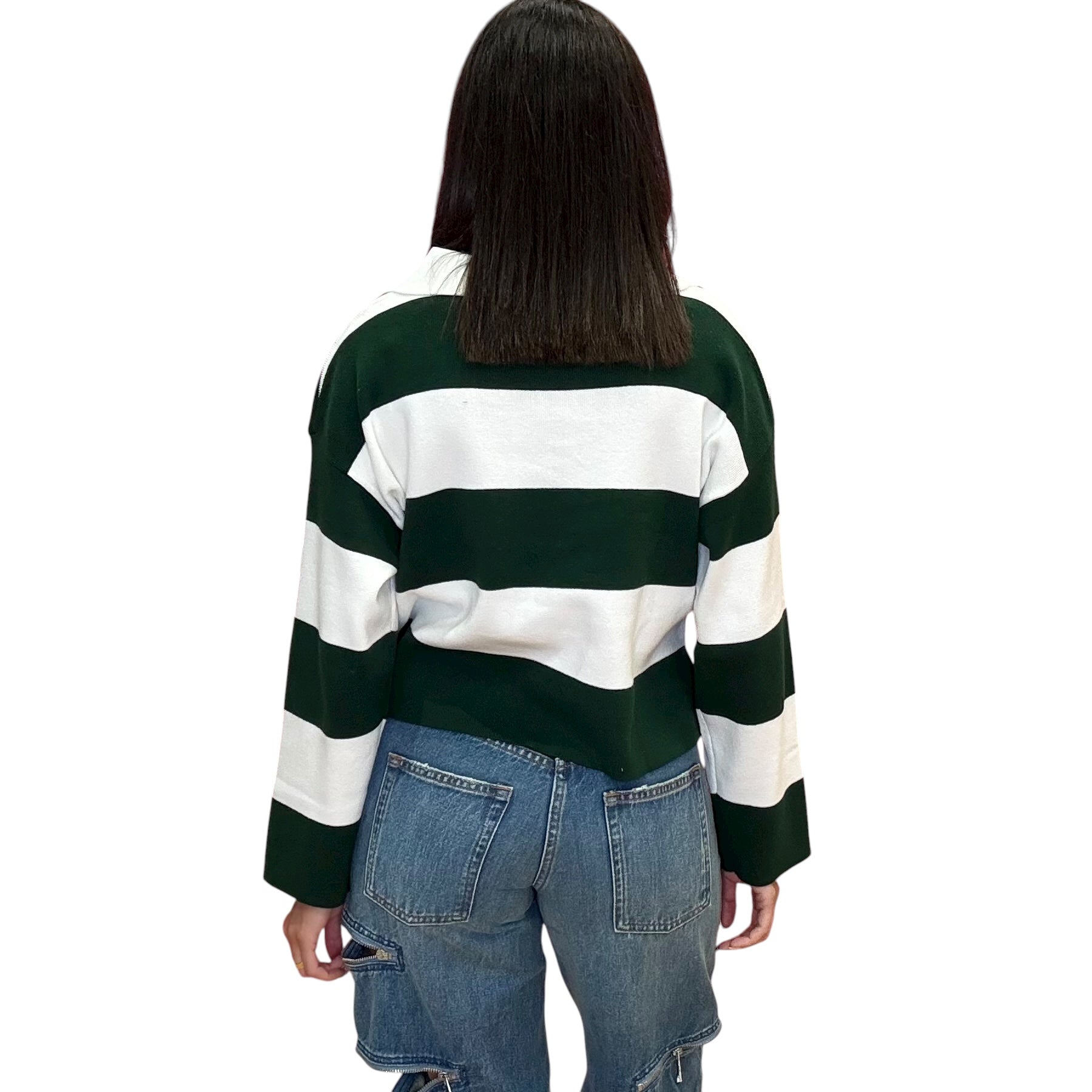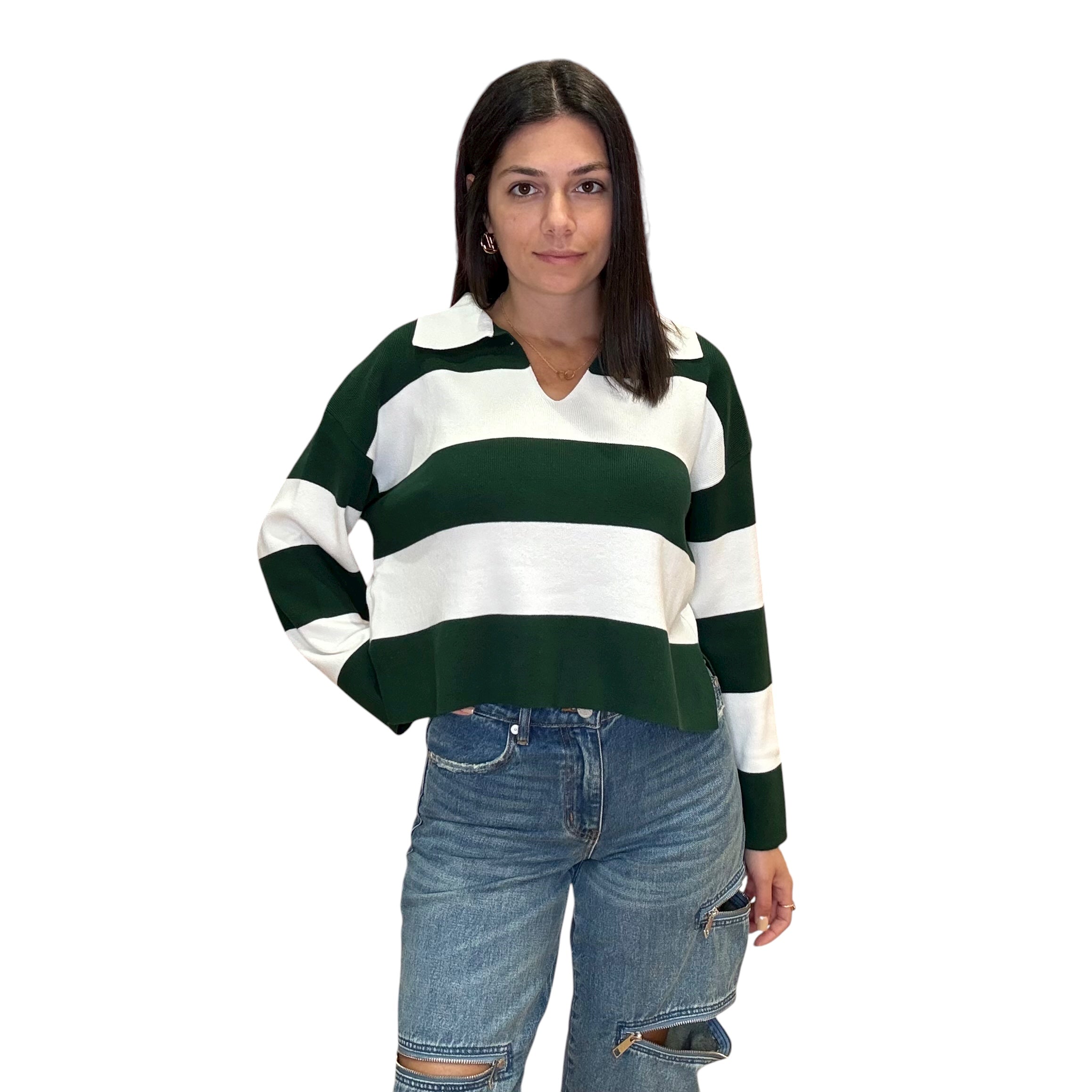 Meet your fall staple: the Kelly Green Stripe Rugby Top. With its laid-back silhouette and V-cut neckline, it delivers weekend ease with varsity edge.