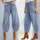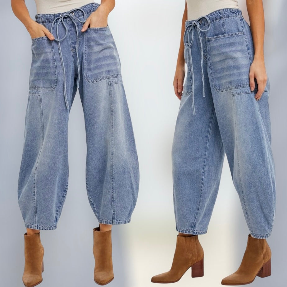Relaxed with a modern edge 👖 These mid-waist barrel jeans feature an adjustable drawstring waist and an easy, laid-back silhouette. The light wash makes them perfect for everyday wear while still feeling current and cool 🤍