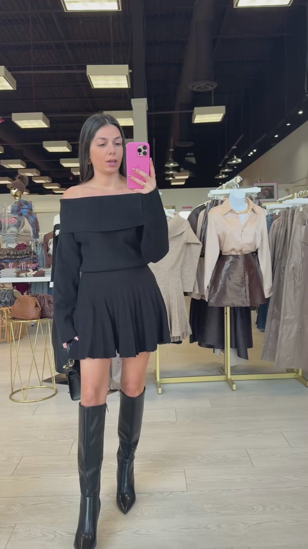 Flirty and fitted with a feminine twist. This ribbed knit mini features an off-shoulder neckline, snug waist, and soft pleated skirt for that perfect hourglass shape. A must-have piece for any night you want to feel effortlessly put together.