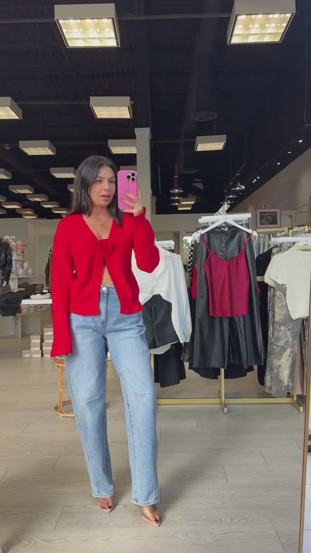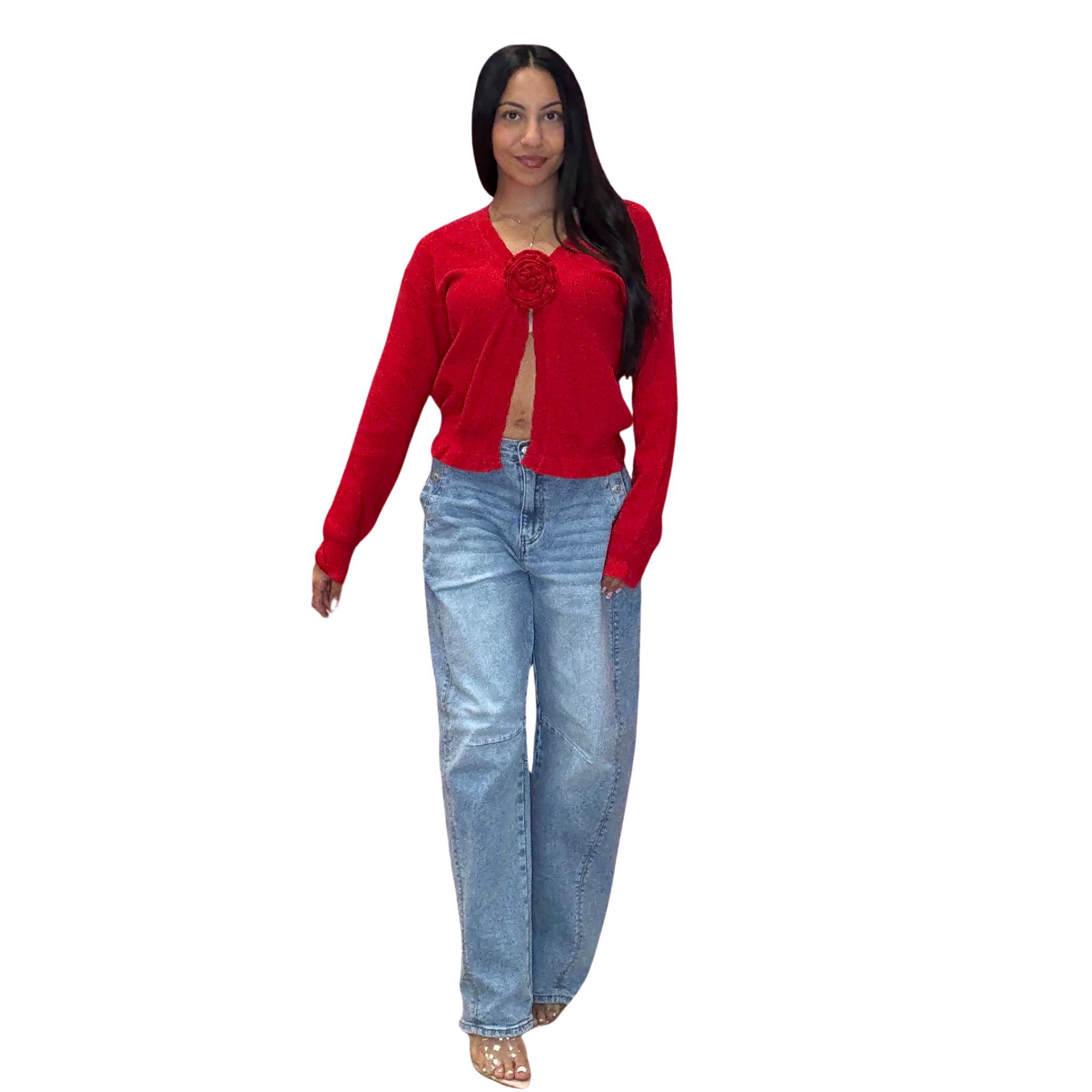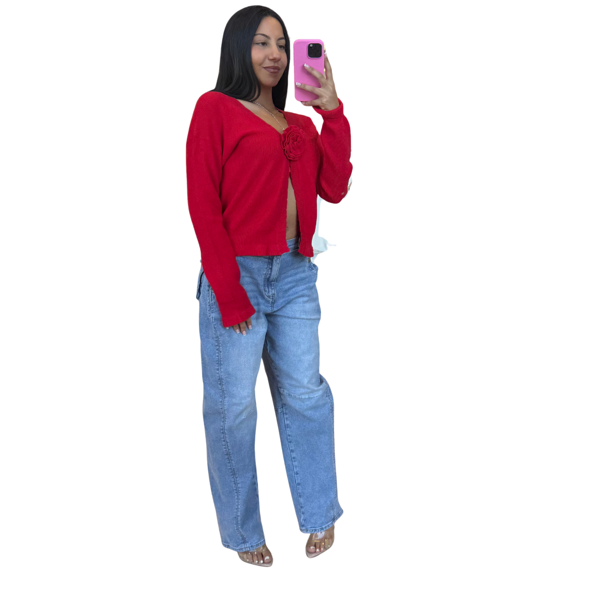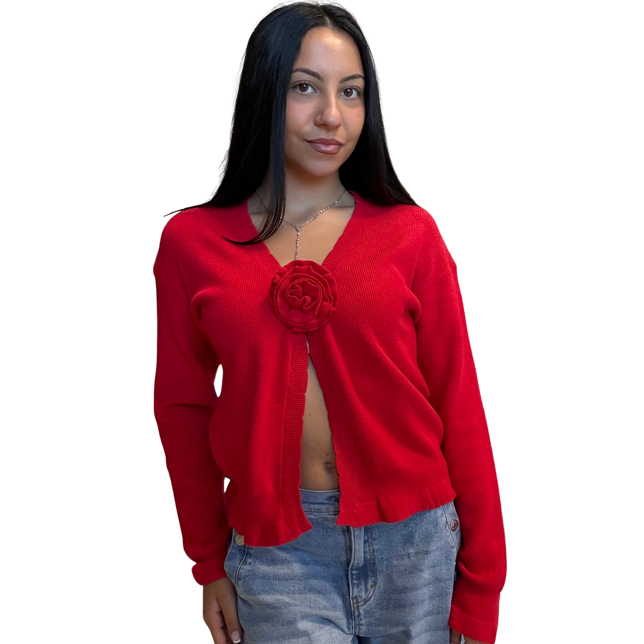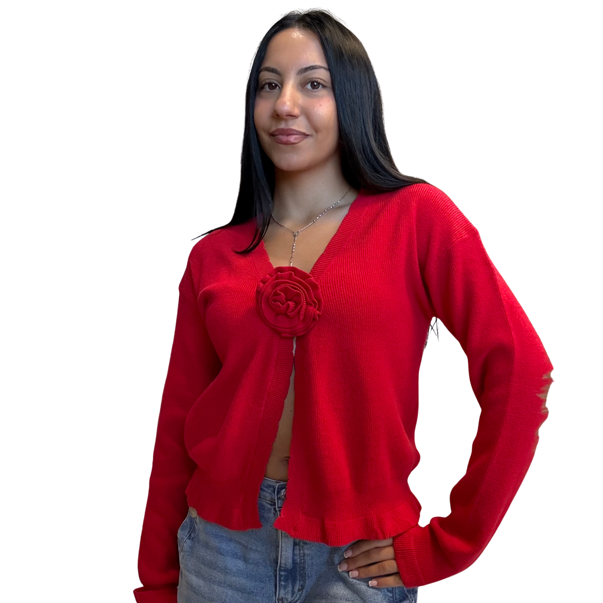 A dreamy knit layer with a statement twist. This open-front cardigan stuns with a deep V-neckline, soft knit texture, and detachable 3D rosette brooch 🌹. Finished with subtle ruffle trim, it’s feminine, versatile, and perfect for layering all year round.