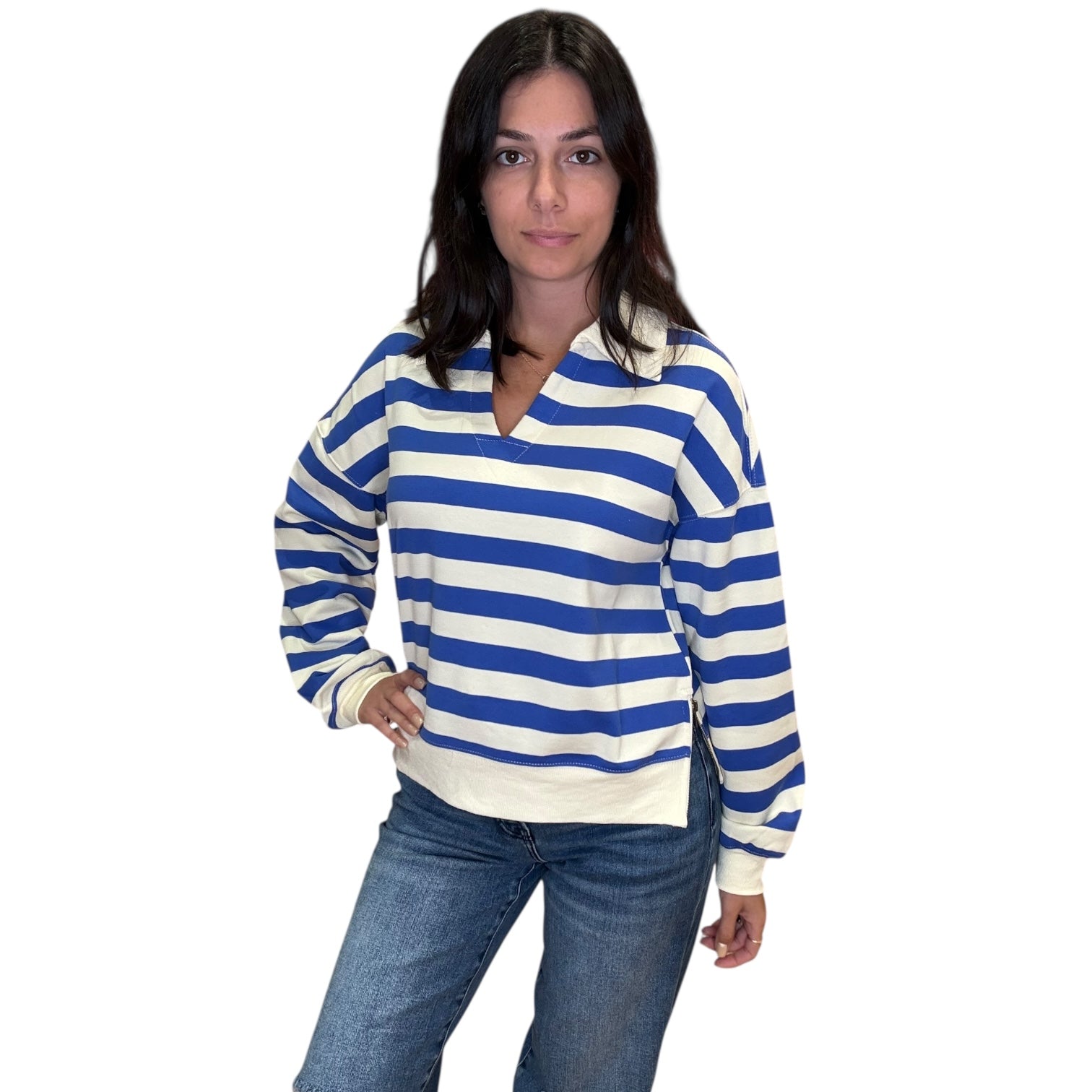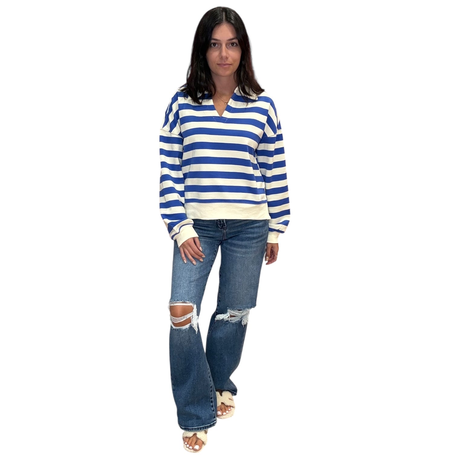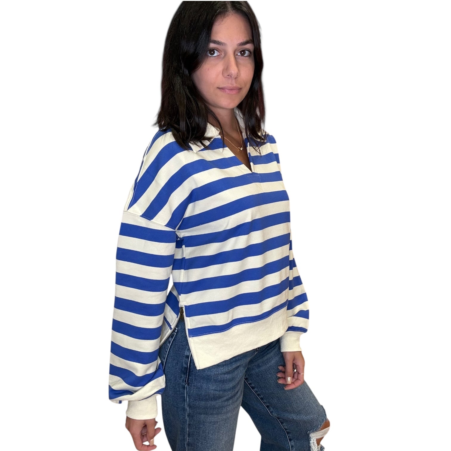 Fresh, playful, and ready for anything. This collared terry knit top features bold blue and lavender-striped detailing, with a V-neckline and side zipper accents. It’s the preppy-cool piece you’ll want on repeat.