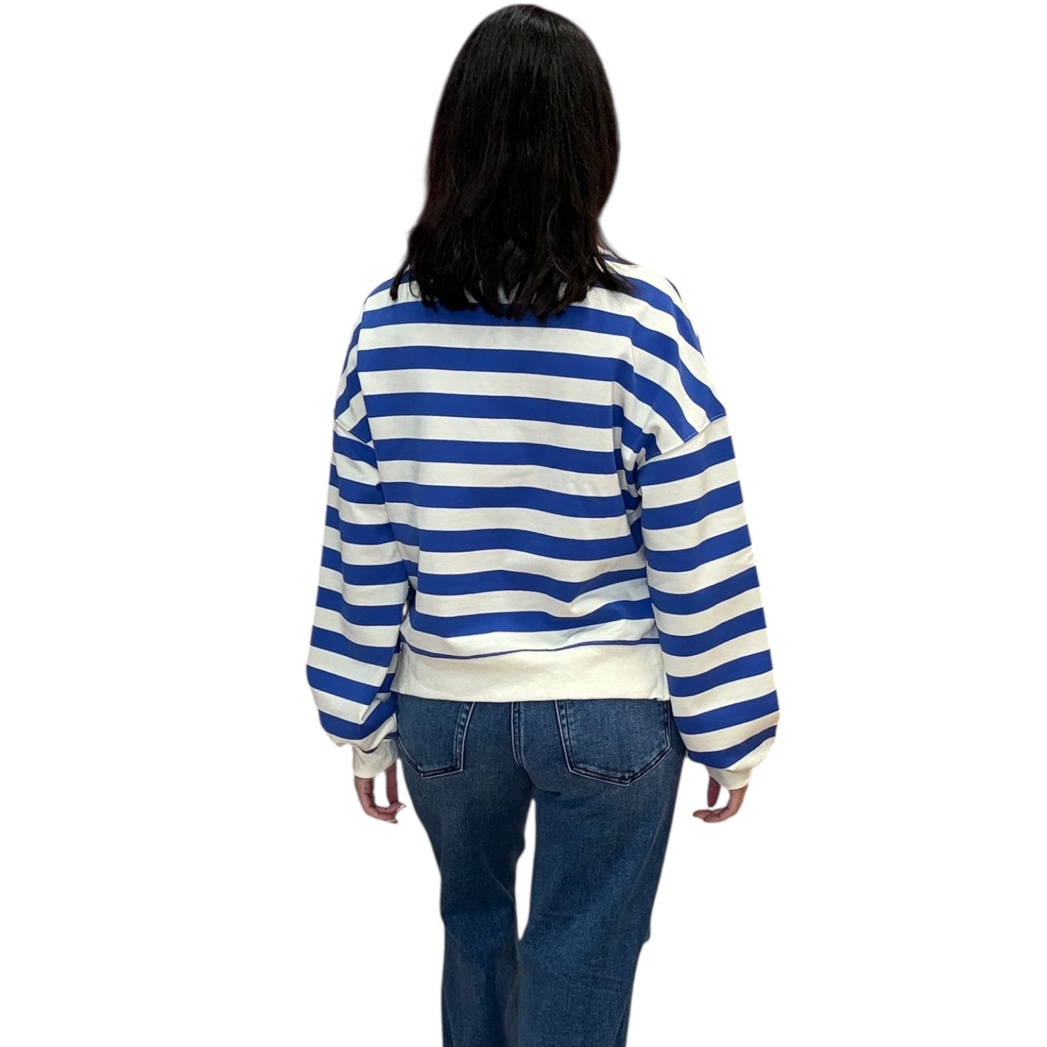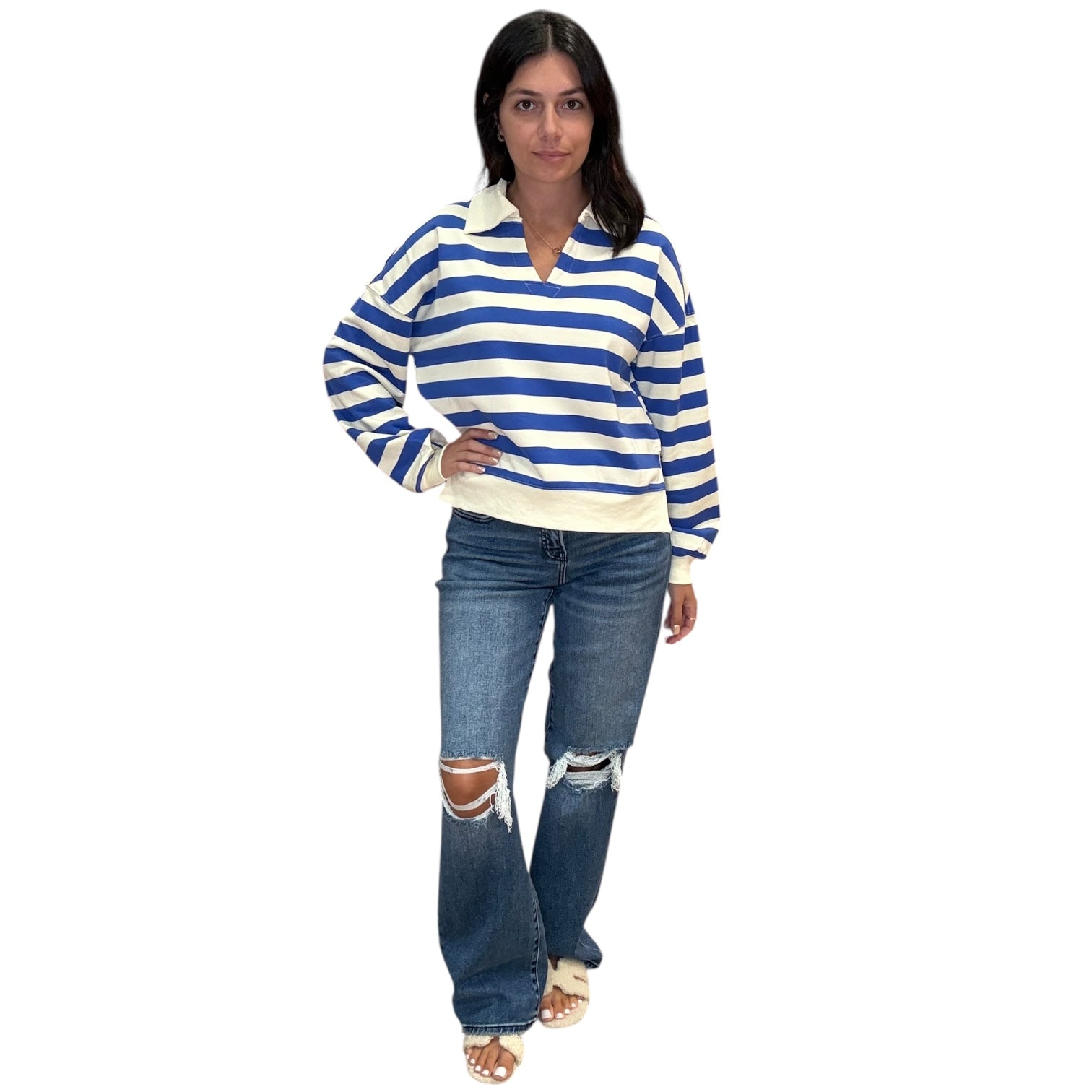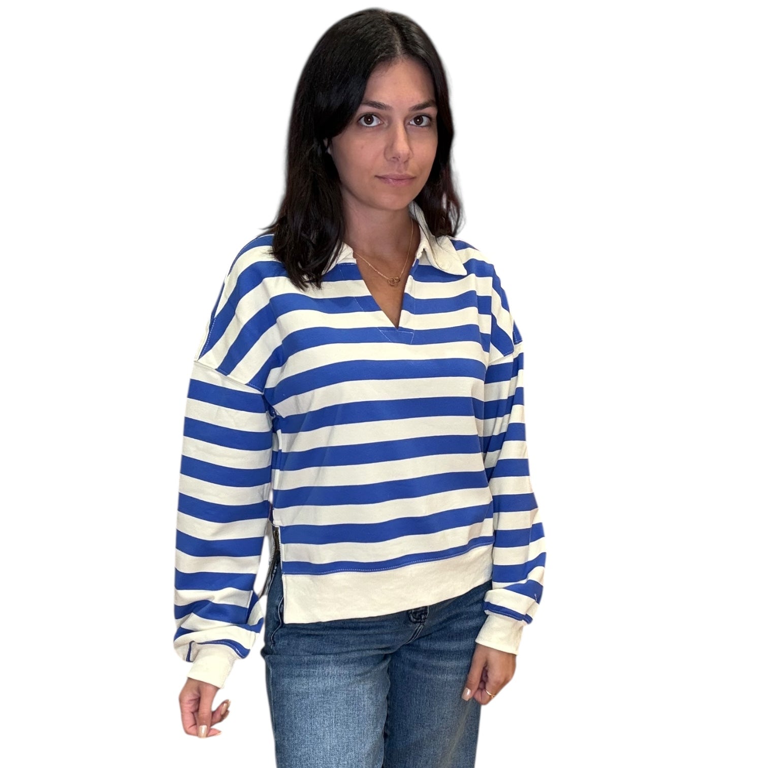 Fresh, playful, and ready for anything. This collared terry knit top features bold blue and lavender-striped detailing, with a V-neckline and side zipper accents. It’s the preppy-cool piece you’ll want on repeat.