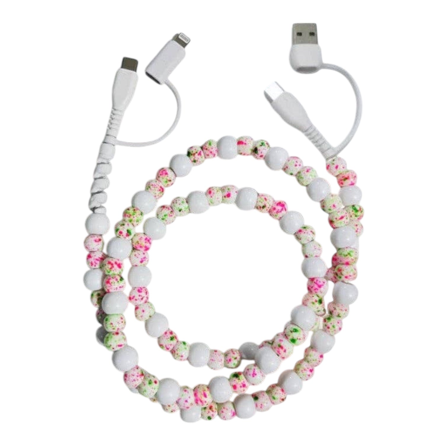 Your charger just got a glow up ✨ This white beaded phone cord is finished with playful pink and green confetti accents, turning an everyday essential into a fun little statement. Functional, durable, and way cuter than the basic cords in your bag — this one was made to be seen. Toss it in your tote, keep it in the car, or let it peek out on your desk.