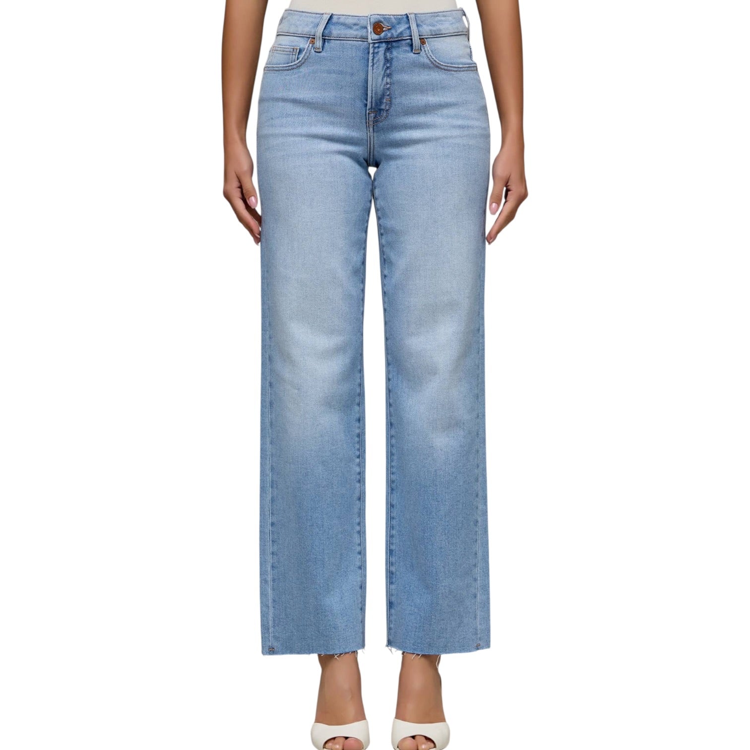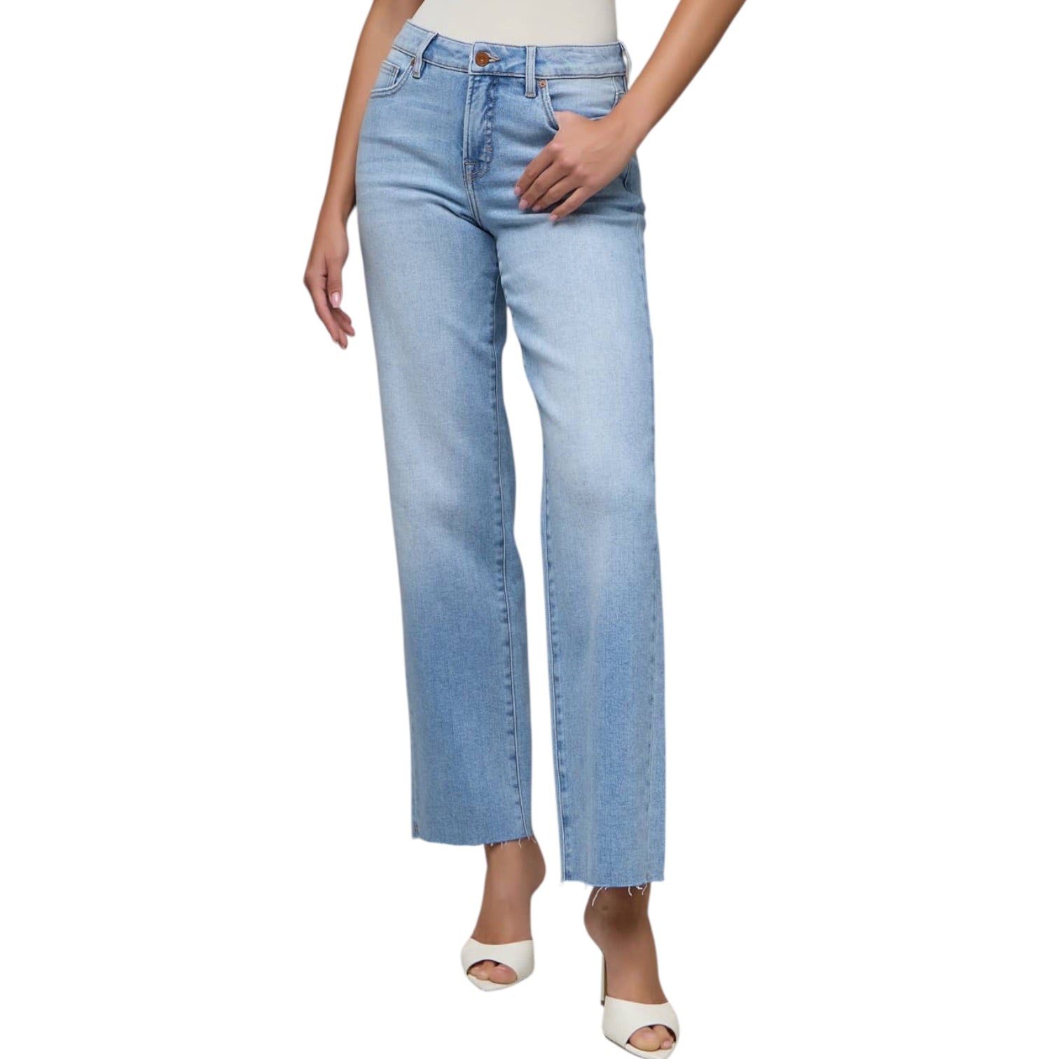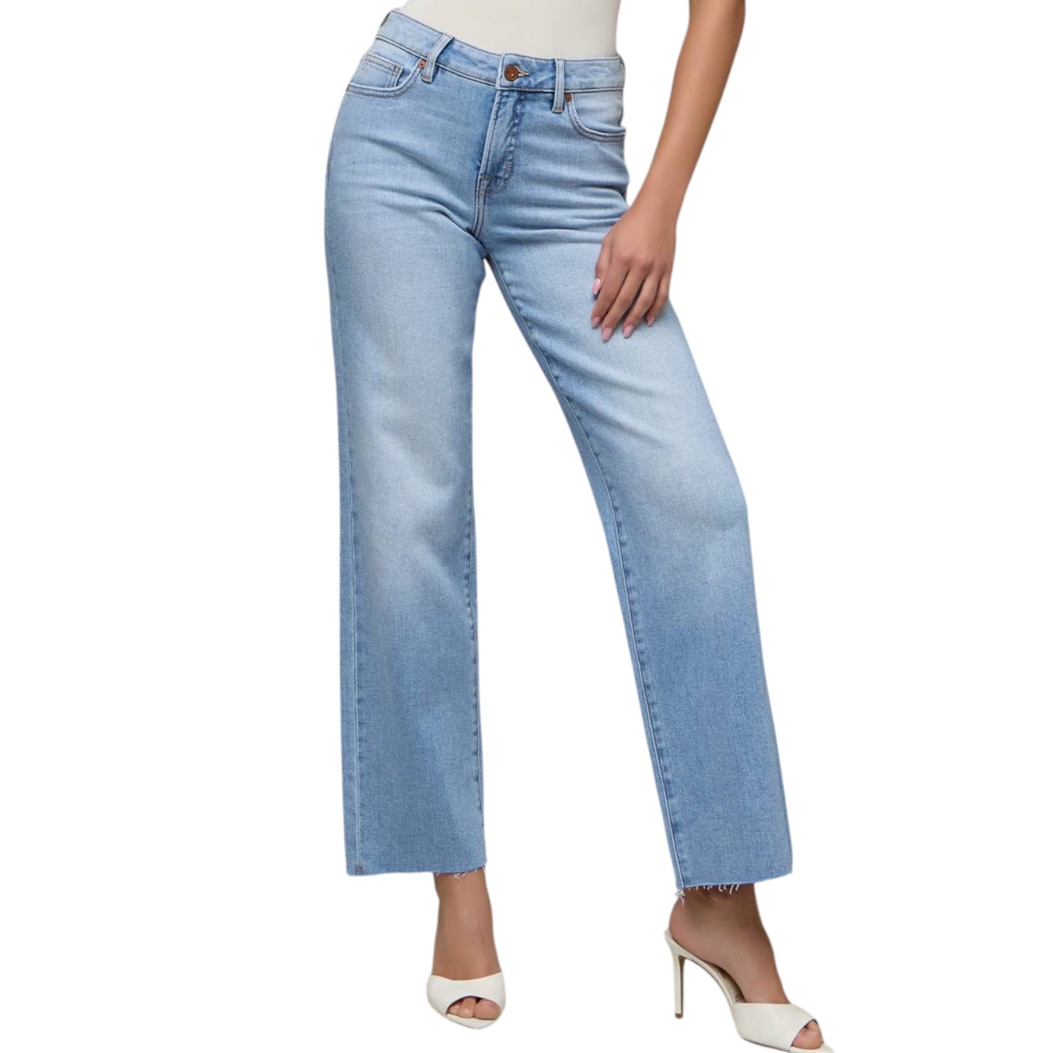A flattering straight-leg jean with comfortable stretch and a clean finish. Designed with a mid rise and a 31” inseam, this medium-light wash style is easy to dress up or down.