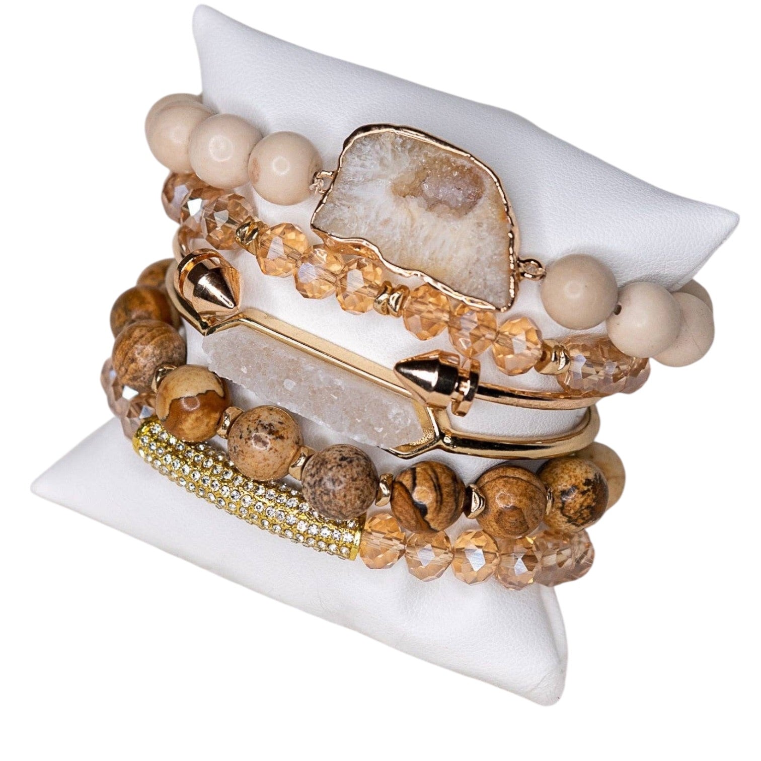 Earthy jasper tones paired with gold bangles create a grounded yet polished wrist stack. Includes four beaded stretch bracelets and two adjustable gold bangles for that layered boutique look. Stretch diameter approx. 3”.
