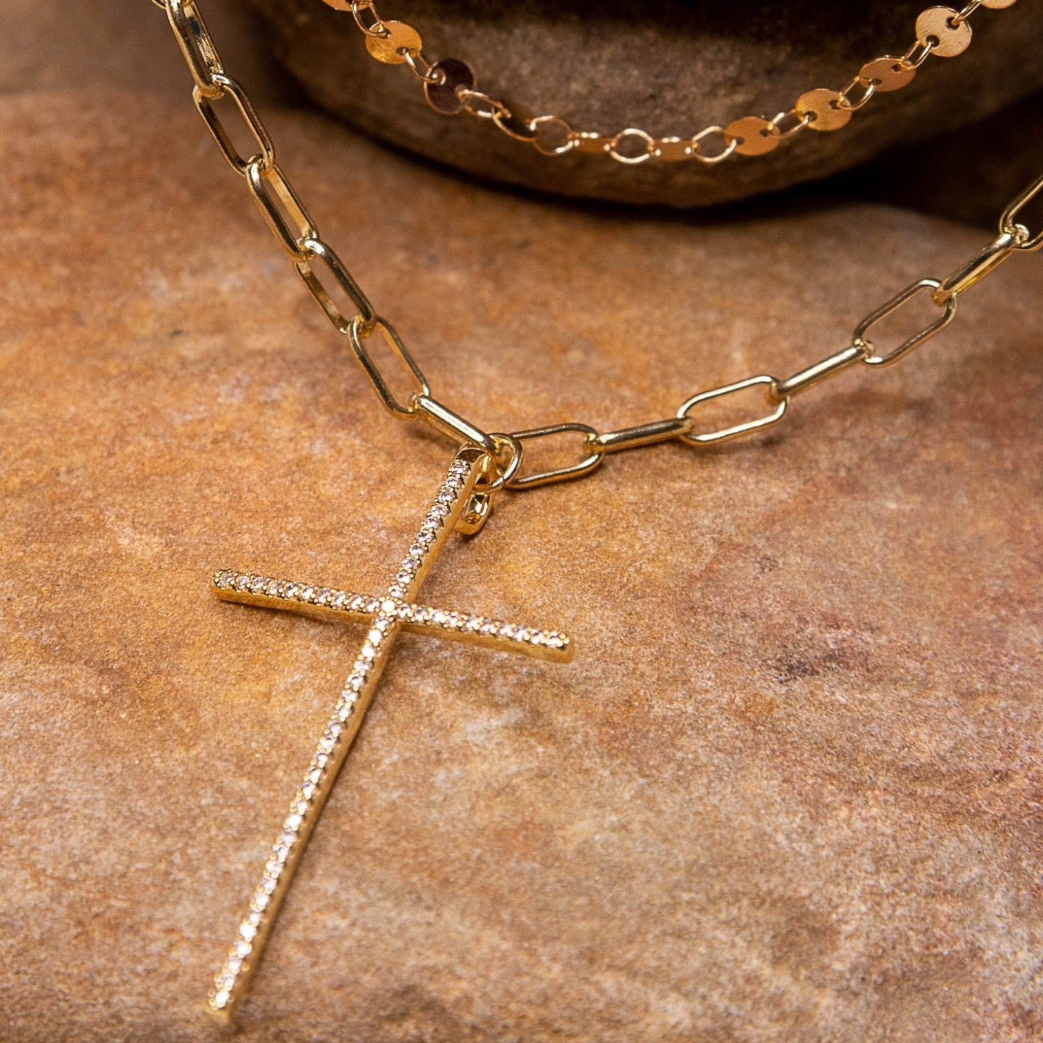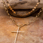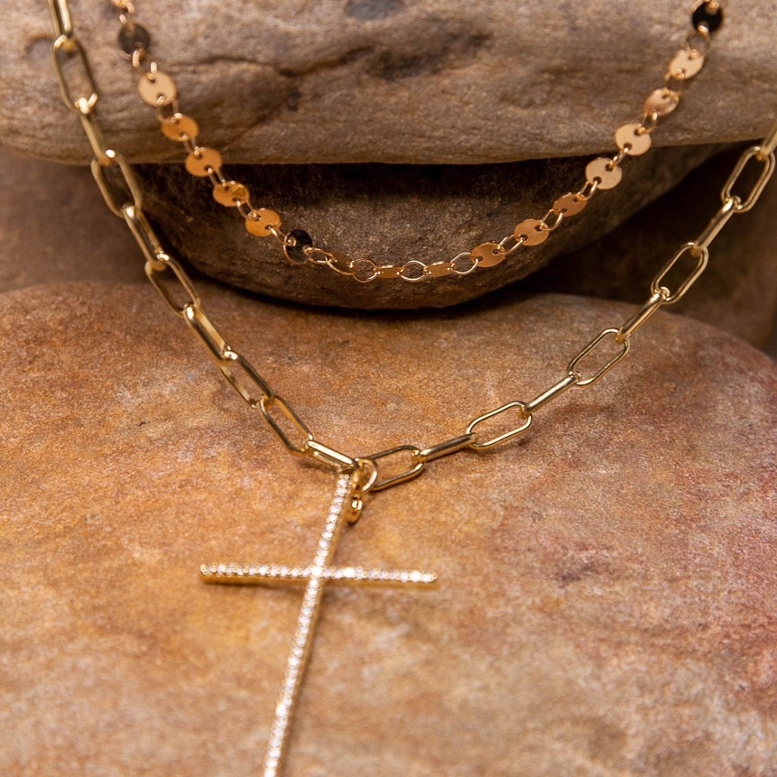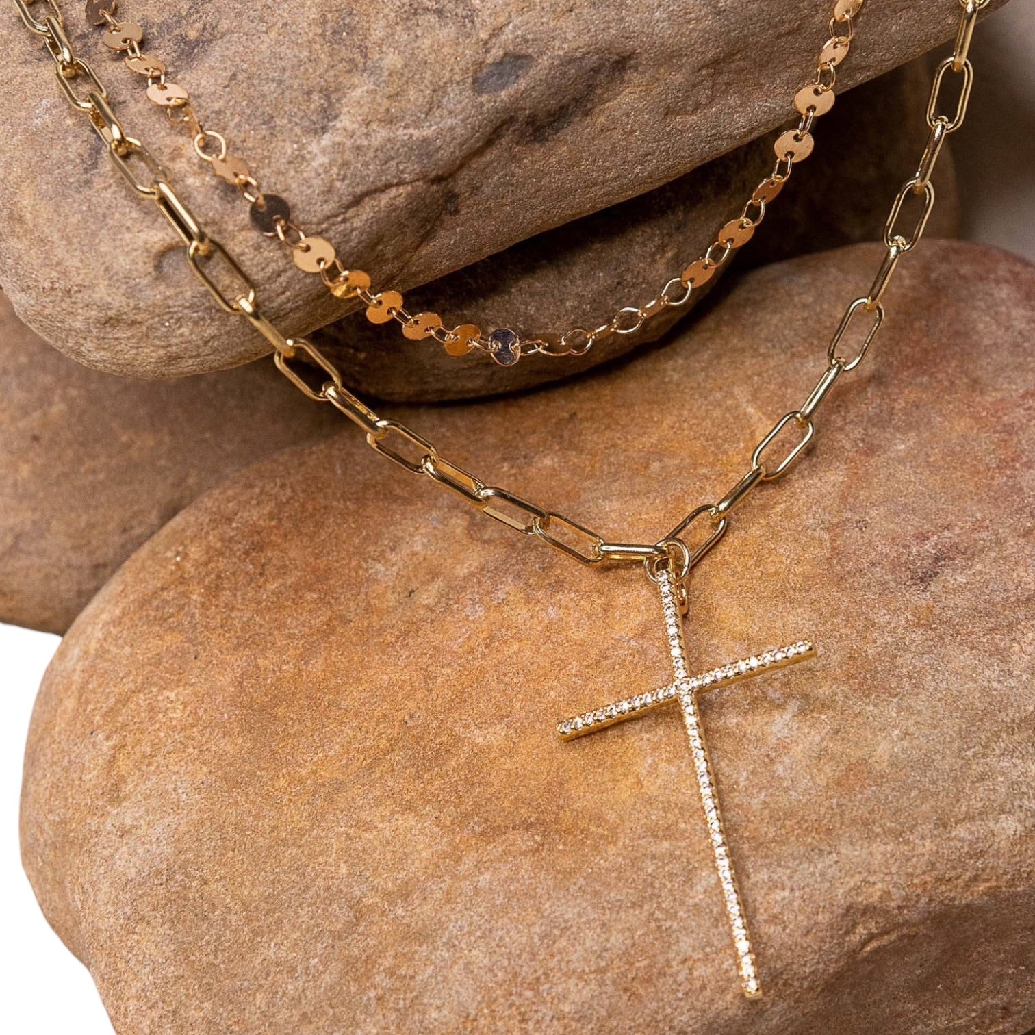 A double-layer gold necklace designed to do the layering for you. One chain features a sleek disc detail, while the second layer showcases a rhinestone cross pendant for a subtle sparkle. Finished with a lobster clasp and 2” extender for adjustable length.