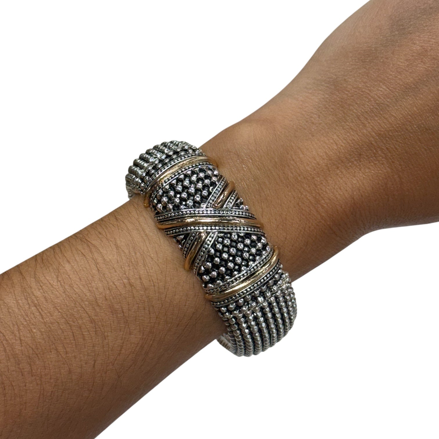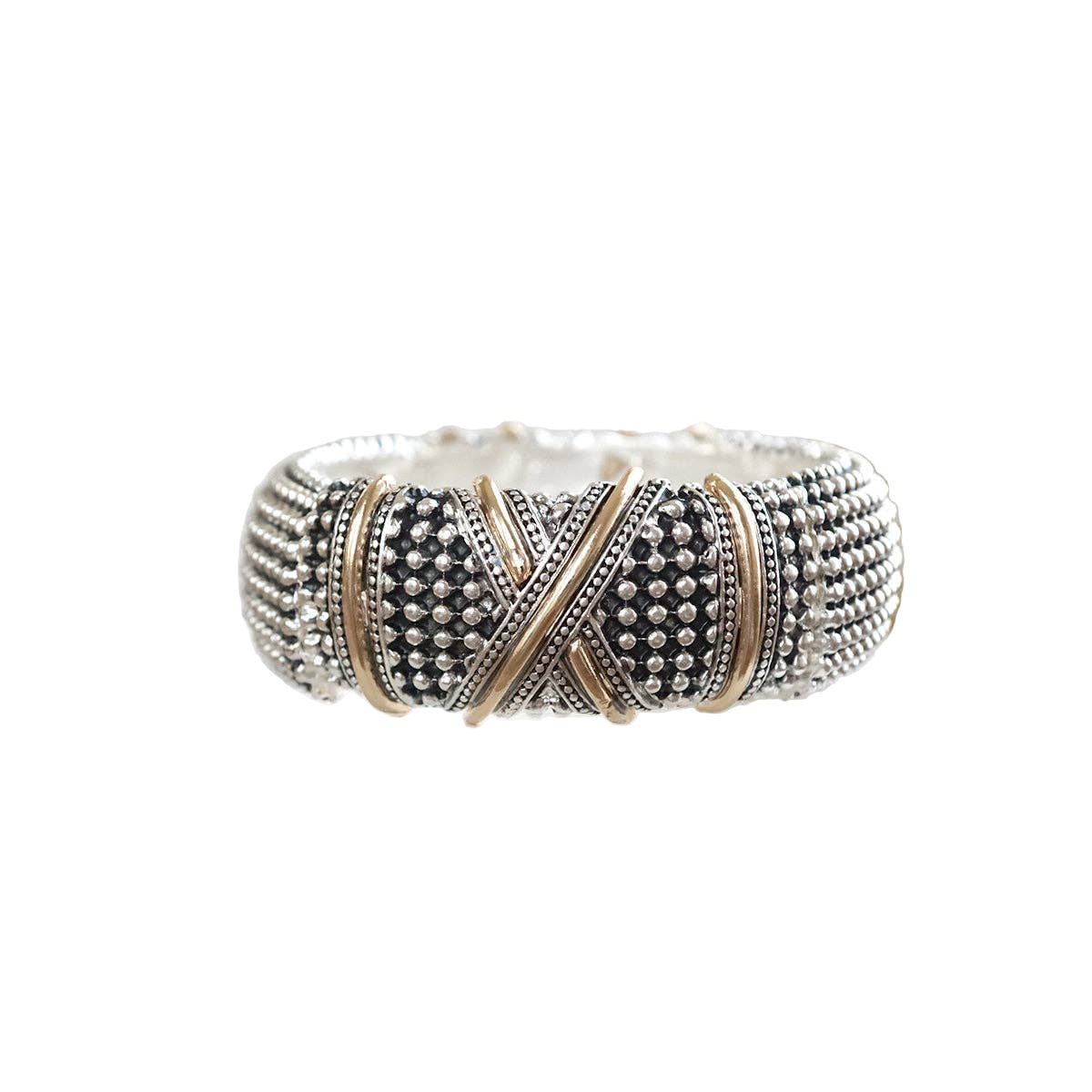 Bold meets boho, wide stretch bangle with chic X detail and two-tone shine. Designed to slip on with ease, these statement cuffs bring edge to every outfit.