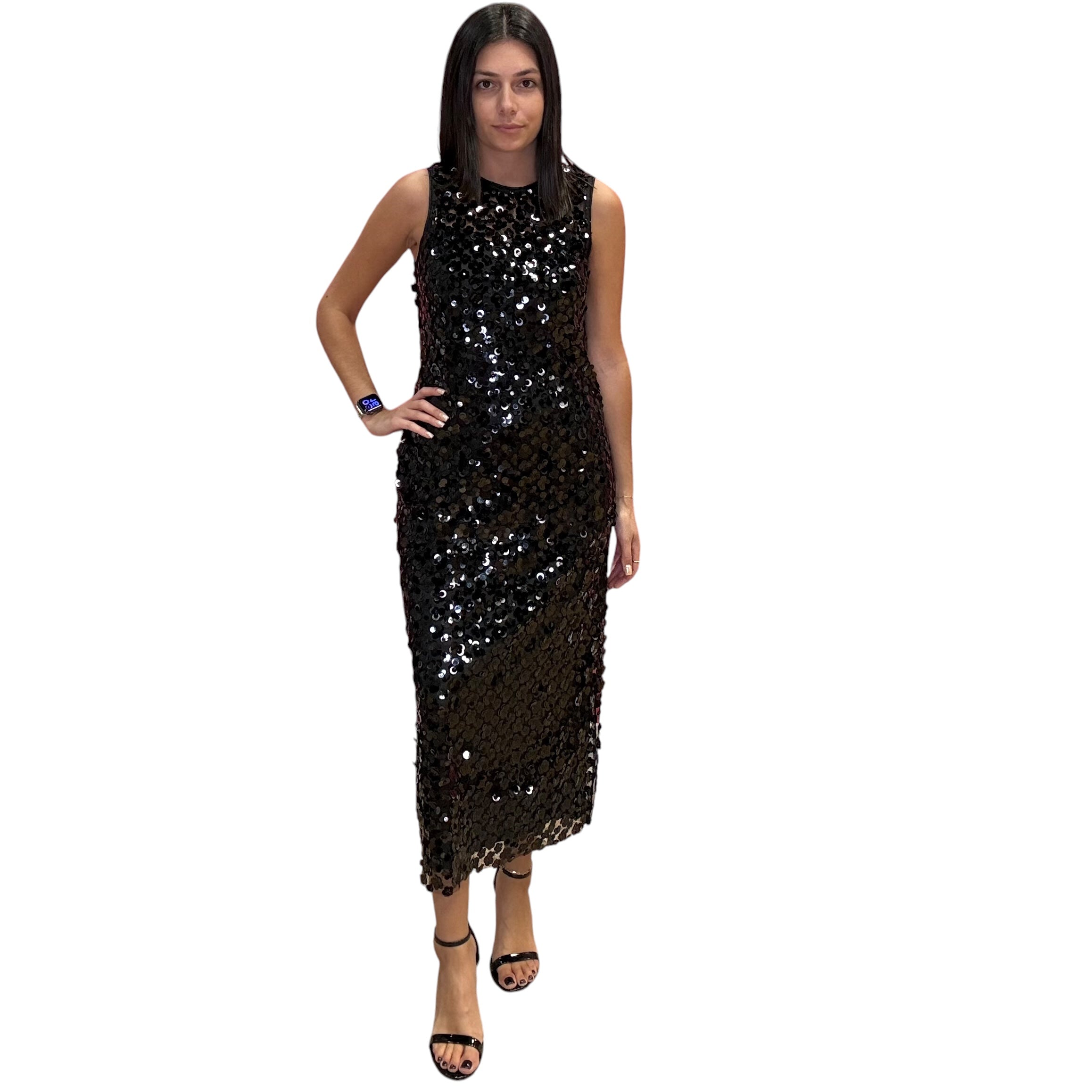 Turn heads in this show-stopping black midi dress, designed with shimmering sequin embellishments over a sheer mesh overlay. The sleek sleeveless cut and straight silhouette keep it chic, while the fully lined interior ensures a flawless fit. Finished with an invisible back zipper for that seamless look.