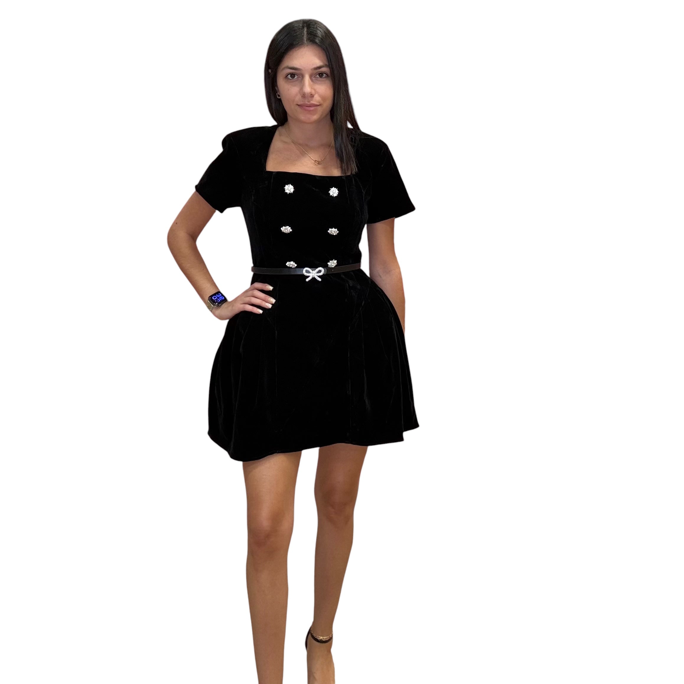Classic meets sultry in this luxe velvet mini dress. Featuring a structured square neckline, jeweled button accents, and a chic removable bow-buckle belt, it’s the little black dress you’ll keep reaching for. The pleated skirt adds movement, while the fully lined design with an invisible back zipper keeps it effortlessly polished.